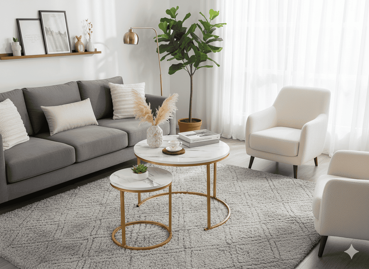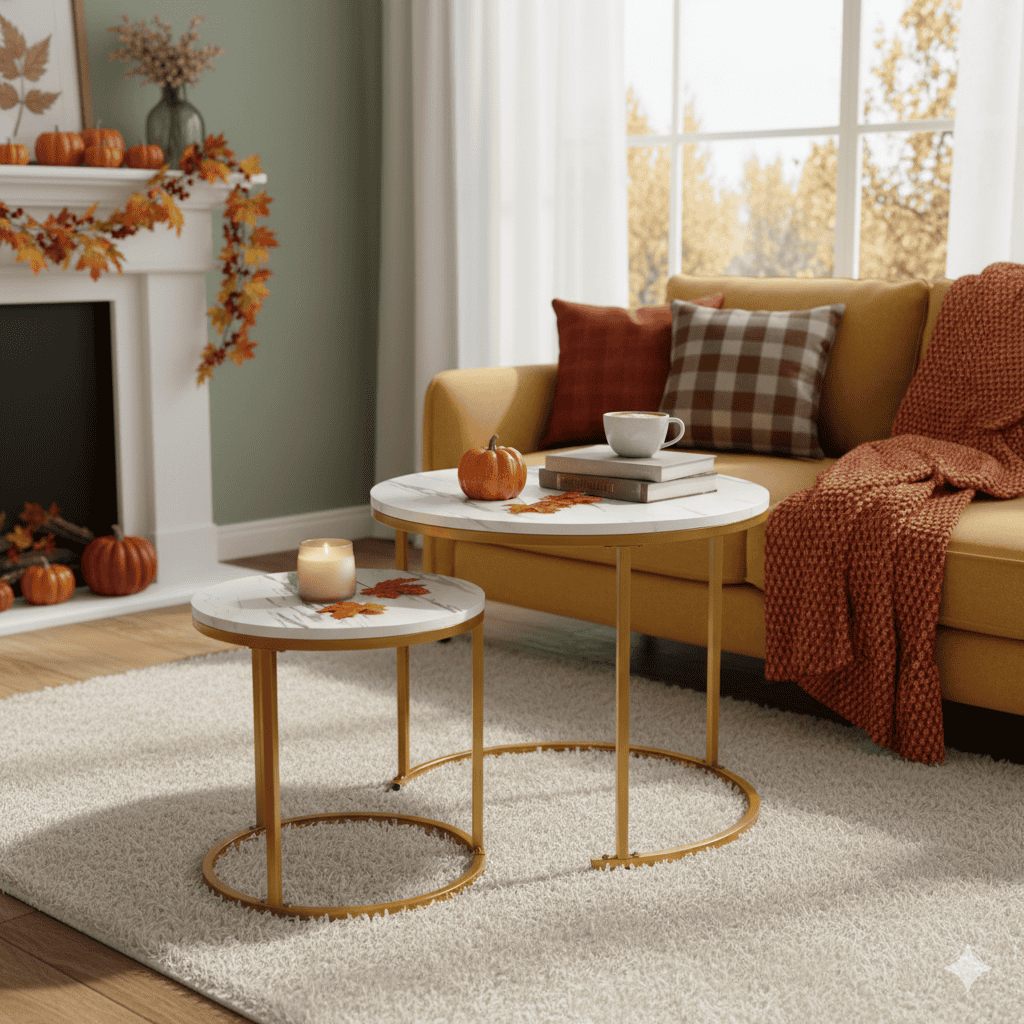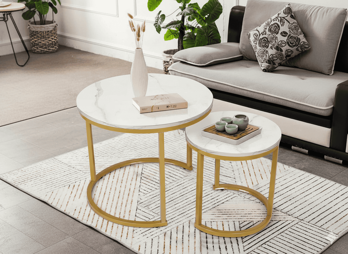 Set 2 masute cafea suprapozabile, MDF si metal, 60×50 cm si 40×40 cm, alb marmura si auriu Mob360
