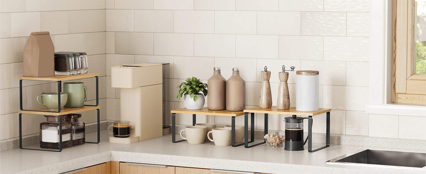 Pastrati elementele esentiale de gatit, cum ar fi borcanele de condimente, recipientele, conservele, tacamurile si cartile de bucate organizate, usor de vazut si rapid de gasit cu aceste organizatoare de bucatarie.Fabricat din lemn de inalta calitate si metal, fiecare raft de condimente poate sustine o greutate maxima de 15 kg, astfel incat puteti stoca o multime de provizii pe ele.Cu designul lor unic, aceste organizatoare de rafturi pot fi stivuite unul peste altul, imbinate, folosite separat sau chiar in forma de L.