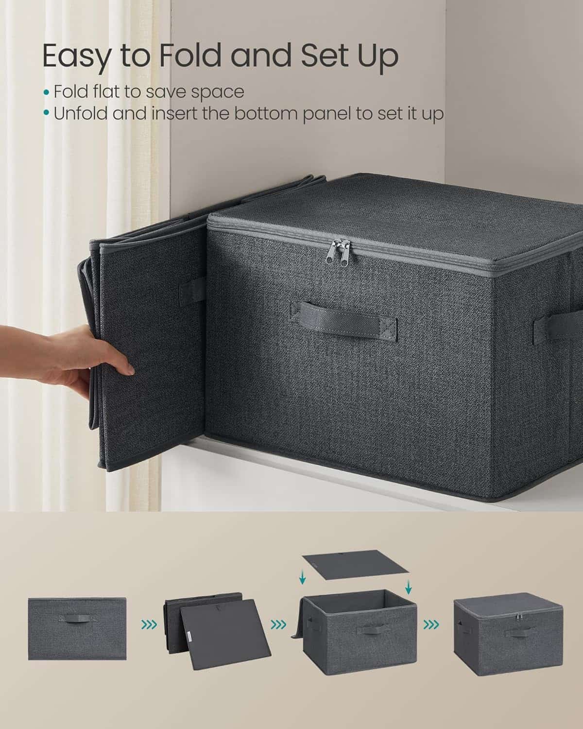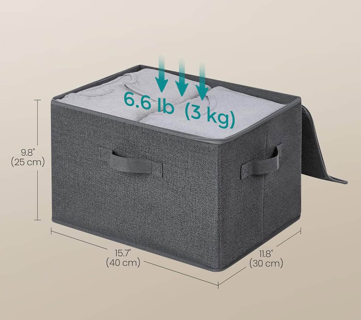 Specificatii: Culoare: Gri cu model de lenjerie Material: carton gros de 2 mm, 80 g/㎡ tesatura netesuta Dimensiunea produsului: 40 x 30 x 25 cm (L x l x i) Max. Capacitatea de incarcare statica a fiecarei cutii: 3 kg Despre acest articol In loc sa ingramaditi haine care se pot prabusi in secunda urmatoare sau sa irositi spatiu pe podea cu articole libere, organizati toate lucrurile – de la bluze de trening la scutece – cu acest set de 3 cutii de depozitare.Trebuie sa impachetati hainele de vara pana anul viitor? Capacele acestor cutii care se deschid cu fermoar pe trei parti le vor pastra fara praf pana cand le veti lua de pe rafturi, de deasupra dulapului sau de sub pat.Nu sunt doar niste recipiente in care sa arunci lucruri; materialul netesut cu model de in si nuanta de gri confera un aer potrivit si aerisit pentru a va complimenta casa.Trageti cosul de pe rafturi cu manerul din fata sau transportati-l din camera de zi in camera de joaca cu cele 2 manere laterale. Si mai bine? Cutia se pliaza intr-un minut pana data viitoare cand aveti nevoie de ea.