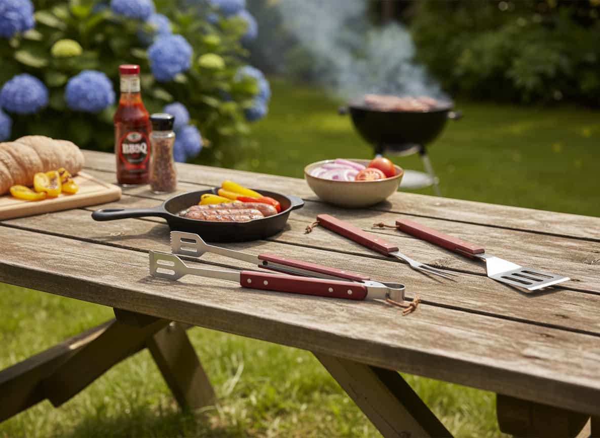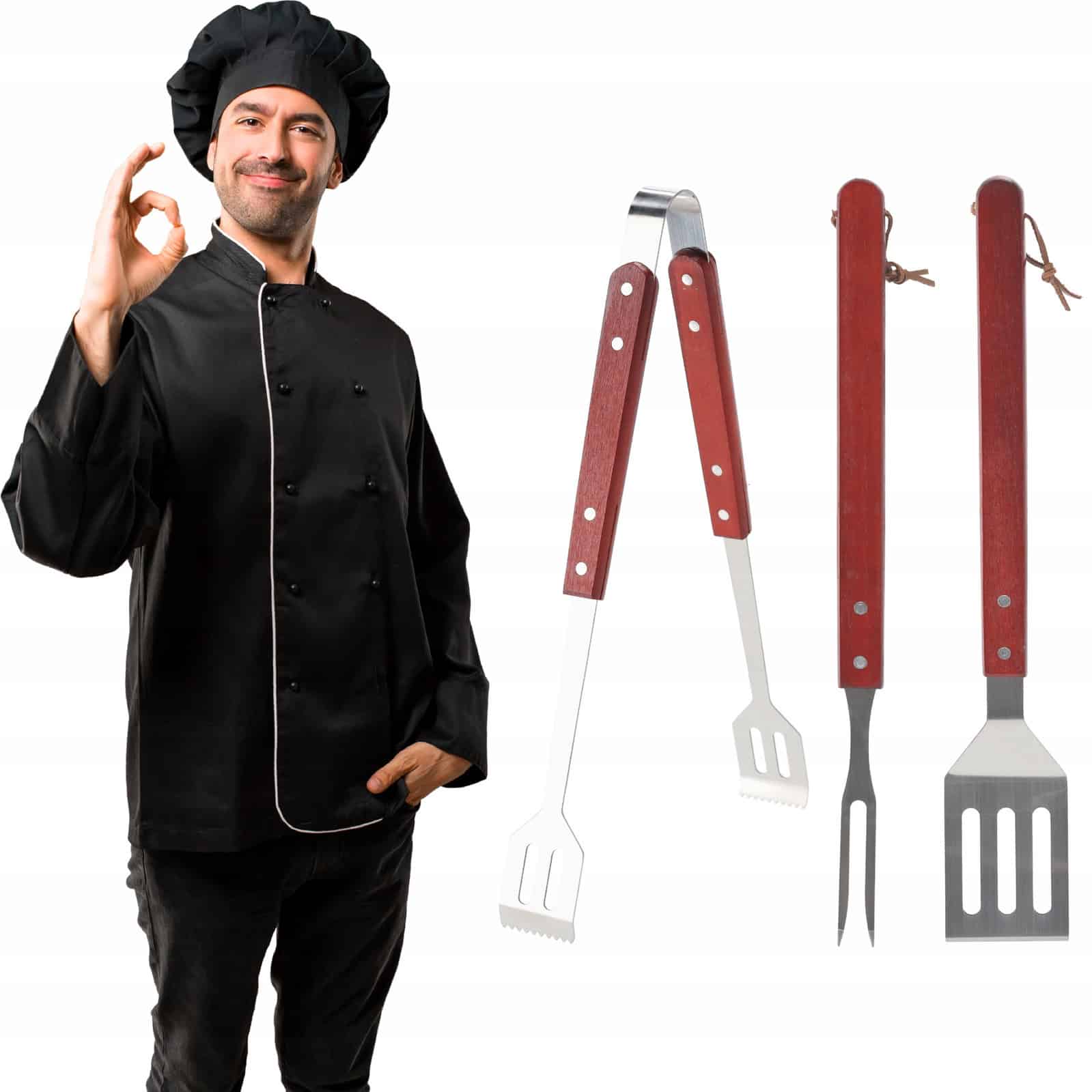 - Scurta descriere Setul de ustensile pentru gratar este ideal pentru prepararea alimentelor in aer liber. Fabricate din otel inoxidabil rezistent si prevazute cu manere ergonomice din lemn, ustensilele ofera siguranta, confort si control in timpul utilizarii. Setul include trei accesorii esentiale pentru gratar: spatula, furculita si cleste.