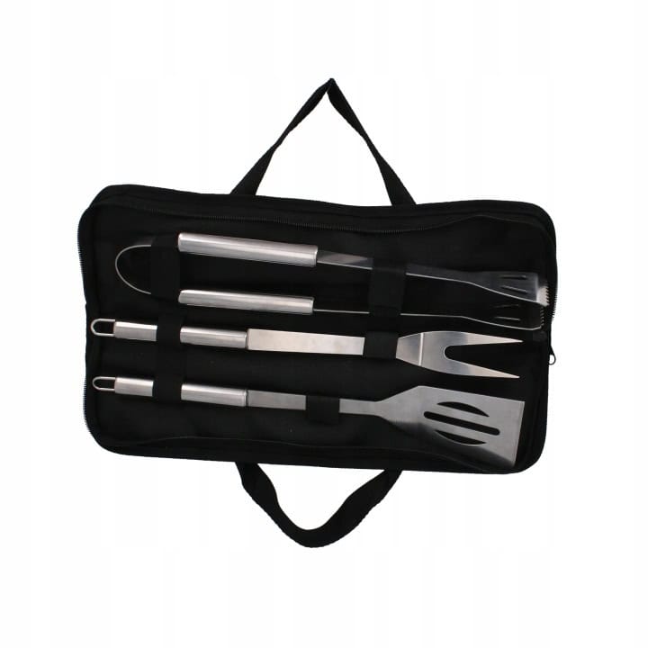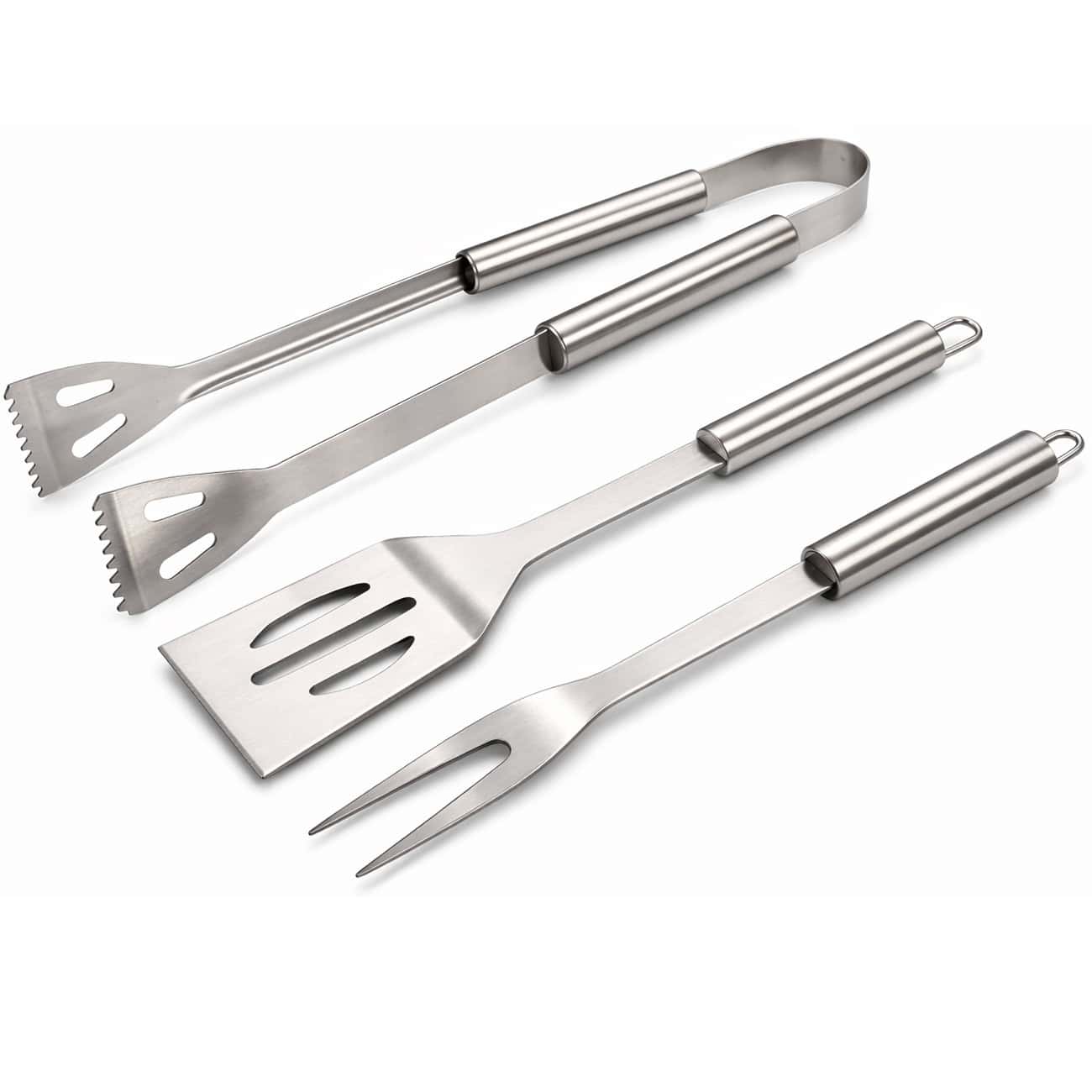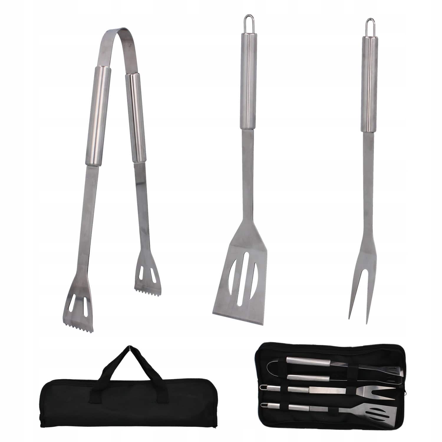 Set 3 ustensile pentru gratar din otel inoxidabil, spatula, furculita si cleste, cu husa Mob360