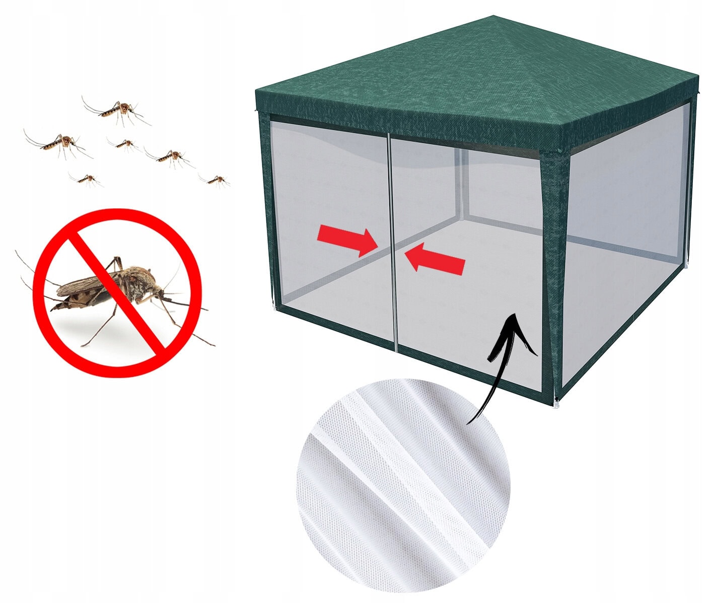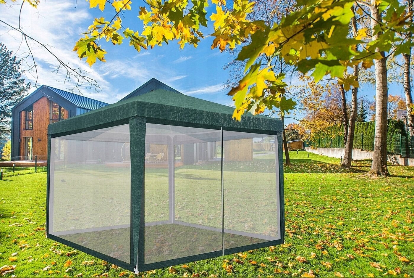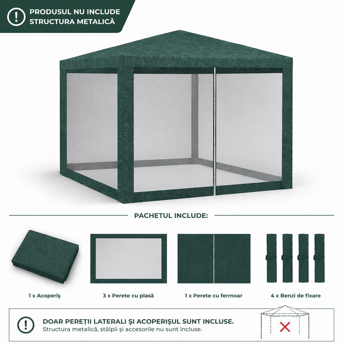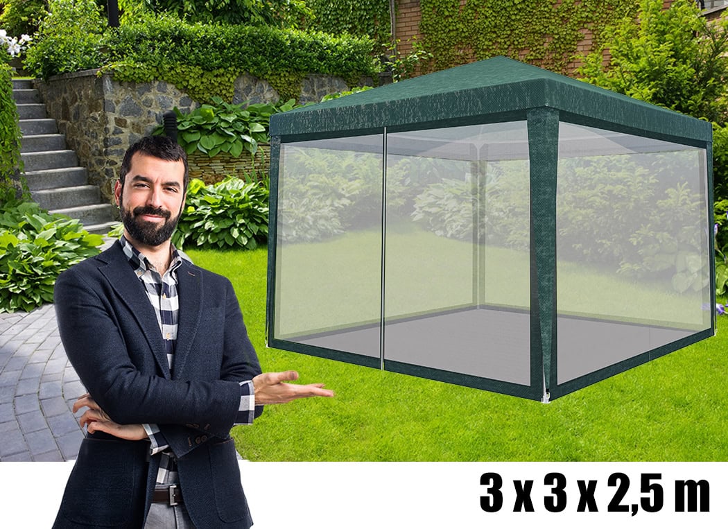 Set 4 pereti pentru pavilion gradina cu plasa tantari si acoperis, material PE 100 g/m2, 300×200 cm, verde Mob360