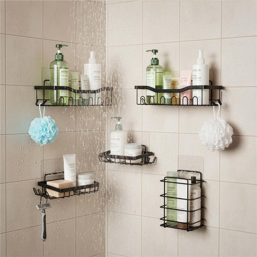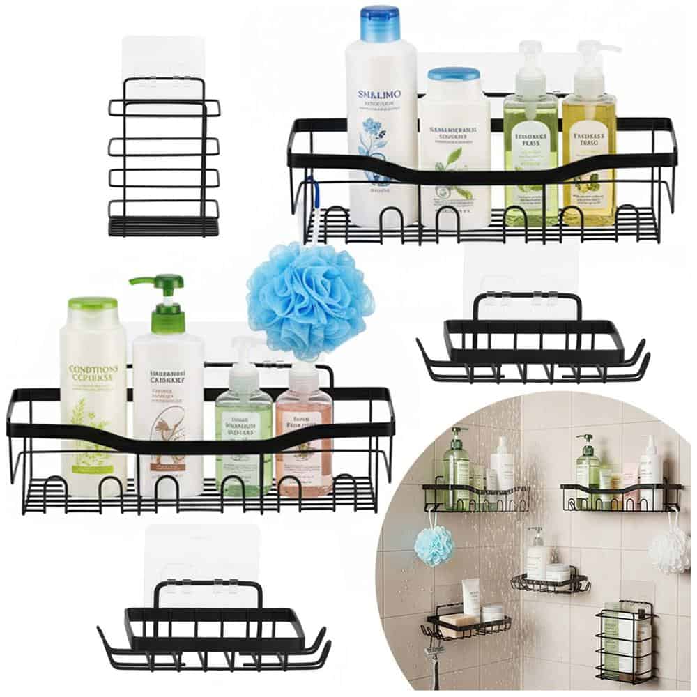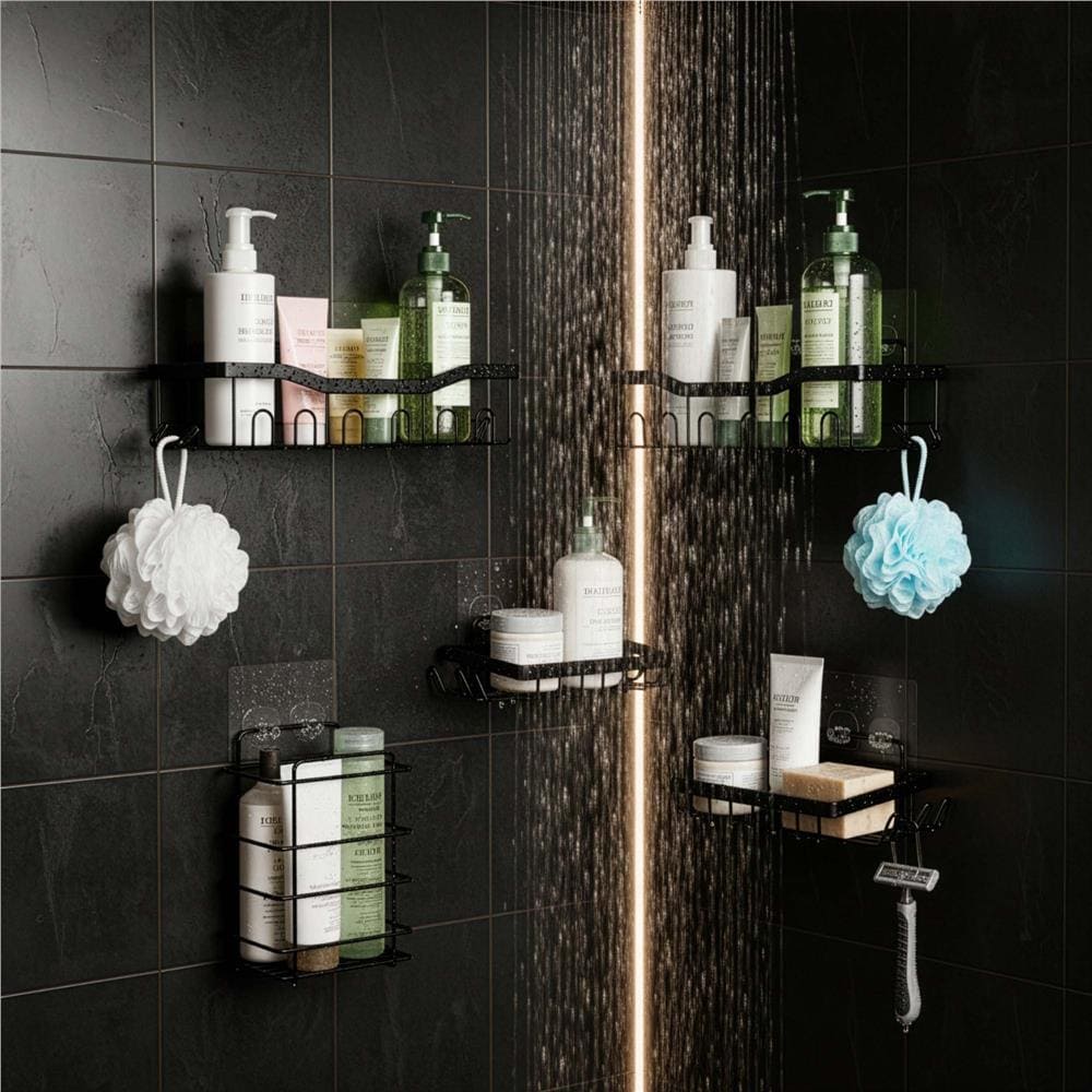 Set 5 polite metalice pentru dus cu montaj autoadeziv, inox, negru mat Mob360 – produs disponibil în magazinul Mob360.