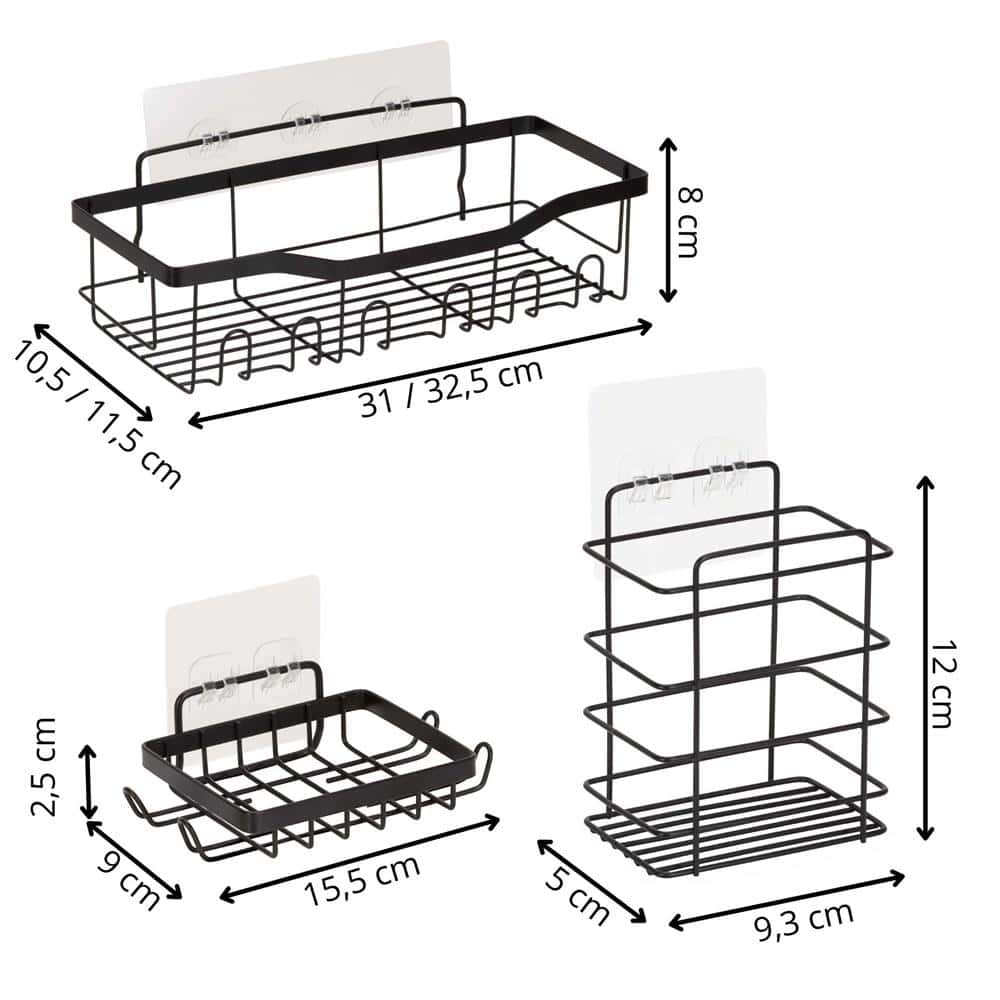Specificatii tehnice: Numar piese: 5 polite Material: otel inoxidabil Culoare: negru mat Montaj: autoadeziv Sarcina maxima polita mica: 1 kg Sarcina maxima polita medie: 1,5 kg Sarcina maxima polita mare: 3 kg Scurta descriere: Set de polite metalice cu montaj autoadeziv, conceput pentru organizarea eficienta a spatiului fara gaurire. Potrivite pentru baie, bucatarie sau alte zone unde este necesara depozitarea obiectelor usoare. Caracteristici principale: Set complet cu 5 polite de dimensiuni diferite Montaj rapid cu banda autoadeziva Nu necesita gaurire Structura rezistenta din otel inoxidabil Finisaj negru mat modern Potrivite pentru baie sau bucatarie Usor de instalat si intretinut