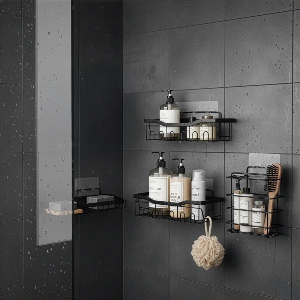 Set 5 polite metalice pentru dus cu montaj autoadeziv, inox, negru mat Mob360