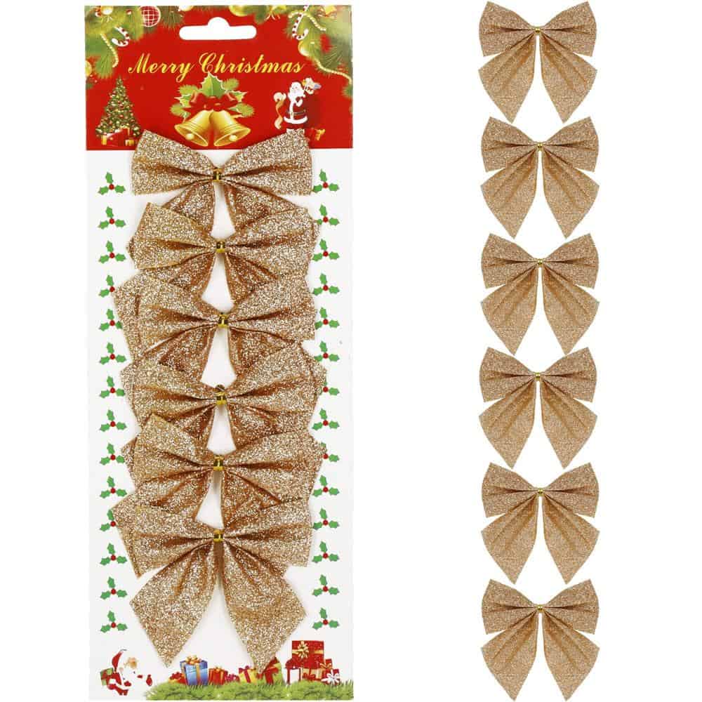 Set 6 ornamente pentru bradul de Craciun, fundita, 8cm, auriu Mob360