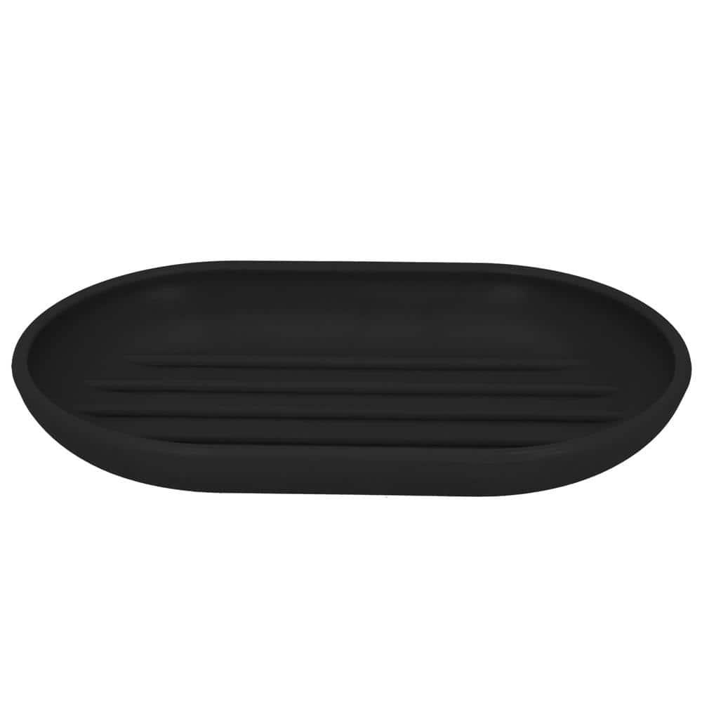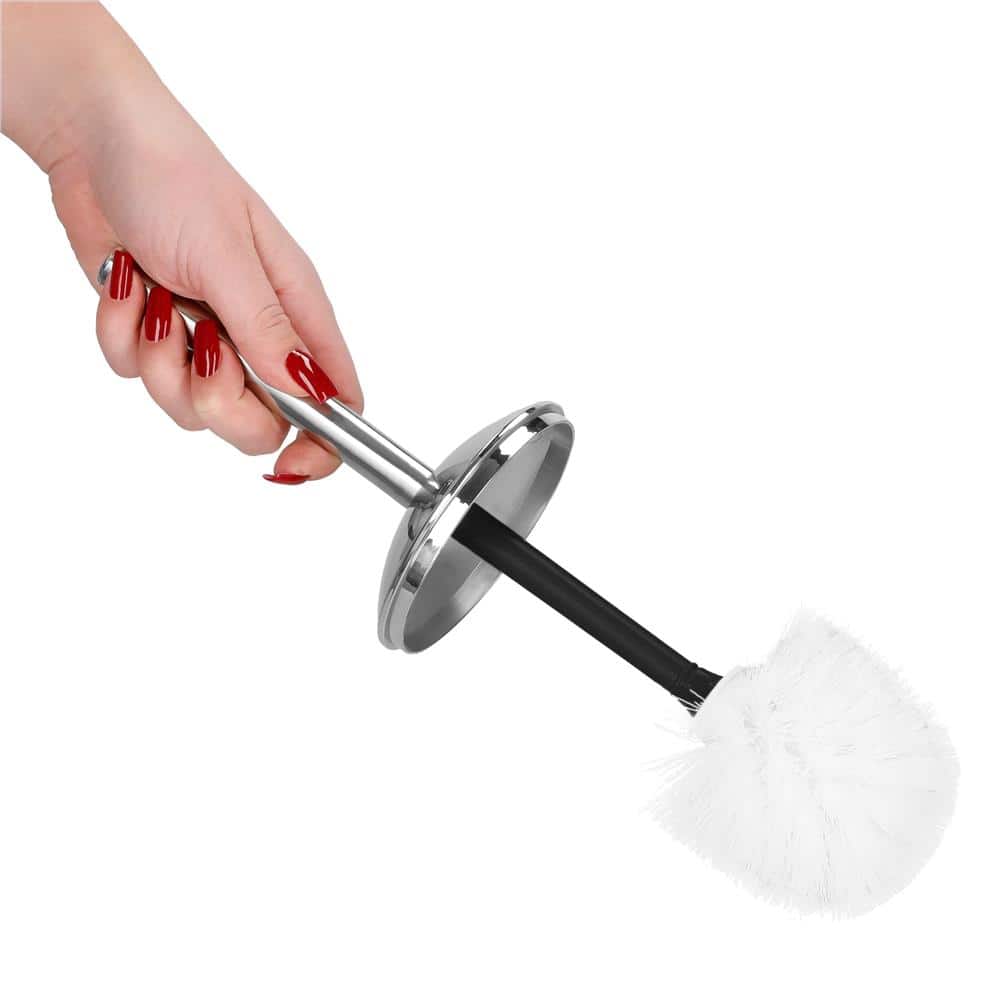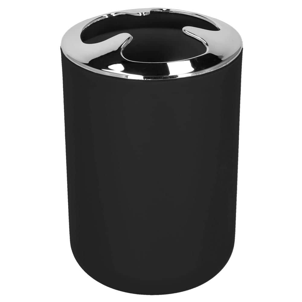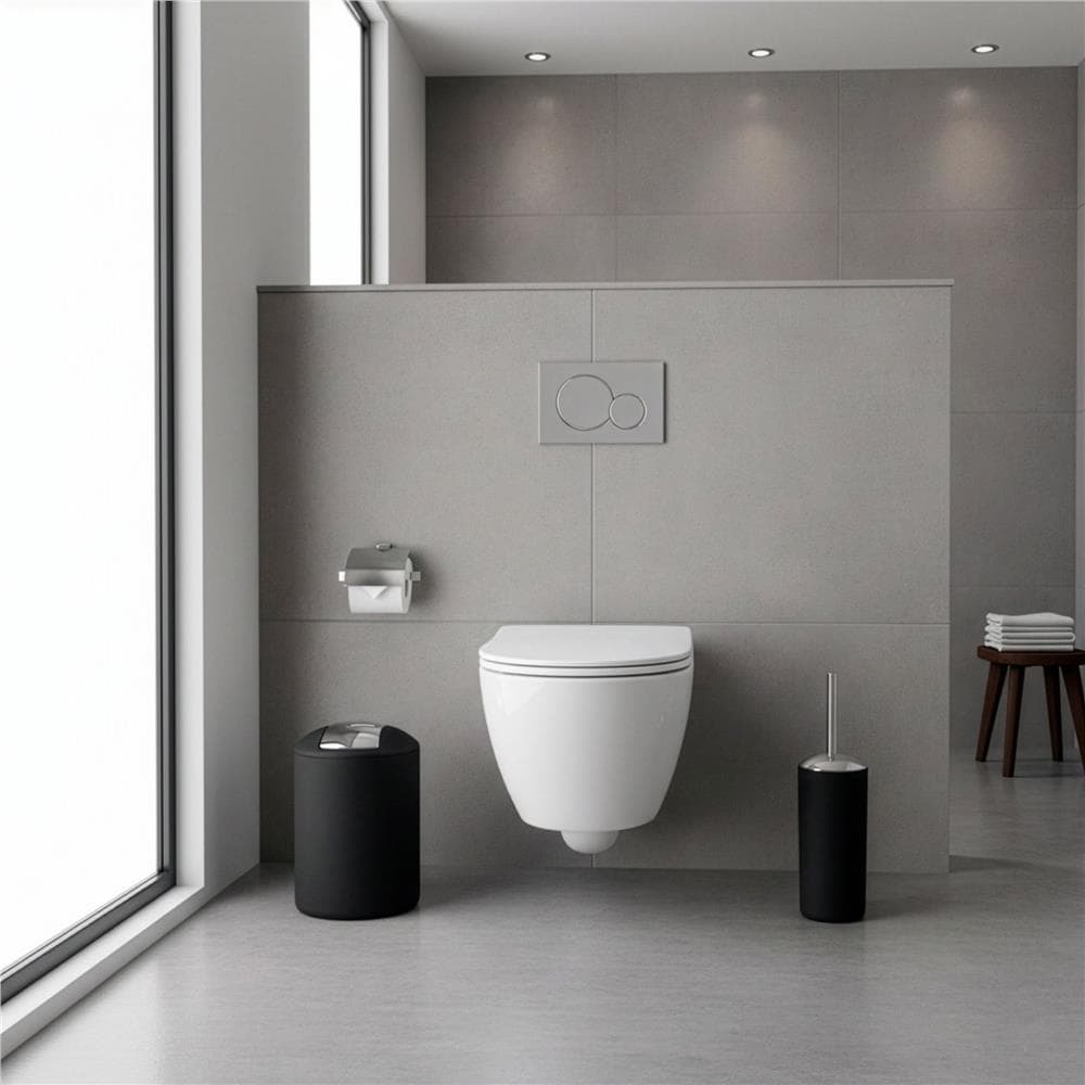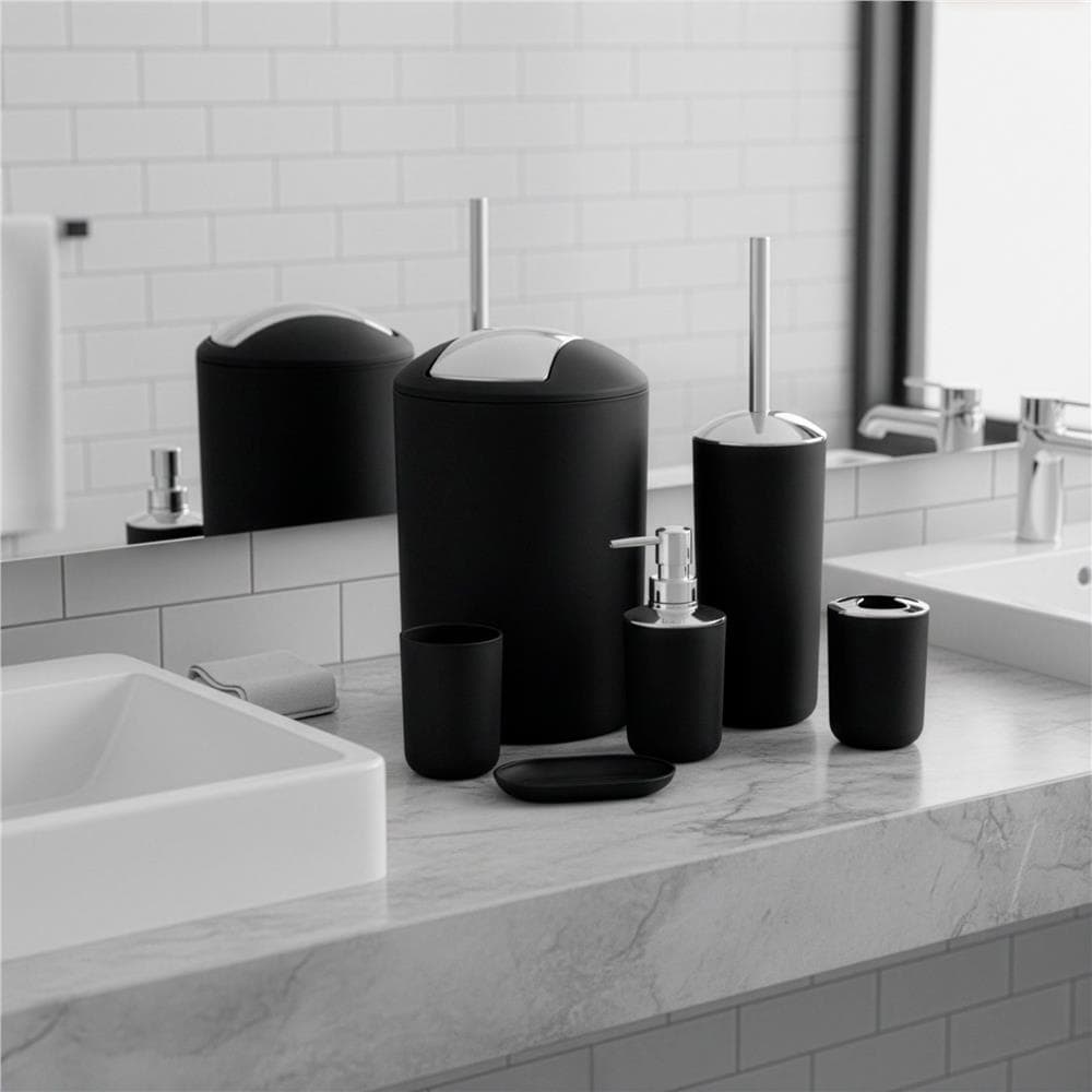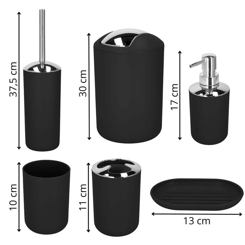 Set accesorii baie, 6 piese din plastic, cu perie WC si cos de gunoi, finisaj mat si lucios, negru argintiu Mob360