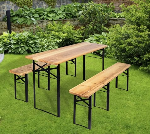 Set berarie din lemn masiv, pliabil, pentru terasa sau gradina, o masa si doua banci, 177x46cm, natur Mob360