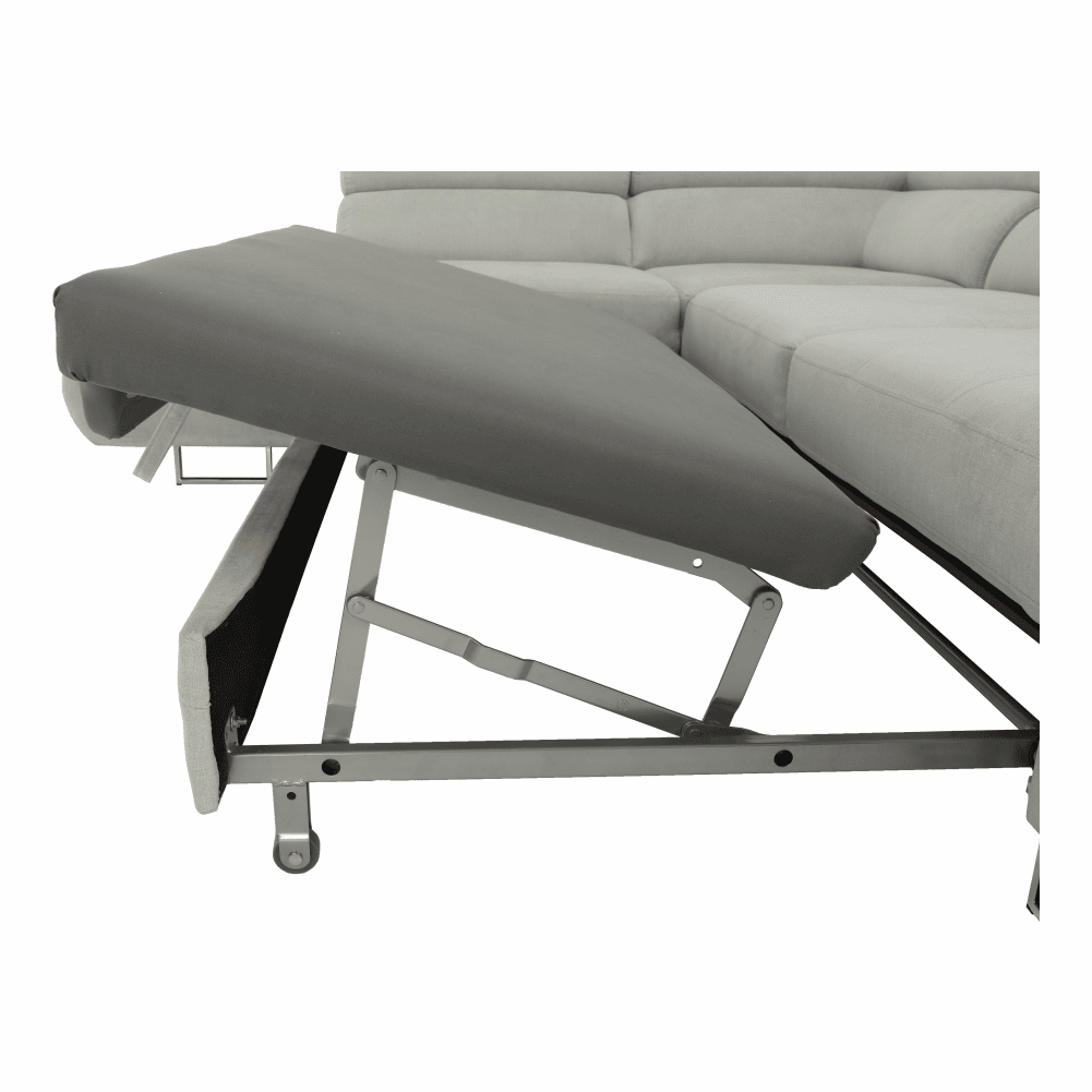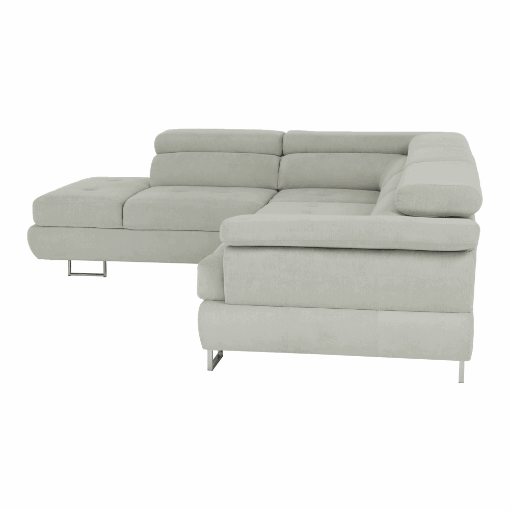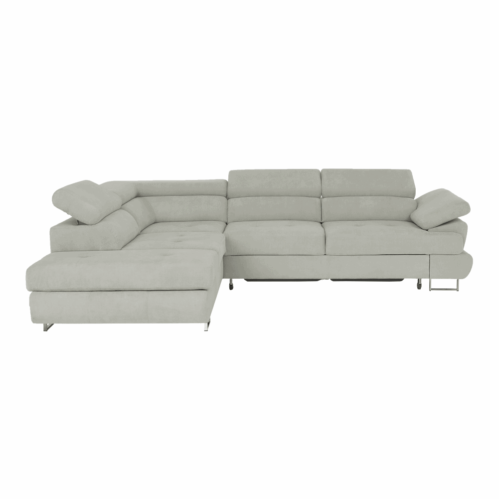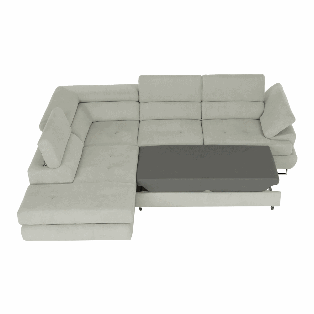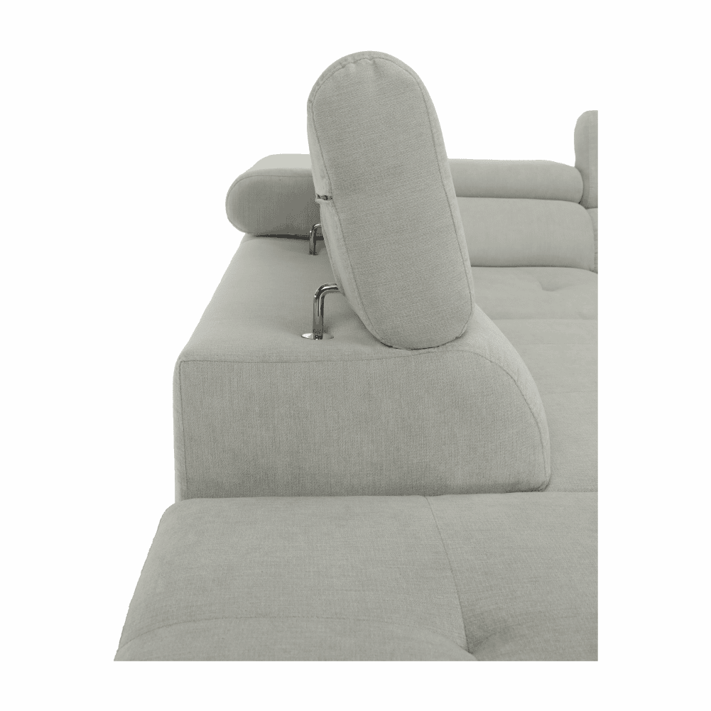 Material: ţesătură Soro 83 Rezistenţa ţesăturii conform testului Martindale: 90.000 – 100.000 de cicluri de frecare Culoare: gri deschis Dimensiuni (LxAxÎ): 275x225x71/85 cm. Înălţime scaun: 40 cm Adâncime scaun: 59 cm Înălţimea compartimentului inferior de la podea: 9 cm Înălţime spătar: 32/50 cm Adâncime spătar în poziţie înclinată: 41 cm Cotieră (AxÎ): 105×62/69 cm Suprafaţa de dormit: 125x200cm Lăţime otoman: 104 cm Capacitate de încărcare: 90 kg Colţar, Extensibilă, Cu spaţiu de depozitare, Cusături decorative, Spătar interesant, 3 tetiere ajustabile, 5 grade de poziţionare a tetierelor, Tapiţată integral, Umplutură: arcuri, Picioare metalice cu finisaj cromat, Variantă pentru partea stânga, Setul nu include perne decorative, Livrată dezasamblată, Vă oferim posibilitatea de a alege dintre 7 nuanţe de culoare ale ţesăturii Soro, conform catalogului de mostre.