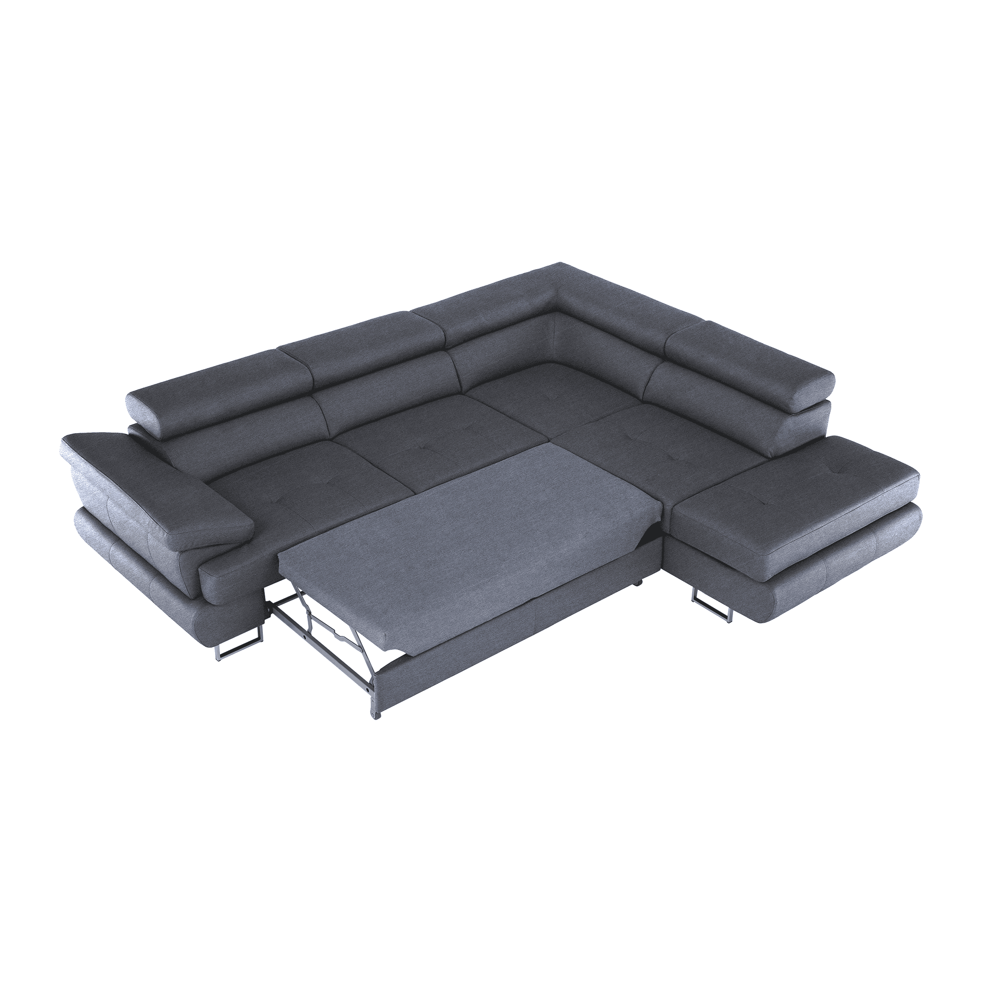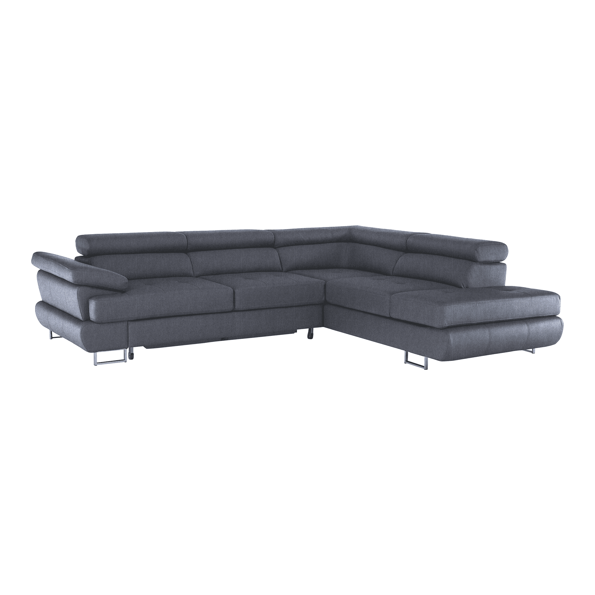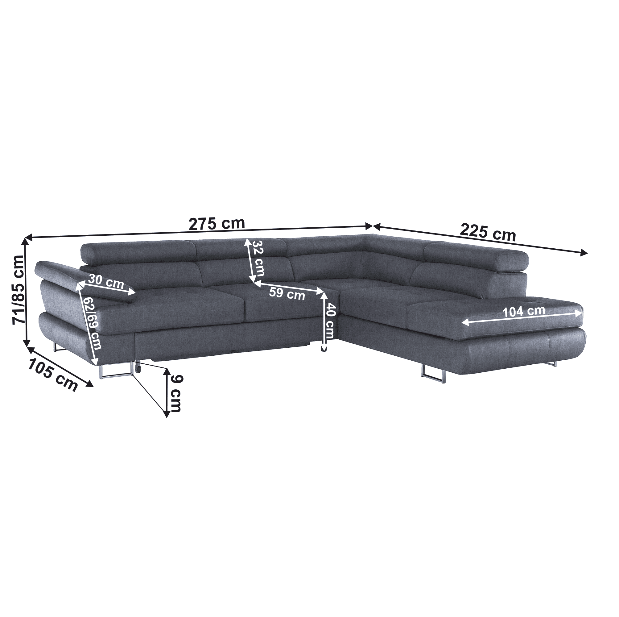 Material: ţesătură Soro 97 Rezistenţa la frecare a ţesăturii conform testului Martindale: 90.000 – 100.000 de cicluri Culoare: gri Dimensiuni (LxAxÎ): 275x225x71/85 cm. Înălţime scaun: 40 cm Adâncime scaun: 59 cm Înălţimea compartimentului inferior de la podea: 9 cm Înălţime spătar: 32/50 cm Adâncime spătar în poziţie înclinată: 41 cm Cotieră (AxÎ): 105×62/69 cm Suprafaţa de dormit: 125x200cm Lăţime otoman: 104 cm Capacitate de încărcare: 90 kg Colţar, Extensibilă, Cu spaţiu de depozitare, Cusături decorative, Spătar interesant, 3 tetiere ajustabile, 5 grade de poziţionare a tetierelor, Tapiţată integral, Umplutură: arcuri, Picioare metalice cu finisaj cromat, Variantă pentru partea dreaptă, Setul nu include perne decorative, Livrată dezasamblată, Vă oferim posibilitatea de a alege dintre 7 nuanţe de culoare ale ţesăturii Soro, conform catalogului de mostre.
