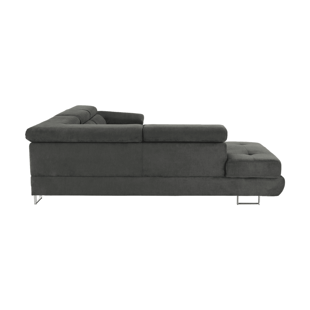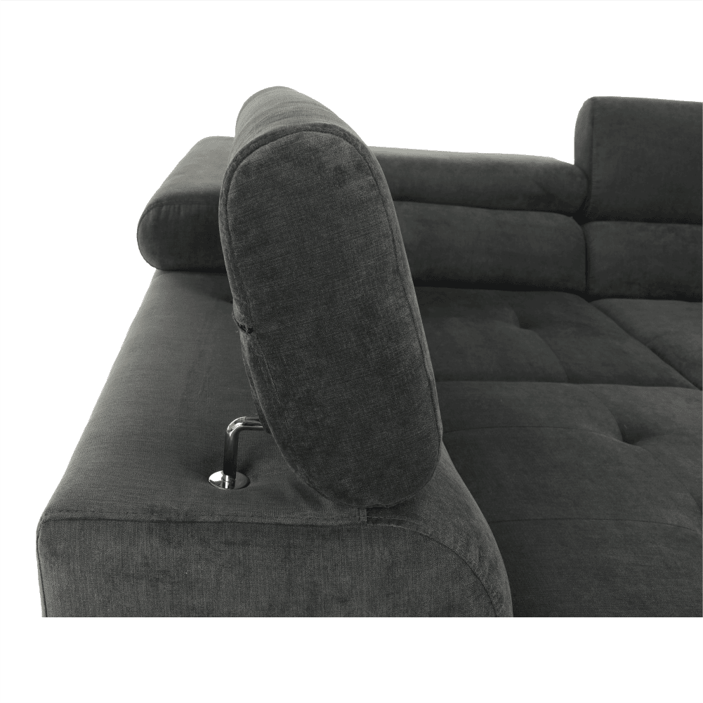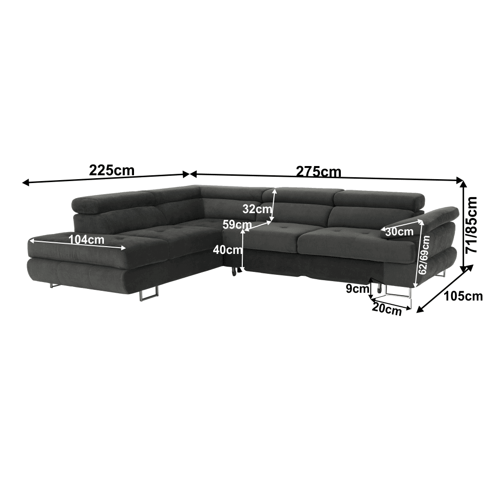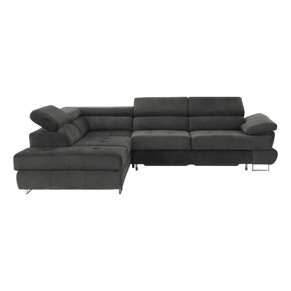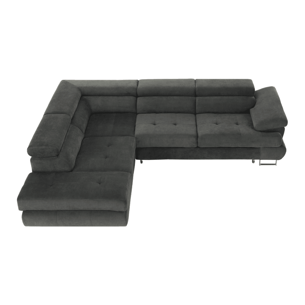 Material: ţesătură Soro 97 Rezistenţa la frecare a ţesăturii conform testului Martindale: 90.000 – 100.000 de cicluri Culoare: gri Dimensiuni (LxAxÎ): 275x225x71/85 cm. Înălţime scaun: 40 cm Adâncime scaun: 59 cm Înălţimea compartimentului inferior de la podea: 9 cm Înălţime spătar: 32/50 cm Adâncime spătar în poziţie înclinată: 41 cm Cotieră (AxÎ): 105×62/69 cm Suprafaţa de dormit: 125x200cm Lăţime otoman: 104 cm Capacitate de încărcare: 90 kg Colţar, Extensibilă, Cu spaţiu de depozitare, Cusături decorative, Spătar interesant, 3 tetiere ajustabile, 5 grade de poziţionare a tetierelor, Tapiţată integral, Umplutură: arcuri, Picioare metalice cu finisaj cromat, Variantă pentru partea stânga, Setul nu include perne decorative, Livrată dezasamblată, Vă oferim posibilitatea de a alege dintre 7 nuanţe de culoare ale ţesăturii Soro, conform catalogului de mostre.