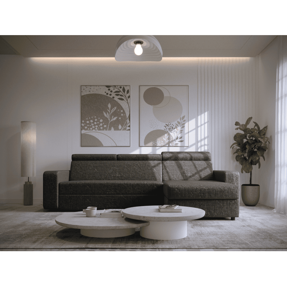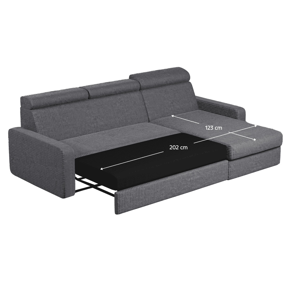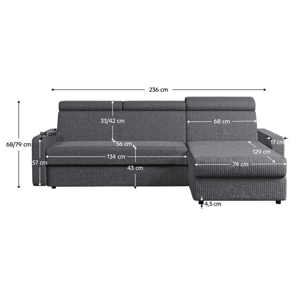 Material: ţesătură Poso 60 Rezistenţa ţesăturii la frecare conform testului Martindale: 90 000 de cicluri de frecare Culoare: gri Dimensiuni (lxAxh): 236x170x68/79 cm Suprafaţa pentru dormit (lxL): 123×202 cm Înălţimea părţii de şezut: 43 cm Adâncimea părţii de şezut: 56 cm Dimensiuni otoman (lxA): 74×129 cm Dimensiuni cotieră (lxAxh): 17x94x57 cm Lăţimea părţii de şezut: 134 cm Pe dreapta Complet tapiţată Extensibilă De colţ Cu spaţiu de depozitare Pe picioare Material picioare: plastic Culoare picioare: neagră Înălţimea spaţiului inferior faţă de podea: 4,5 cm Umplutură: arc falista/spumă pur Tetiere reglabile Poziţionarea tetierelor în 6 poziţii Practică Modernă Livrată dezasamblată