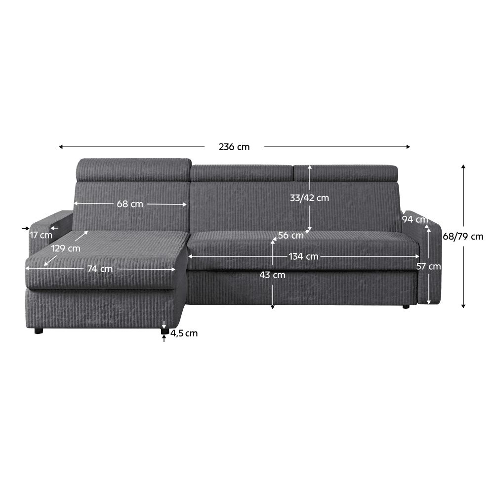 Material: ţesătură Poso 60 Rezistenţa ţesăturii la frecare conform testului Martindale: 90 000 de cicluri de frecare Culoare: gri Dimensiuni (lxAxh): 236x170x68/79 cm Suprafaţa pentru dormit (lxL): 123×202 cm Înălţimea părţii de şezut: 43 cm Adâncimea părţii de şezut: 56 cm Dimensiuni otoman (lxA): 74×129 cm Dimensiuni cotieră (lxAxh): 17x94x57 cm Lăţimea părţii de şezut: 134 cm Pe stânga Complet tapiţată Extensibilă De colţ Cu spaţiu de depozitare Varianta pe stânga Pe picioare Material picioare: metal Culoare picioare: argintiu Înălţimea spaţiului inferior faţă de podea: 4,5 cm Umplutură: arc falista/spumă pur Tetiere reglabile Poziţionarea tetierelor în 6 poziţii Practică Modernă Livrată dezasamblată