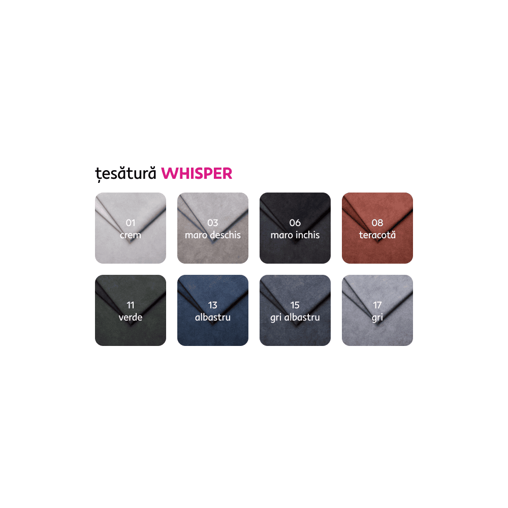 Material tapiţerie: WHISPER 10 Rezistenţa la frecare a ţesăturii conform testului Martindale: 100.000 Culoarea tapiţeriei: muştar Dimensiuni (LxAxÎ): 275x205x75/95 cm Suprafaţa pentru dormit (LxL): 125×195 cm Înălţime scaun: 43 cm Adâncime scaun: 58 cm Dimensiuni otoman (LxL): 105×165 cm Dimensiuni cotieră (LxAxÎ): 35x100x57 cm Lăţime scaun: 140 cm Cu picioare Material picioare: metal Culoare picioare: neagră Înălţimea compartimentului inferior de la podea: 10,5 cm Umplutura: arcuri ondulate + spumă poliuretanică Extensibilă Colţar Tapiţată integral Cu spaţiu de depozitare 3 tetiere ajustabile 5 grade de înclinare a tetierelor În formă de L Variantă pentru partea dreaptă Livrată dezasamblată Posibilitatea de a alege dintre 8 nuanţe ale ţesăturii Whisper la preţul de 7.695 Lei cu termenul de livrare de 6-8 săptămâni. Pentru comenzi personalizate este necesară plata unui avans de 20% din suma totală. După achitarea avansului, comanda dumneavoastră va intra în producţie.