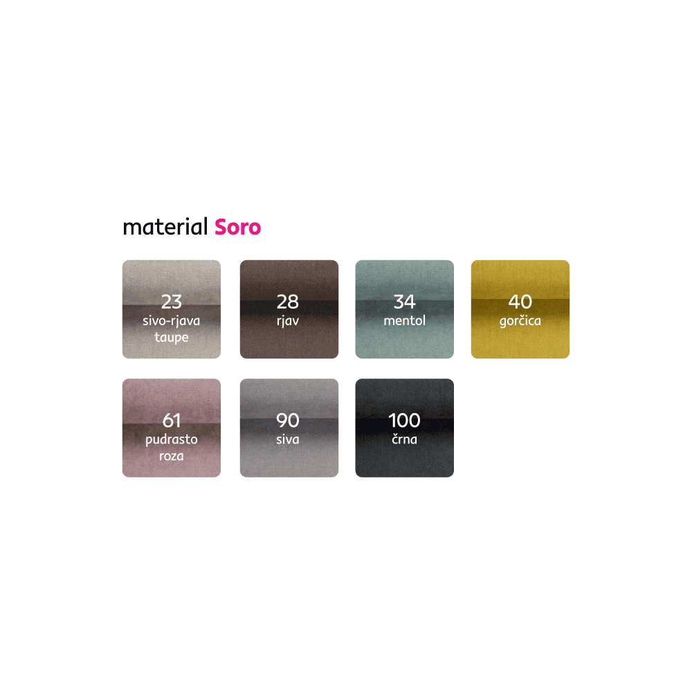 Vă oferim posibilitatea de a alege dintre 7 nuanţe de culoare ale ţesăturii Soro conform catalogului de mostre. Vă oferim posibilitatea de a alege dintre 7 nuanţe de culoare ale ţesăturii Soro conform catalogului de mostre. Vă rugăm să specificaţi alegerea dumneavoastră direct în notele din comandă. Preţul canapelei pentru comenzi individuale este versiunea cu spaţiu de depozitare BUTON R 8.935 Lei şi versiunea fixă fără spaţiu de depozitare BUTON P 8.235 Lei. Pentru comenzi personalizate este necesară plata unui avans de 20% din suma totală. După achitarea avansului, comanda dumneavoastră va intra în producţie. Termenul de livrare este de 6-8 săptămâni.