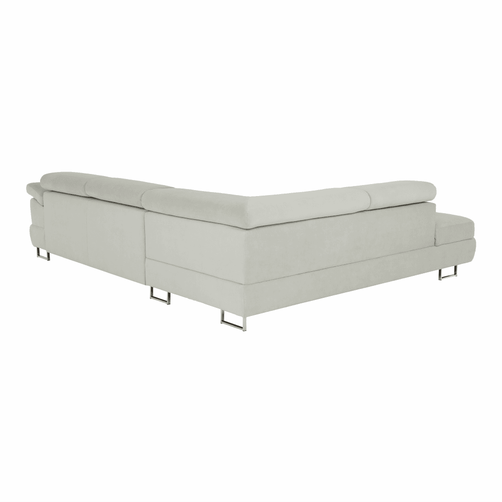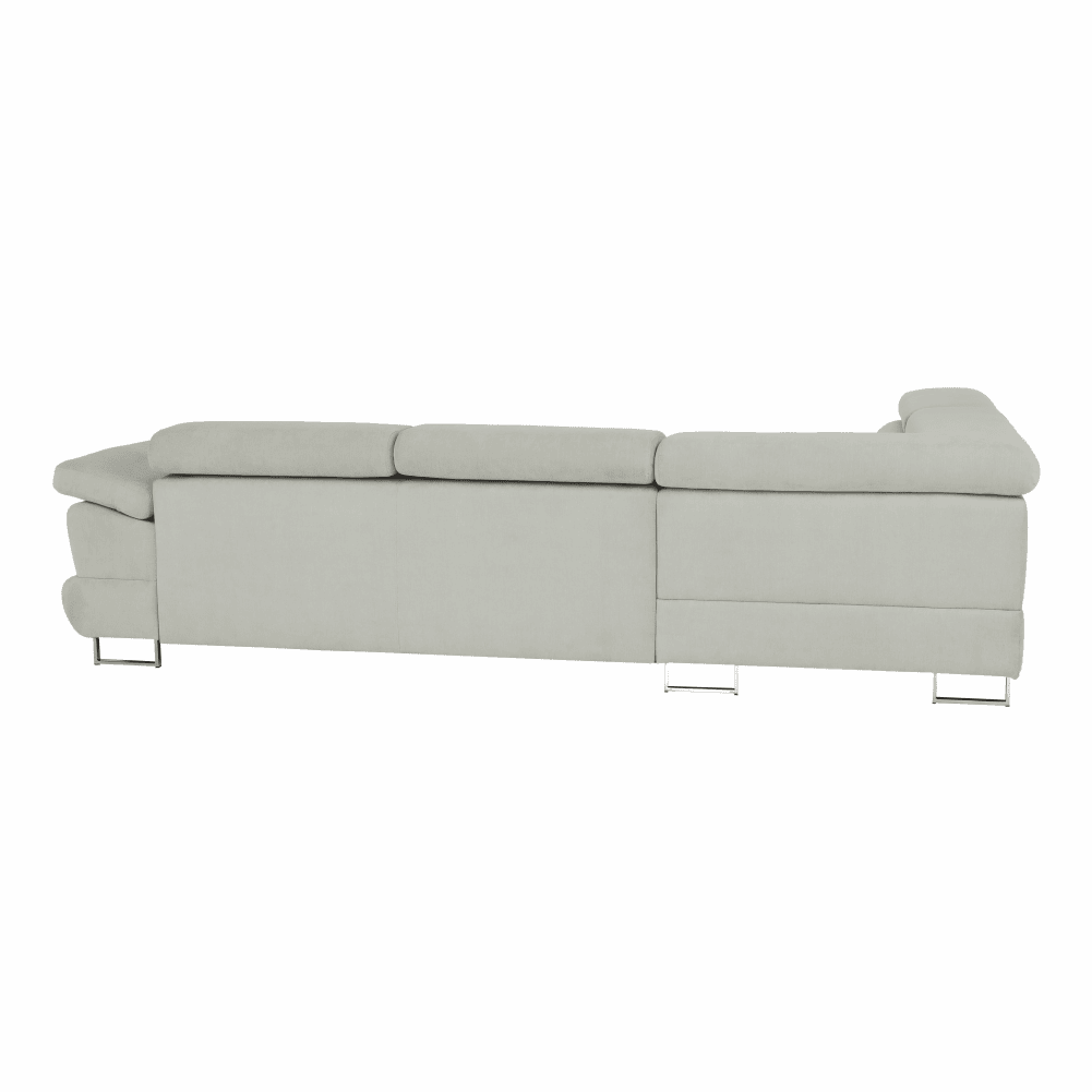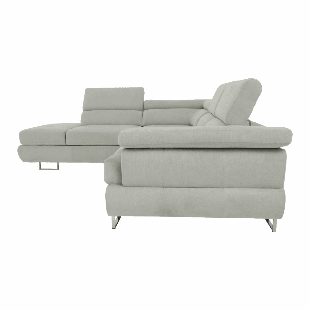 Material: ţesătură Soro 83 Rezistenţa ţesăturii conform testului Martindale: 90.000 – 100.000 de cicluri de frecare Culoare: gri deschis Dimensiuni (LxAxÎ): 275x225x71/85 cm. Înălţime scaun: 40 cm Adâncime scaun: 59 cm Înălţimea compartimentului inferior de la podea: 9 cm Înălţime spătar: 32/50 cm Adâncime spătar în poziţie înclinată: 41 cm Cotieră (AxÎ): 105×62/69 cm Lăţime otoman: 104 cm Capacitate de încărcare: 90 kg Colţar, Cusături decorative, Spătar interesant, 3 tetiere ajustabile, 5 grade de poziţionare a tetierelor, Tapiţată integral, Umplutură: arcuri, Picioare metalice cu finisaj cromat, Variantă pentru partea stânga, Setul nu include perne decorative, Livrată dezasamblată,