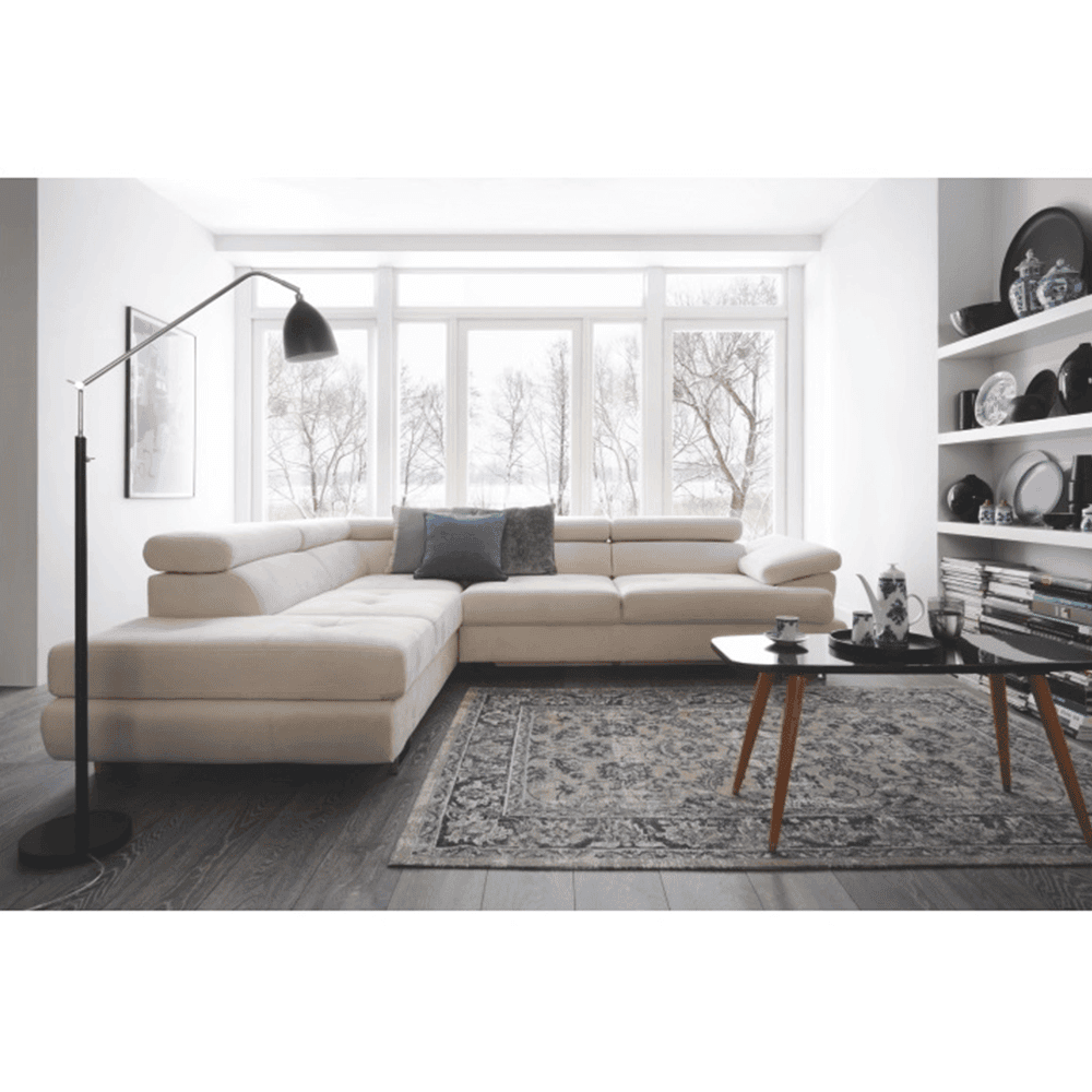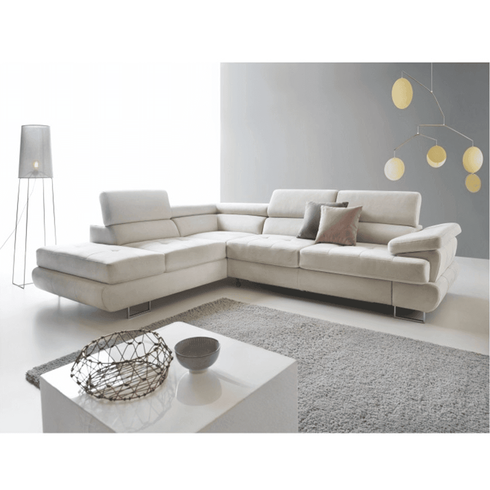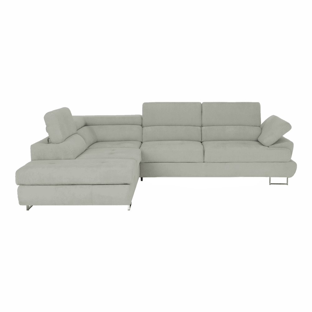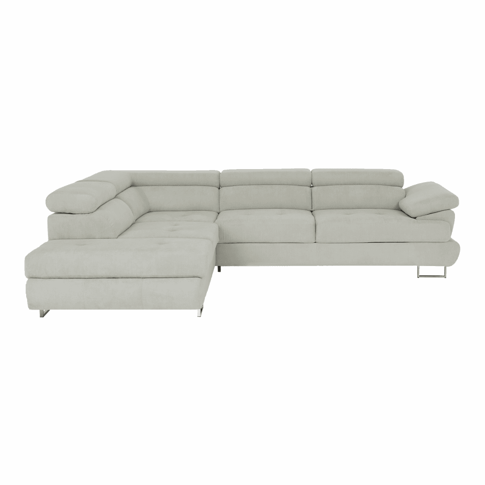 Material: ţesătură Soro 83 Rezistenţa ţesăturii conform testului Martindale: 90.000 – 100.000 de cicluri de frecare Culoare: gri deschis Dimensiuni (LxAxÎ): 275x225x71/85 cm. Înălţime scaun: 40 cm Adâncime scaun: 59 cm Înălţimea compartimentului inferior de la podea: 9 cm Înălţime spătar: 32/50 cm Adâncime spătar în poziţie înclinată: 41 cm Cotieră (AxÎ): 105×62/69 cm Lăţime otoman: 104 cm Capacitate de încărcare: 90 kg Colţar, Cusături decorative, Spătar interesant, 3 tetiere ajustabile, 5 grade de poziţionare a tetierelor, Tapiţată integral, Umplutură: arcuri, Picioare metalice cu finisaj cromat, Variantă pentru partea stânga, Setul nu include perne decorative, Livrată dezasamblată,