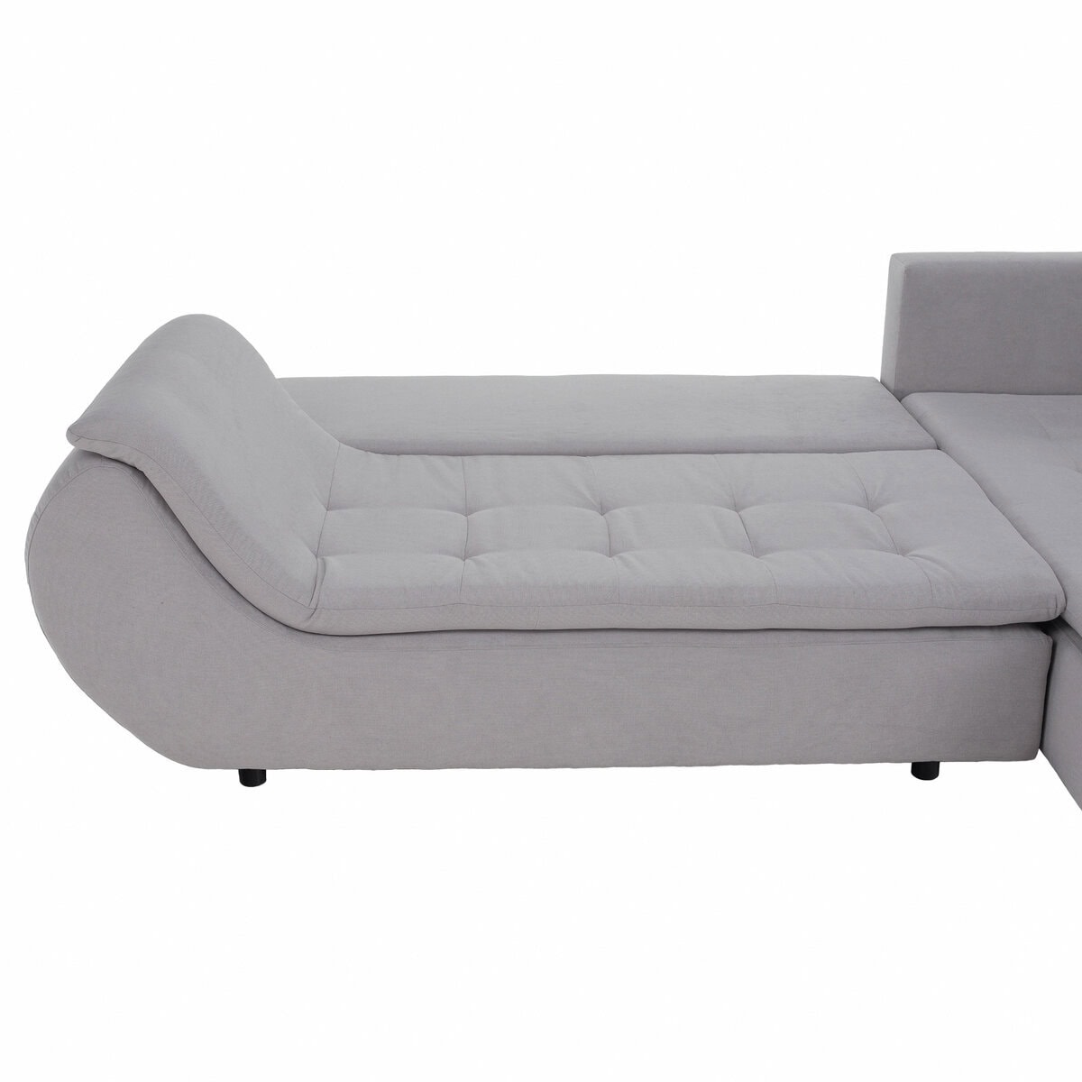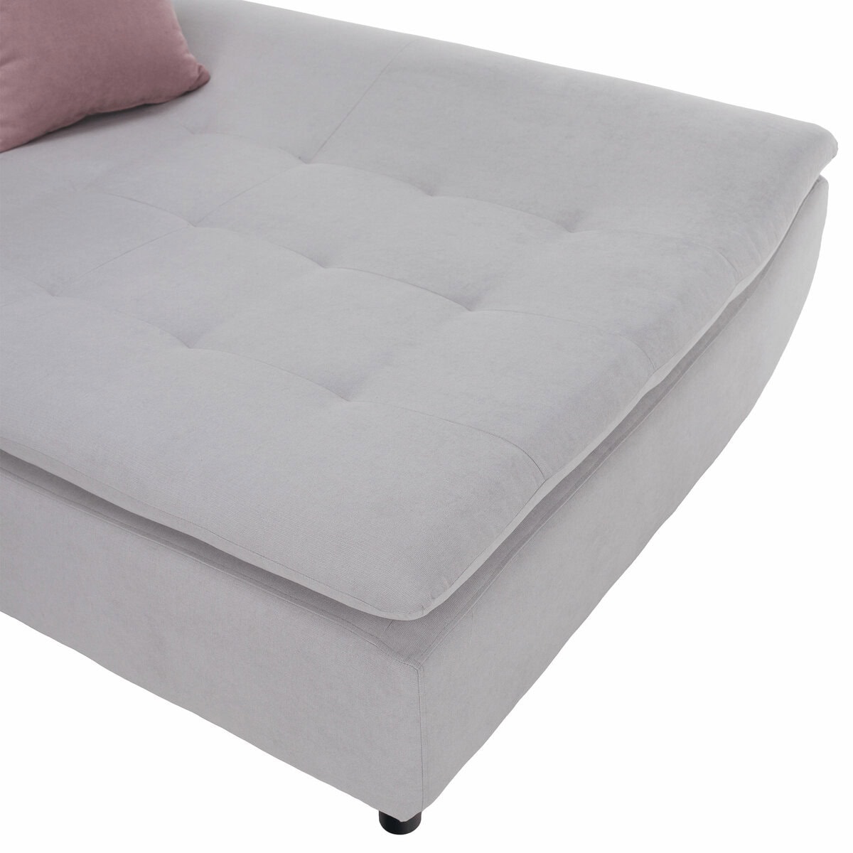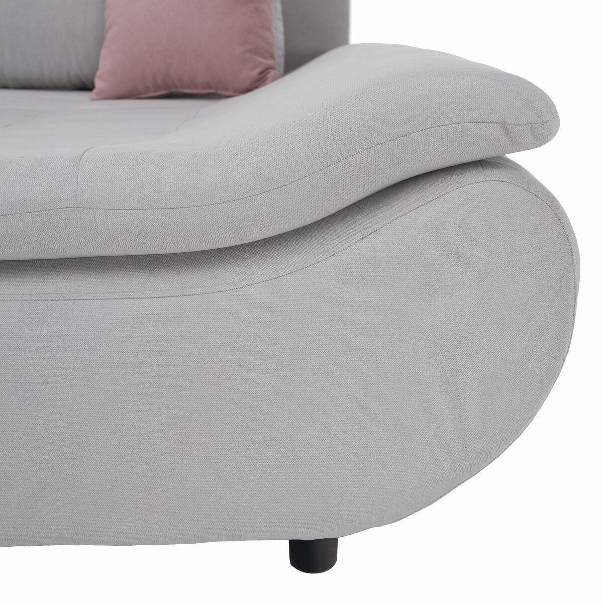 Material: ţesătură Soro 83/61 Rezistenţa ţesăturii conform testului Martindale: 90 000 – 100 000 de cicluri de frecare Culoare: gri deschis / roz pudră Dimensiuni (LxAxÎ): 310x185x72 cm Înălţime scaun: 37 cm Adâncimea scaunului cu perne: 55 cm Adâncimea scaunului fără perne: 83 cm Suprafaţa extensibilă pentru dormit (LxL): 135×240 cm Înălţimea spaţiului inferior de la podea: 5 cm Capacitate de încărcare: 90 kg Umplutura modulului pentru şezut: arcuri ondulate / spumă poliuretanică Variantă pentru partea dreaptă Tapiţată integral Cu spaţiu de depozitare Trei perne incluse în set Perne decorative incluse Livrată dezasamblată