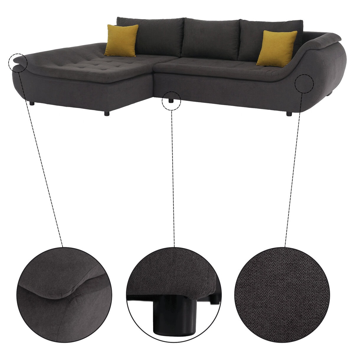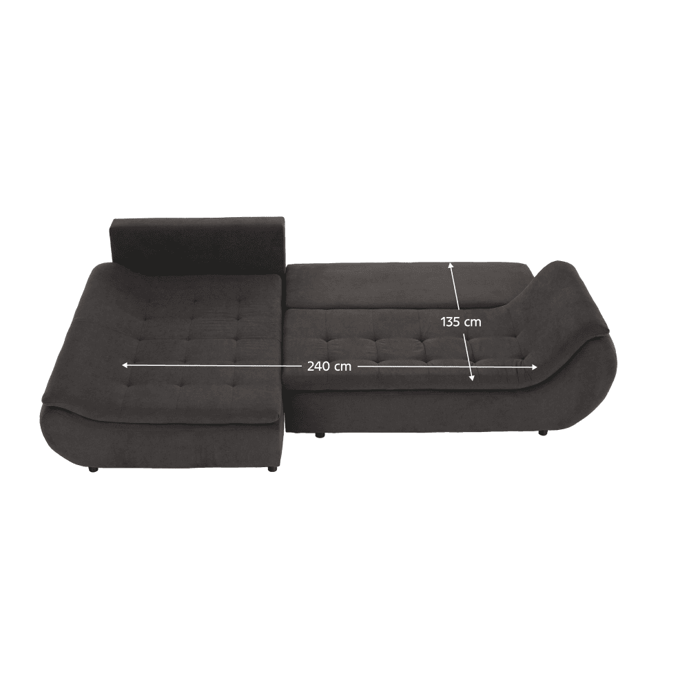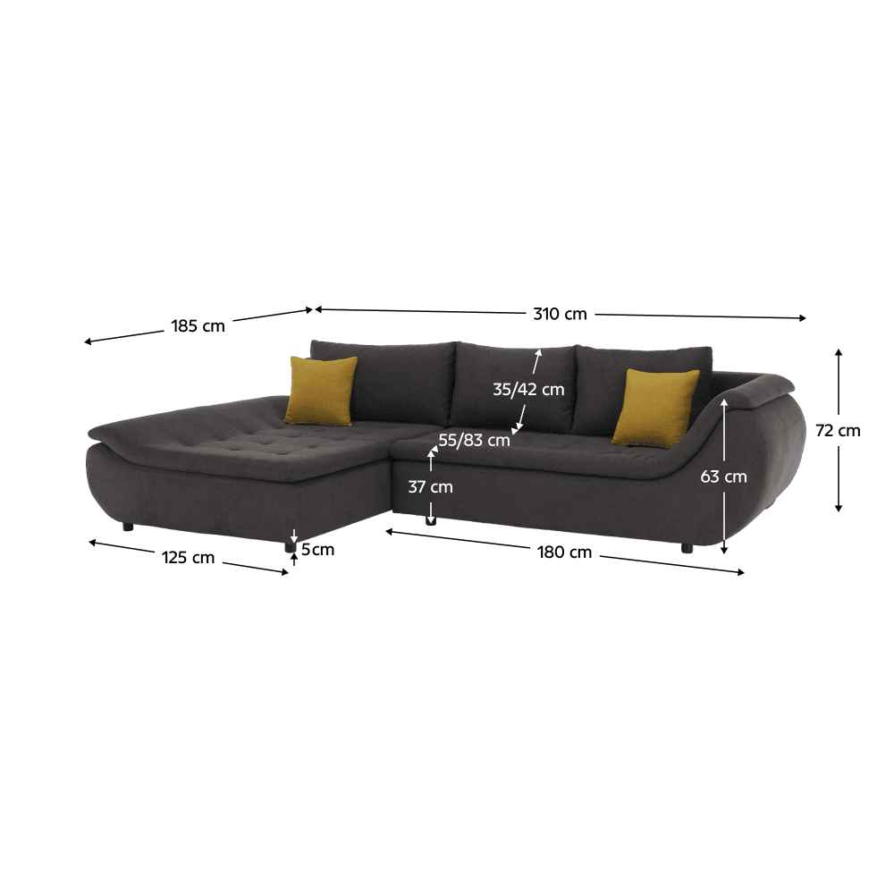 Material: ţesătură Soro 95/40 Rezistenţa ţesăturii conform testului Martindale: 90 000 – 100 000 de cicluri de frecare Culoare: gri-maro /galben Dimensiuni (LxAxÎ): 310x185x72 cm Înălţime scaun: 37 cm Adâncimea scaunului cu perne: 55 cm Adâncimea scaunului fără perne: 83 cm Suprafaţa extensibilă pentru dormit (LxL): 135×240 cm Înălţimea spaţiului inferior de la podea: 5 cm Capacitate de încărcare: 90 kg Umplutura modulului pentru şezut: arcuri ondulate / spumă poliuretanică Variantă pentru partea stânga Tapiţată integral Cu spaţiu de depozitare Trei perne incluse în set Perne decorative incluse Livrată dezasamblată