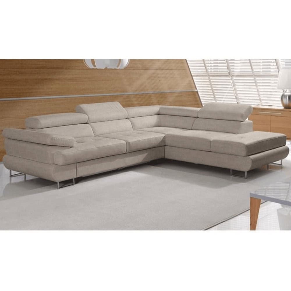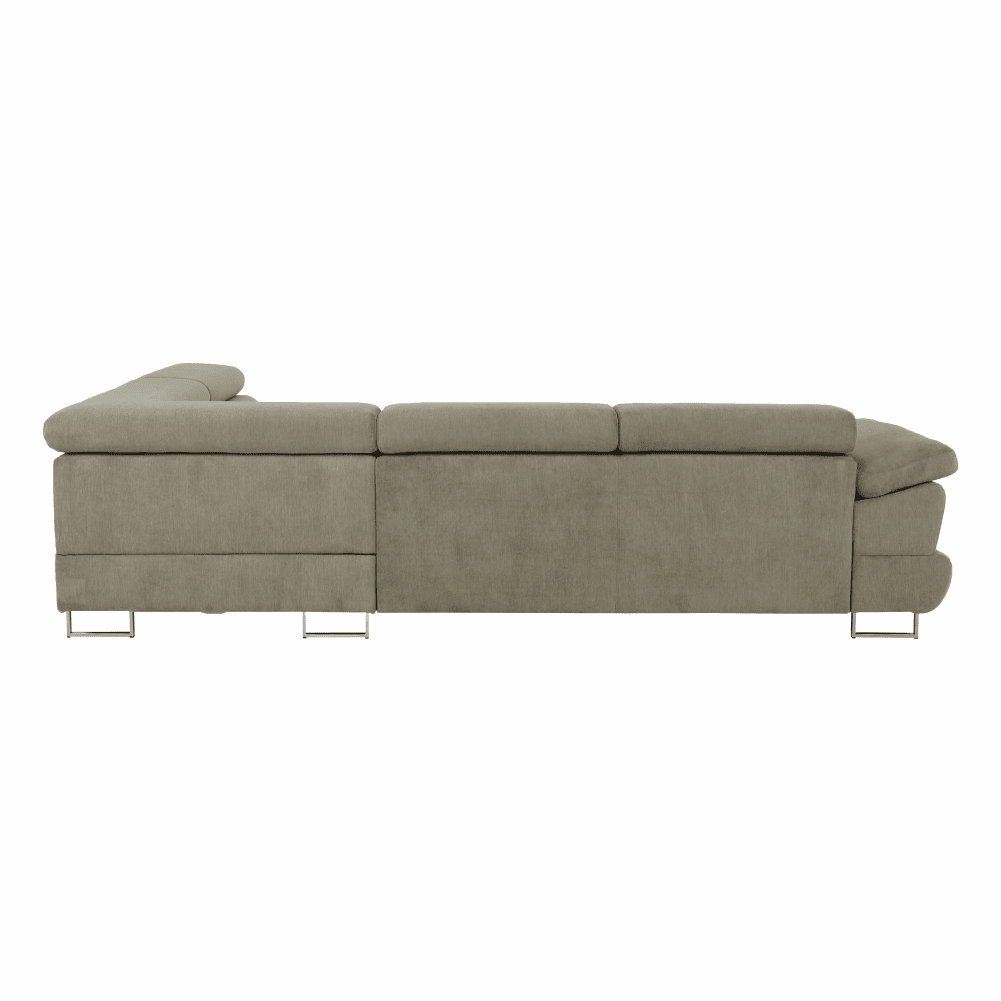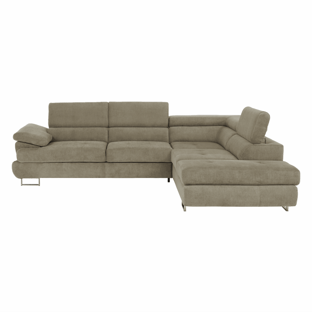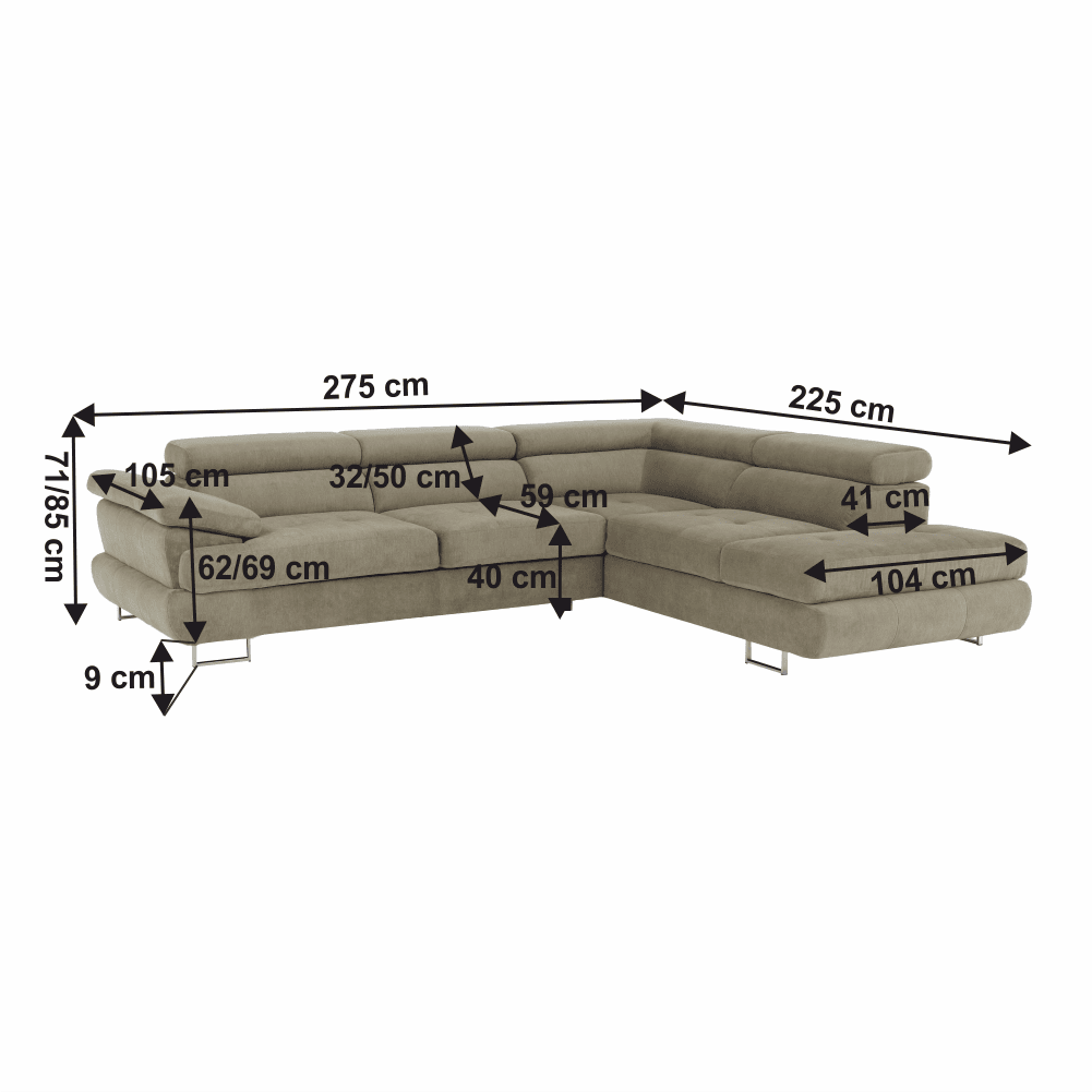 Material: ţesătură Soro 13 Rezistenţa ţesăturii conform testului Martindale: 90.000 – 100.000 de cicluri de frecare Culoare: maro deschis melanj Dimensiuni (LxAxÎ): 275x225x71/85 cm. Înălţime scaun: 40 cm Adâncime scaun: 59 cm Înălţimea compartimentului inferior de la podea: 9 cm Înălţime spătar: 32/50 cm Adâncime spătar în poziţie înclinată: 41 cm Cotieră (AxÎ): 105×62/69 cm Lăţime otoman: 104 cm Capacitate de încărcare: 90 kg Colţar, Cusături decorative, Spătar interesant, 3 tetiere ajustabile, 5 grade de poziţionare a tetierelor, Tapiţată integral, Umplutură: arcuri, Picioare metalice cu finisaj cromat, Variantă pentru partea dreaptă, Setul nu include perne decorative, Livrată dezasamblată, Vă oferim posibilitatea de a alege dintre 7 nuanţe de culoare ale ţesăturii Soro, conform catalogului de mostre.
