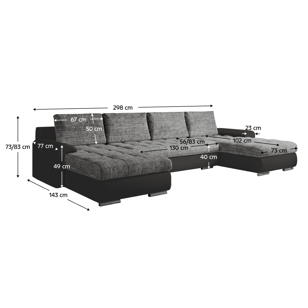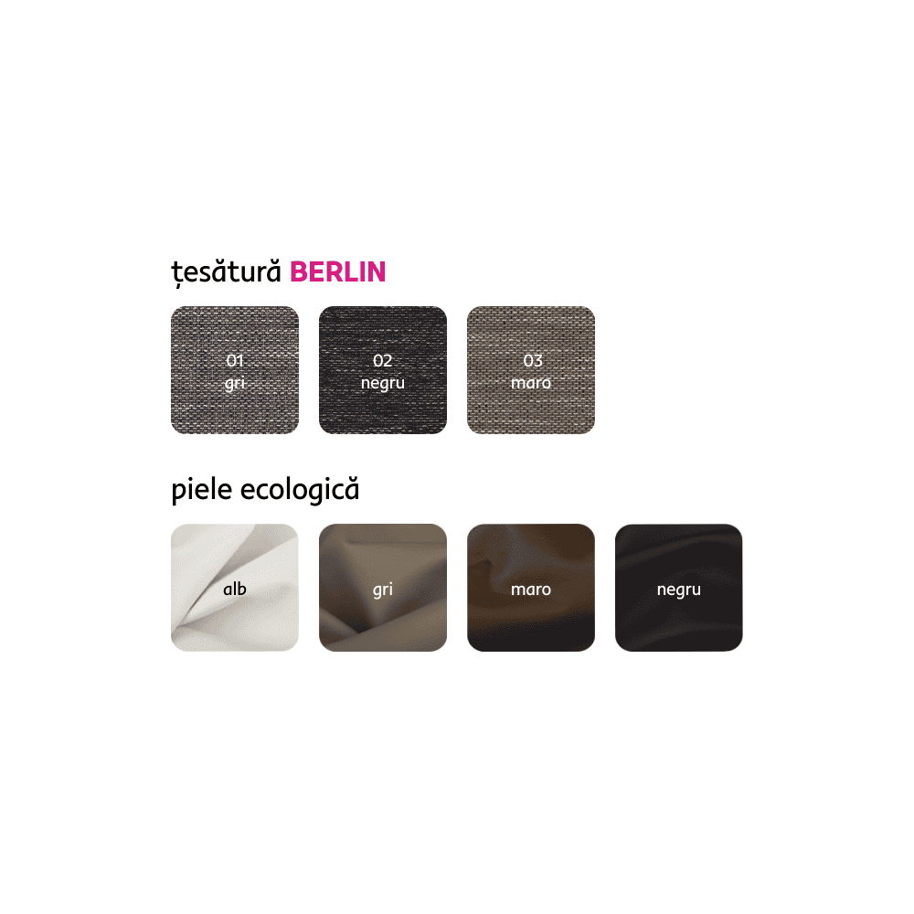Material: ţesătură Berlin 01/piele ecologică Rezistenţa la frecare a ţesăturii Berlin conform testului Martindale: 55 000 de cicluri de frecare Rezistenţa pielii ecologice la frecare conform testului Martindale: 100 000 de cicluri de frecare Culoare: melir gri Dimensiuni (lxAxh): 298x143x73/83 cm Înălţimea părţii de şezut: 40 cm Adâncimea părţii de şezut: 56/83 cm Suprafaţa extensibilă pentru dormit (lxL): 128×241 cm Lăţimea părţii de şezut: 130 cm Dimensiuni cotieră (lxAxh): 23x77x49 cm Dimensiuni otoman (lxA): 73×102 cm Pe picioare Material picior: plastic Culoare picioare: argintie Umplutură: arc falista/spumă PUR În formă de U Universală Complet tapiţată De colţ Cu spaţiu de depozitare Livrat cu perne Dimensiuni pernă (lxh): 67×50 cm Margine decorativă Livrat dezasamblat Posibilitate de comenzi individuale ale setului de canapele în 4 culori din piele ecologică în combinaţie cu 3 versiuni de culori din ţesătură Berlin la preţul de 5.699 Lei. Pentru comenzi personalizate este necesară plata unui avans de 20% din suma respectivă. După achitarea avansului, comanda dumneavoastră va intra în producţie. Termenul de livrare de 6-8 săptămâni.