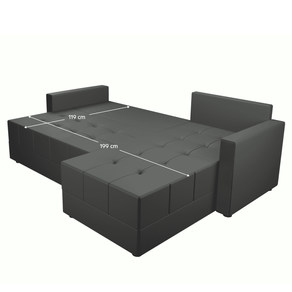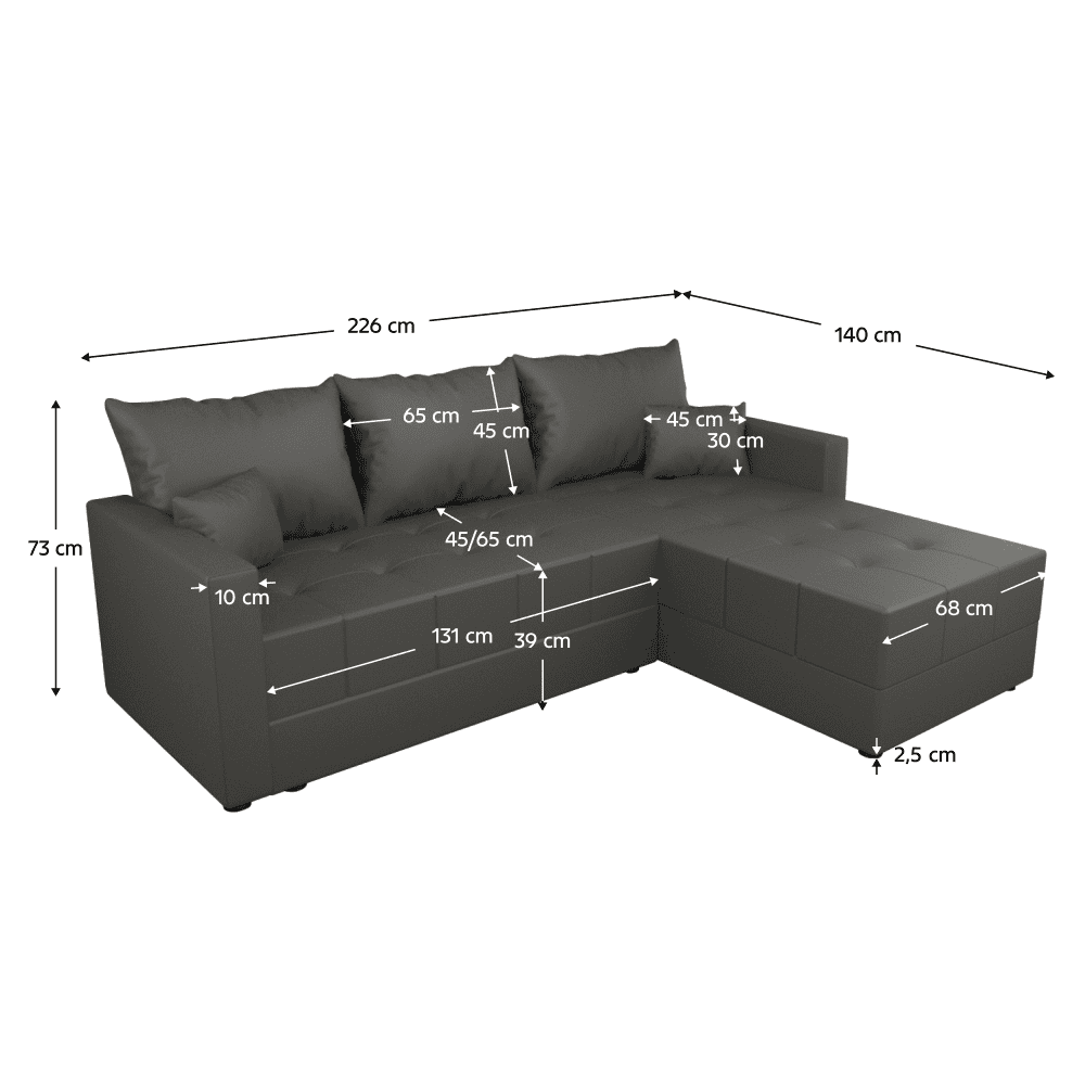 Material: ţesătură Riviera 97 Rezistenţa ţesăturii la frecare conform testului Martindale: 90 000 de cicluri de frecare Culoare: gri Dimensiuni (lxAxh): 226x140x73 cm Extensibilă Suprafaţa pentru dormit (lxL): 119×199 cm Înălţime părţii de şezut: 39 cm Adâncimea părţii de şezut: 45/65 cm Lăţimea părţii de şezut: 131 cm Lăţime otoman: 68 cm Cu picioare Material picioare: plastic Culoare picioare: neagră Înălţimea compartimentului inferior de la podea: 2,5 cm Umplutură: Spumă PUR T28 Design universal De colţ Cu spaţiu de depozitare Livrat cu perne Dimensiuni perne decorative (lxh): 45x30cm Dimensiunile pernei de sprijin (lxh): 65×45 cm Livrat dezasamblat