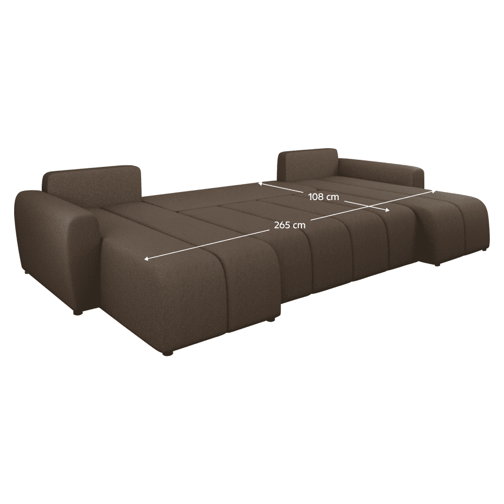 Material: ţesătură Soro 28 Rezistenţa ţesăturii la frecare conform testului Martindale: 90 000 de cicluri de frecare Culoare: maro Dimensiuni (lxAxh): 307×138/138×73/82 cm Extensibilă Suprafaţa pentru dormit (lxL): 108×265 cm Înălţimea părţii de şezut: 39 cm Adâncimea părţii de şezut: 45/65 cm Lăţimea părţii de şezut: 131 cm Cu picioare Material picioare: plastic Culoare picioare: neagră Înălţimea compartimentului inferior de la podea: 2,5 cm Umplutură: Spumă PUR T28 Design universal În formă de U Se colţ Cu spaţiu de depozitare Livrat cu perne Dimensiuni ale pernei spătarului (lxh): 65×45 cm Decorativ matlasat Livrat dezasamblat