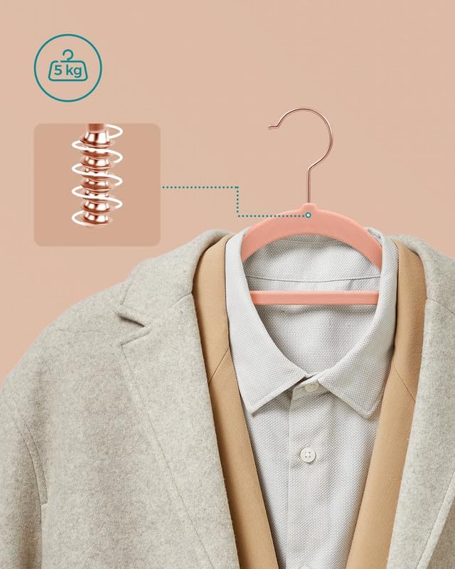 Suprafata antiderapanta: Suprafata de catifea a umeraselor creste frecarea, iar canelurile antiderapante de pe umeri impiedica alunecarea hainelor – chiar si a camasilor de matase.Subtire, dar solid: Fabricate din plastic ABS durabil, aceste umerase de haine sunt subtiri, dar foarte rezistente; fiecare umeras are o capacitate de incarcare statica maxima de 5 kg, astfel incat chiar si paltoanele grele de iarna pot fi agatate fara probleme.Economie de spatiu: Fiecare cuier de catifea are un profil subtire, permitandu-va sa atarnati mai multe haine in acelasi spatiu de dulap; bara centrala poate fi folosita pentru esarfe sau cravate.Carlige din aur roz: Carligele stralucitoare din aur roz se rotesc la 360°, ajutandu-va sa va atarnati hainele in mod ordonat, adaugand in acelasi timp putina stralucire dulapului dvs.Un set de 50 de umerase de catifea de inalta calitate cu carlige stralucitoare din aur roz, rezistente si greu de rupt, si o modalitate mai buna de a va organiza garderoba.