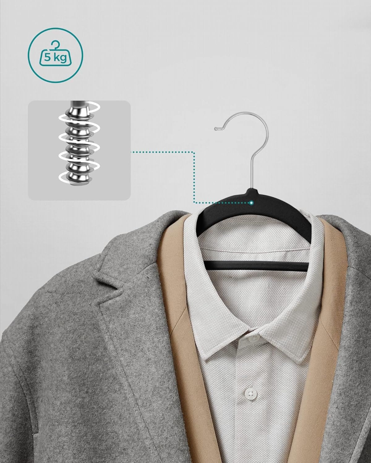 Canelurile antiderapante de pe umeri impiedica alunecarea hainelor – chiar si a camasilor de matase.Fabricate din plastic ABS durabil, aceste umerase de haine sunt subtiri, dar foarte rezistente; fiecare umeras are o capacitate de incarcare statica maxima de 5 kg, astfel incat chiar si paltoanele grele de iarna pot fi agatate fara probleme.Fiecare cuier de catifea are un profil subtire, permitandu-va sa atarnati mai multe haine in acelasi spatiu; bara centrala poate fi folosita pentru esarfe sau cravate.Carligele solide placate cu metal de pe umerase se pot roti la 360°, astfel incat, chiar daca hainele dvs.