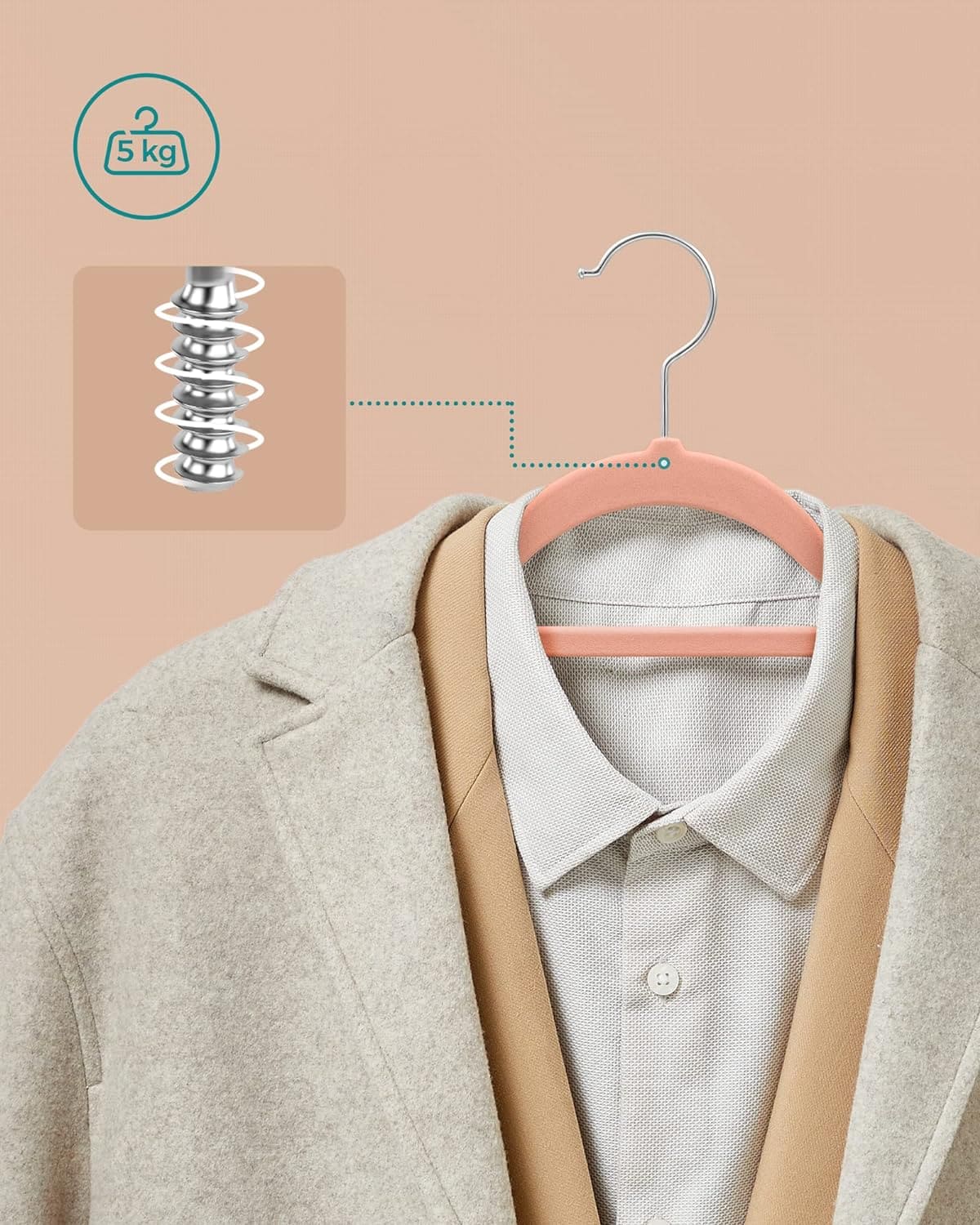 Specificatii: Culoare: Roz deschis Material: Catifea, plastic ABS, carlig metalic Dimensiunea unui singur umeras: 45 x 0,6 x 23,5 cm (L x l x i) Greutatea unui singur cuier: 78 g Capacitate de incarcare statica a unui singur cuier: 5 kg Despre acest articol Canelurile antiderapante de pe umeri impiedica alunecarea hainelor – chiar si a camasilor de matase.Fabricate din plastic ABS durabil, aceste umerase de haine sunt subtiri, dar foarte rezistente; fiecare umeras are o capacitate de incarcare statica maxima de 5 kg, astfel incat chiar si paltoanele grele de iarna pot fi agatate fara probleme.Fiecare cuier de catifea are un profil subtire, permitandu-va sa atarnati mai multe haine in acelasi spatiu; bara centrala poate fi folosita pentru esarfe sau cravate.Carligele argintii lucioase se rotesc la 360°, ajutandu-va sa va atarnati hainele in mod ordonat, adaugand in acelasi timp putina stralucire dulapului dvs.Ce primiti: Un set de 50 de umerase de catifea de inalta calitate cu carlige stralucitoare de culoare argintie, rezistente si greu de rupt, si o modalitate mai buna de a va organiza garderoba.
