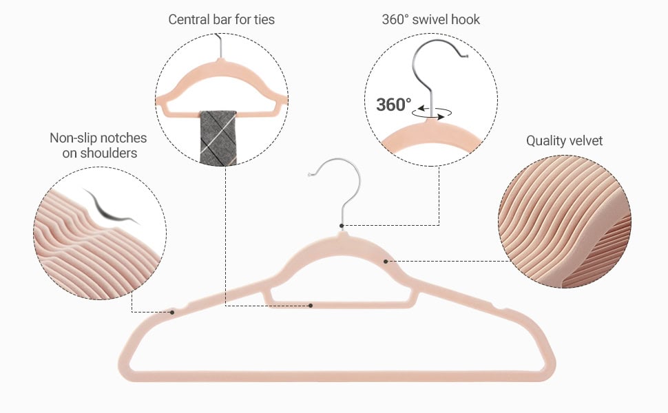 Set de 50 de umerase pentru haine, anti-alunecare cu catifea, bara de cravata si carlig pivotant, 43,5 cm, roz deschis Mob360 – produs disponibil în magazinul Mob360.
