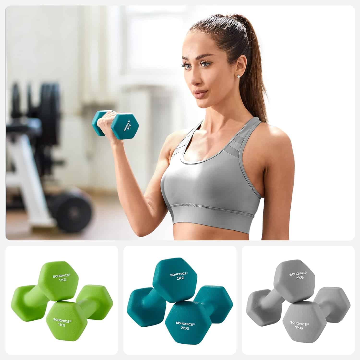 Set de 6 gantere hexagonale cu suport, 2x1kg 2x2kg 2×3 kg, multicolor Mob360 – produs disponibil în magazinul Mob360.