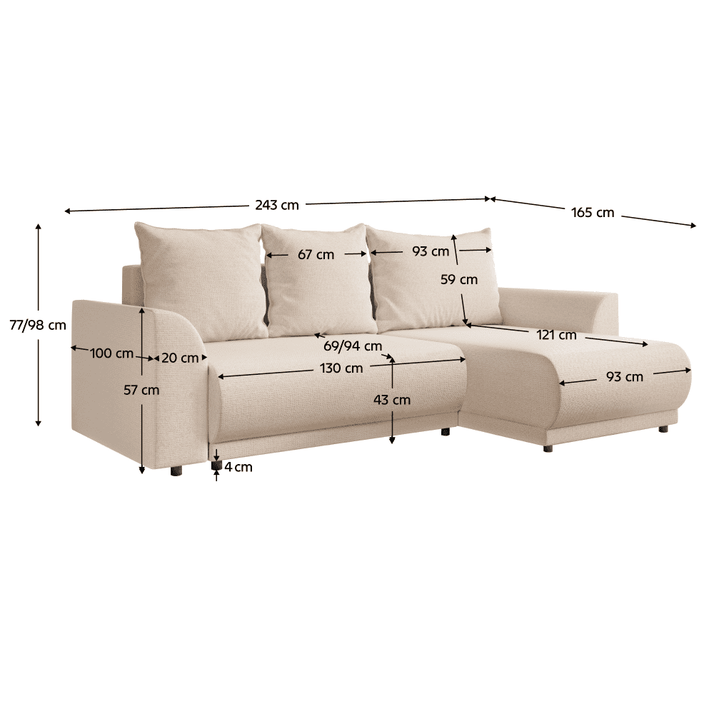 Material: ţesătură Aragon 03 Rezistenţa la frecare a ţesăturii conform testului Martindale: 60 000 de cicluri de frecare Culoare: bej Dimensiuni (lxAxh): 243x165x77/98 cm suprafaţa pentru dormit (lxL): 140×223 cm Înălţimea părţii de şezut: 43 cm Adâncimea părţii de şezut: 69/94 cm Dimensiuni otoman (lxA): 93×121 cm Dimensiuni cotieră (lxAxh): 20x100x57 cm Lăţimea părţii de şezut: 130 cm Universală Complet tapiţată Extensibilă De colţ Cu spaţiu de depozitare Pe picioare Material picioare: plastic Culoare picioare: argintiu Înălţimea spaţiului inferior faţă de podea: 4 cm Umplutură: arc falista/spumă pur Cu perne Dimensiunile pernei mai mari (lxh): 93×59 cm Dimensiunile pernei mai mici (lxh): 67×59 cm Practic Modern Livrat dezasamblată Vă oferim posibilitatea de a alege din 7 versiuni de culoare ale ţesăturii Aragon la preţul de 4 299 Lei. Pentru comenzi personalizate este necesară plata unui avans de 20% din suma respectivă. După achitarea avansului, comanda dumneavoastră va intra în producţie. Termenul de livrare de 6-8 săptămâni.