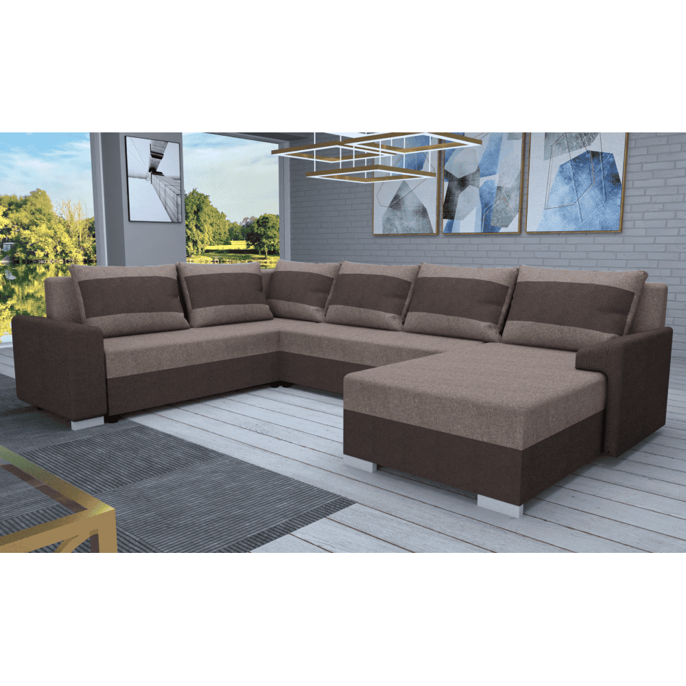 Material: ţesătură Twist 22/03 Rezistenţa la frecare a ţesăturii conform testului Martindale: 45 000 abraziune Culoare: maro închis/maroniu-gri Taupe Dimensiuni (Lxlxh): 294×153/205×75/85 cm Suprafaţa pentru dormit (Lxl): 134×280 cm Înălţime scaun: 40 cm Adâncime scaun: 50/70 cm Lăţime otoman: 81 cm Lăţimea spaţiului liber între fotolii: 136 cm Cu picioare Materialul picioarelor: plastic Culoarea picioarelor: argintiu Înălţimea compartimentului inferior de la podea: 4,5 cm Complet tapiţat Universal (S/D) Colţar în formă de U Extensibil Cu spaţiu de depozitare Umplutură: spumă pur Livrat cu perne Dimensiunea pernei (Lxh): 44×69 cm Livrată dezasamblată