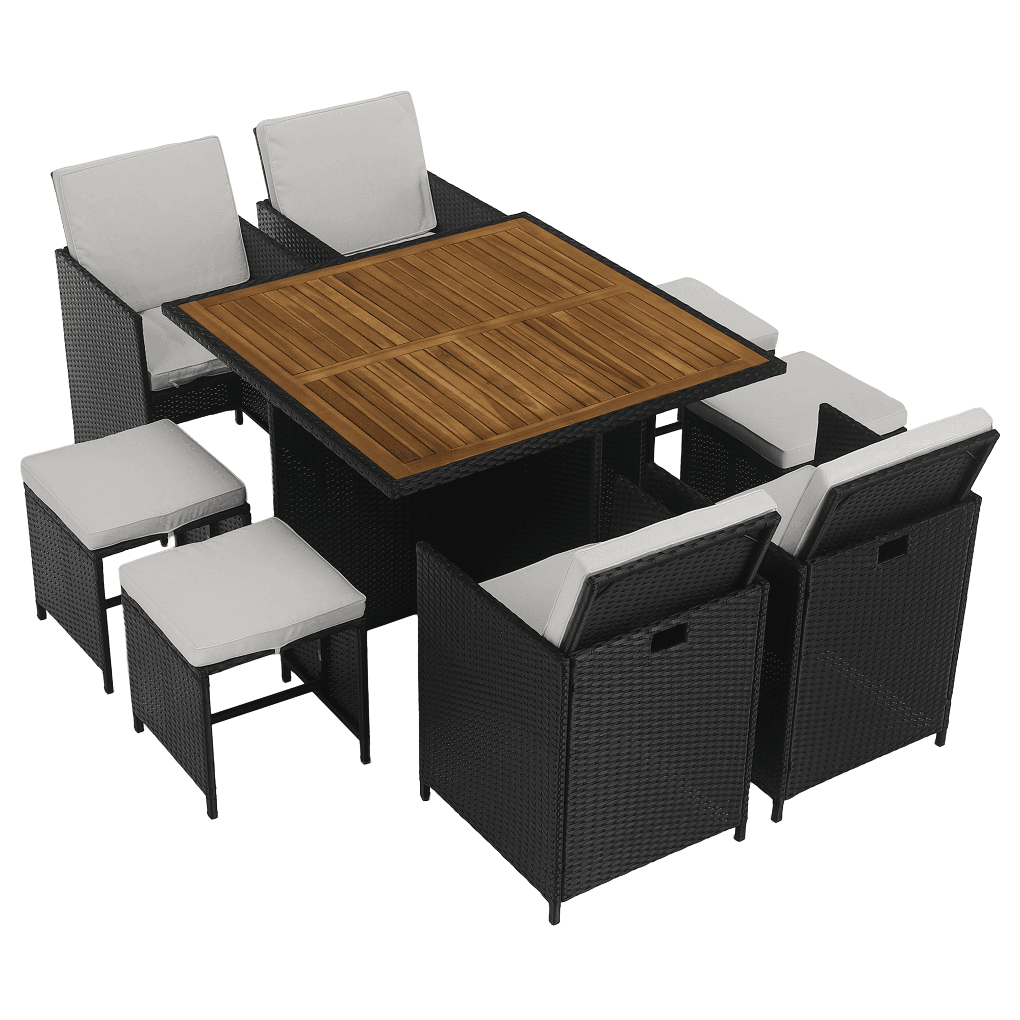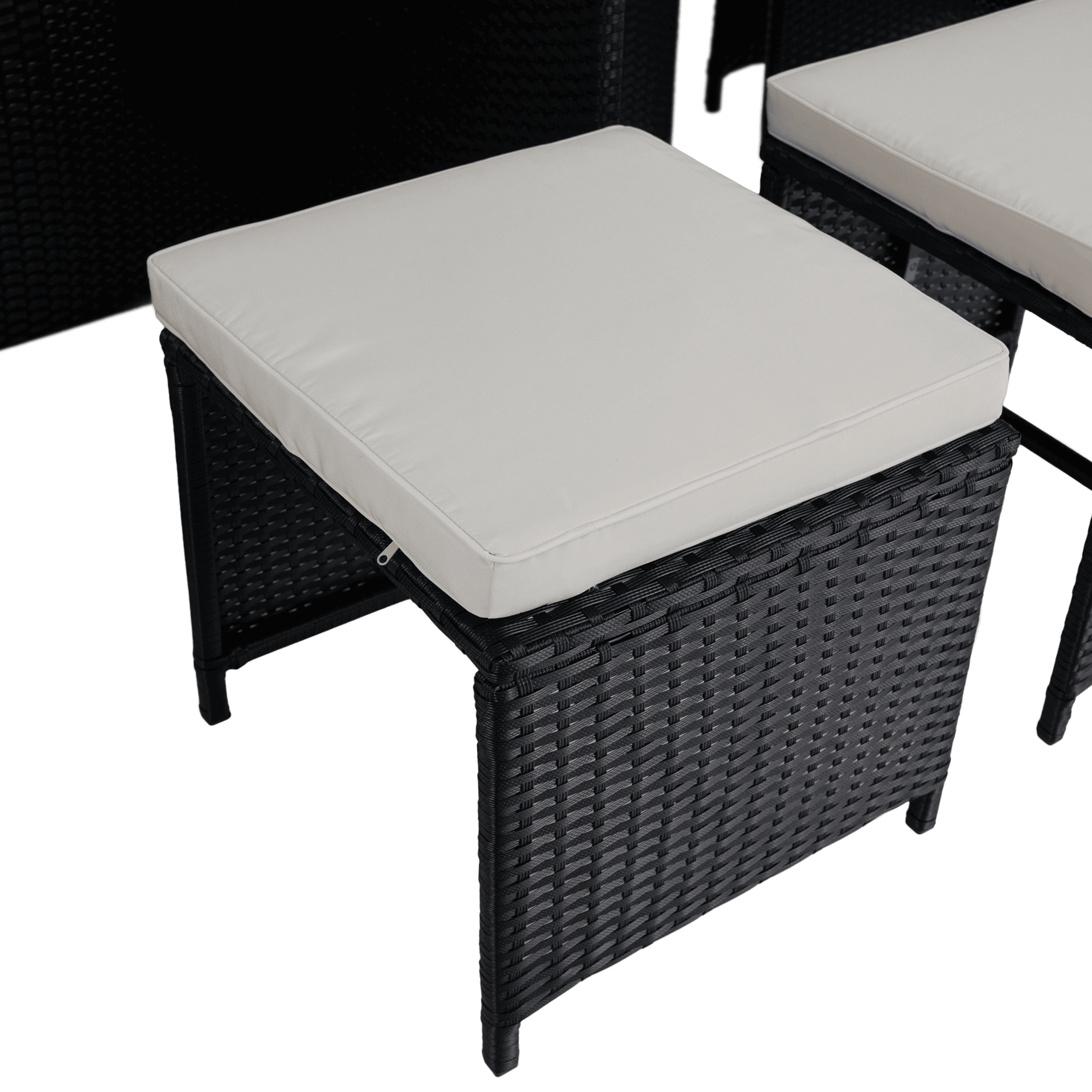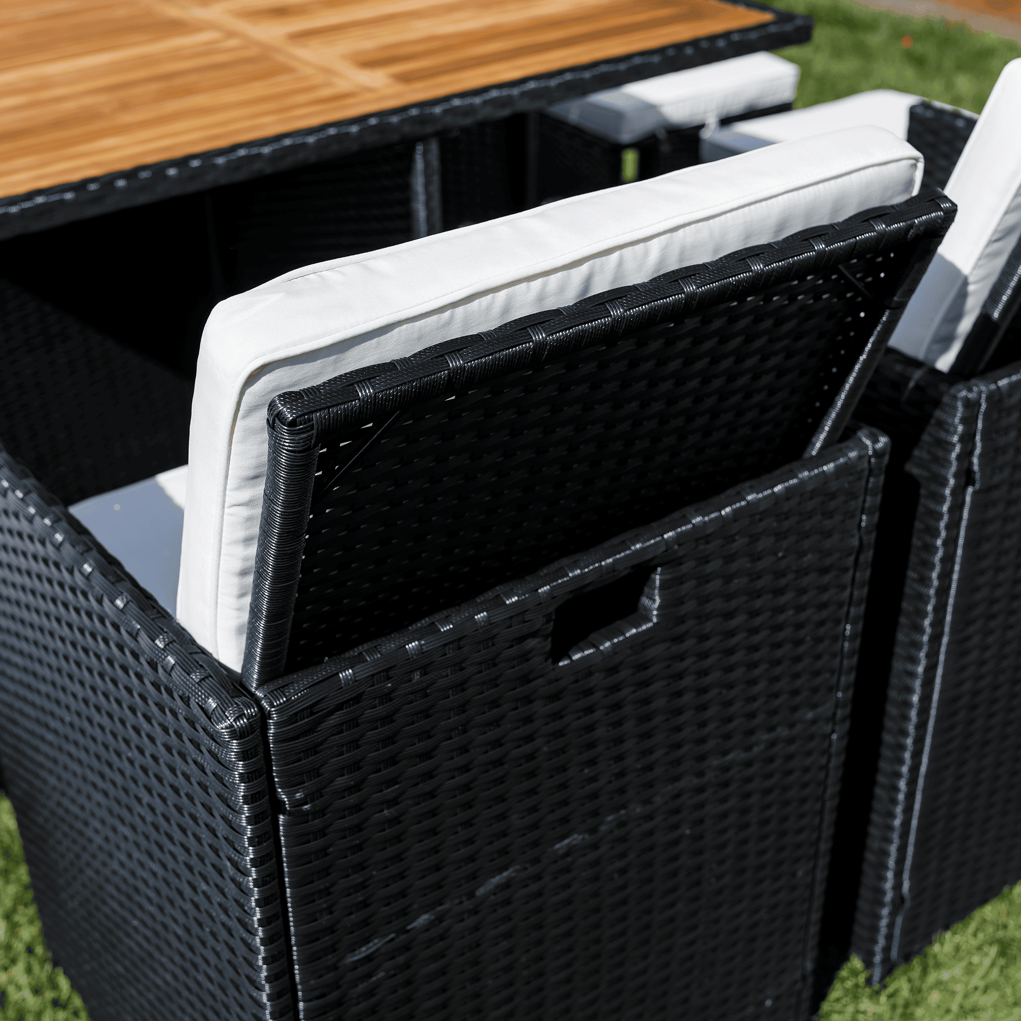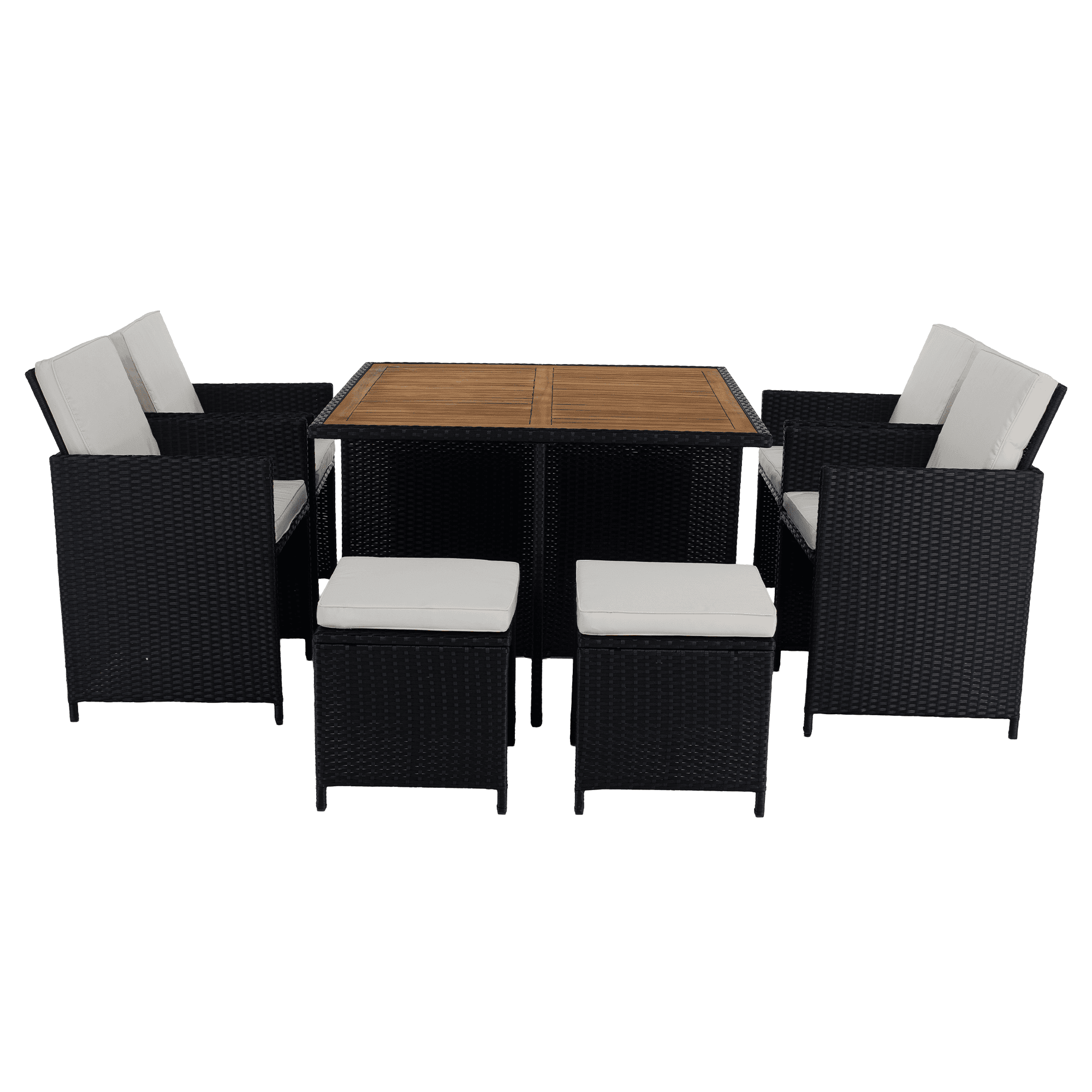 Material: ratan tehnic/oţel/ţesătură/lemn de salcâm masiv Culoare: negru/crem/natural Dimensiuni scaun (lxAxh): 53×58,7×86 cm Înălţimea părţii de şezut cu pernă: 50 cm Înălţimea părţii de şezut fără pernă: 45 cm Lăţimea părţii de şezut: 48 cm Dimensiuni taburet (lxAxh): 41x41x40 cm Înălţimea părţii de şezut cu pernă: 45 cm Înălţimea părţii de şezut fără pernă: 40 cm Dimensiuni masă (lxAxh): 109x109x75 cm Adâncimea părţii de şezut: 40 cm Portanţă pe persoană: 90 kg Set din 9 piese 4x scaun 4x taburet 1x masă Blatul mesei este fabricat din lemn masiv de salcâm Livrat cu perne Grosimea pernei: 5 cm Husă rezistentă la apă detaşabilă Husele pot fi spălate la 30°C Fotoliile şi tabureţii pot fi depozitate sub masă Livrat dezasamblat
