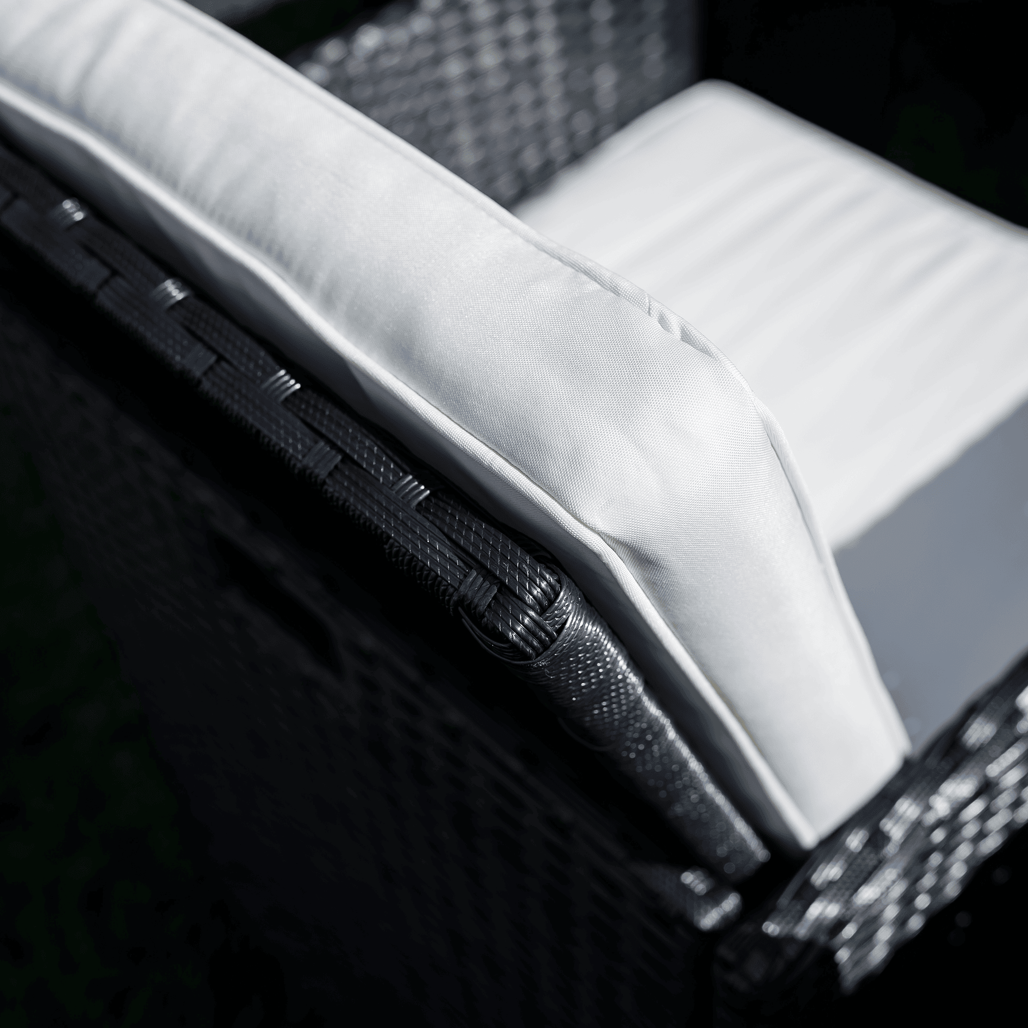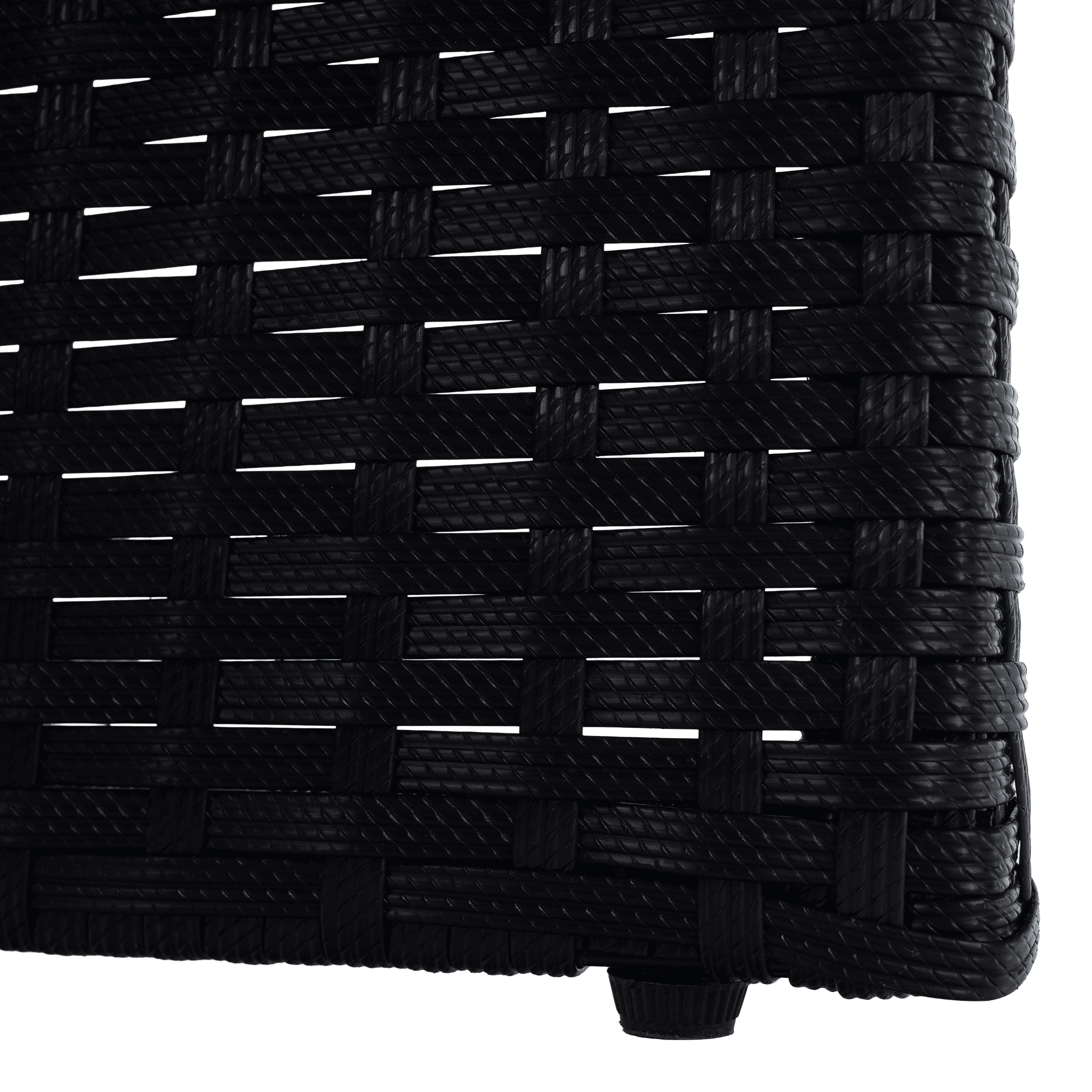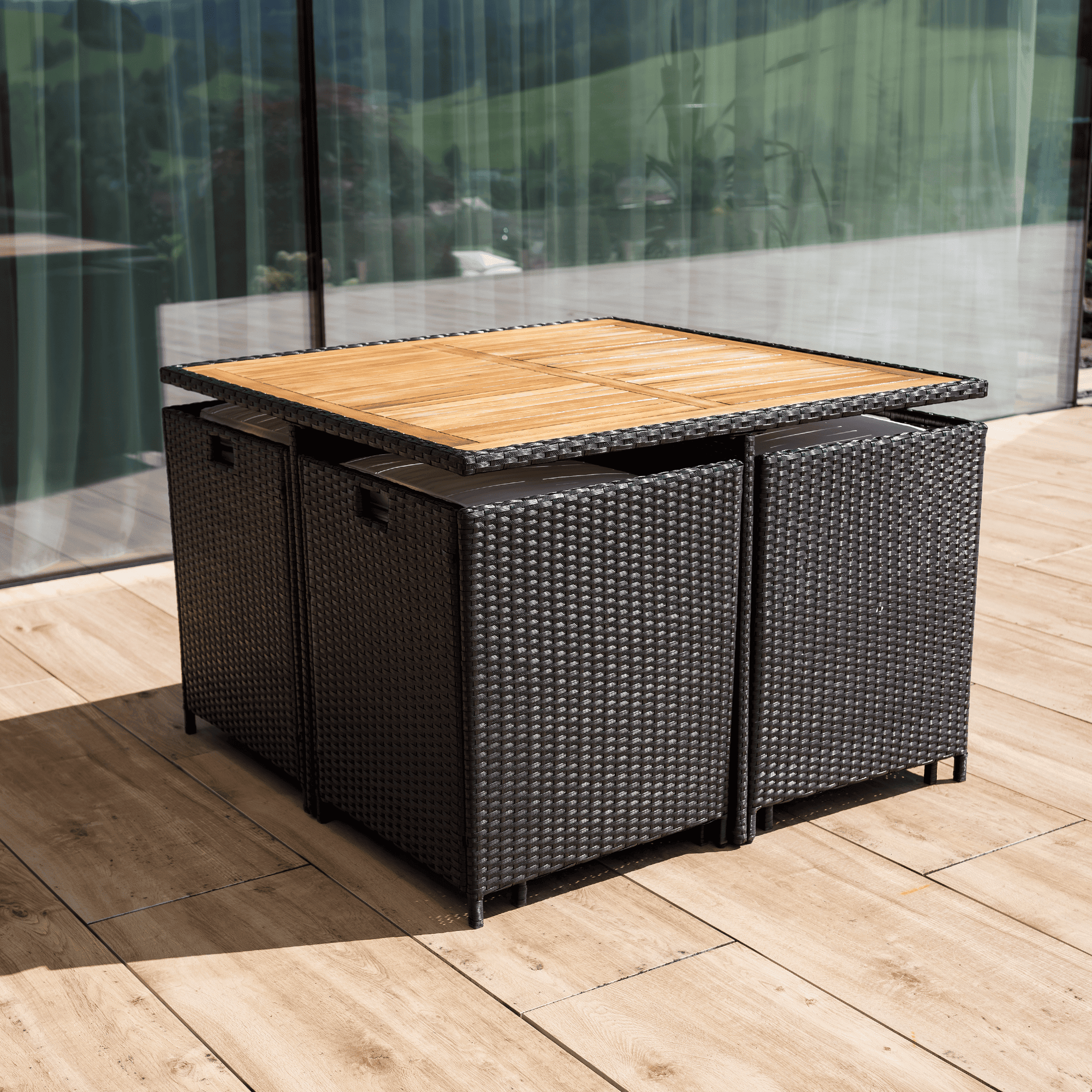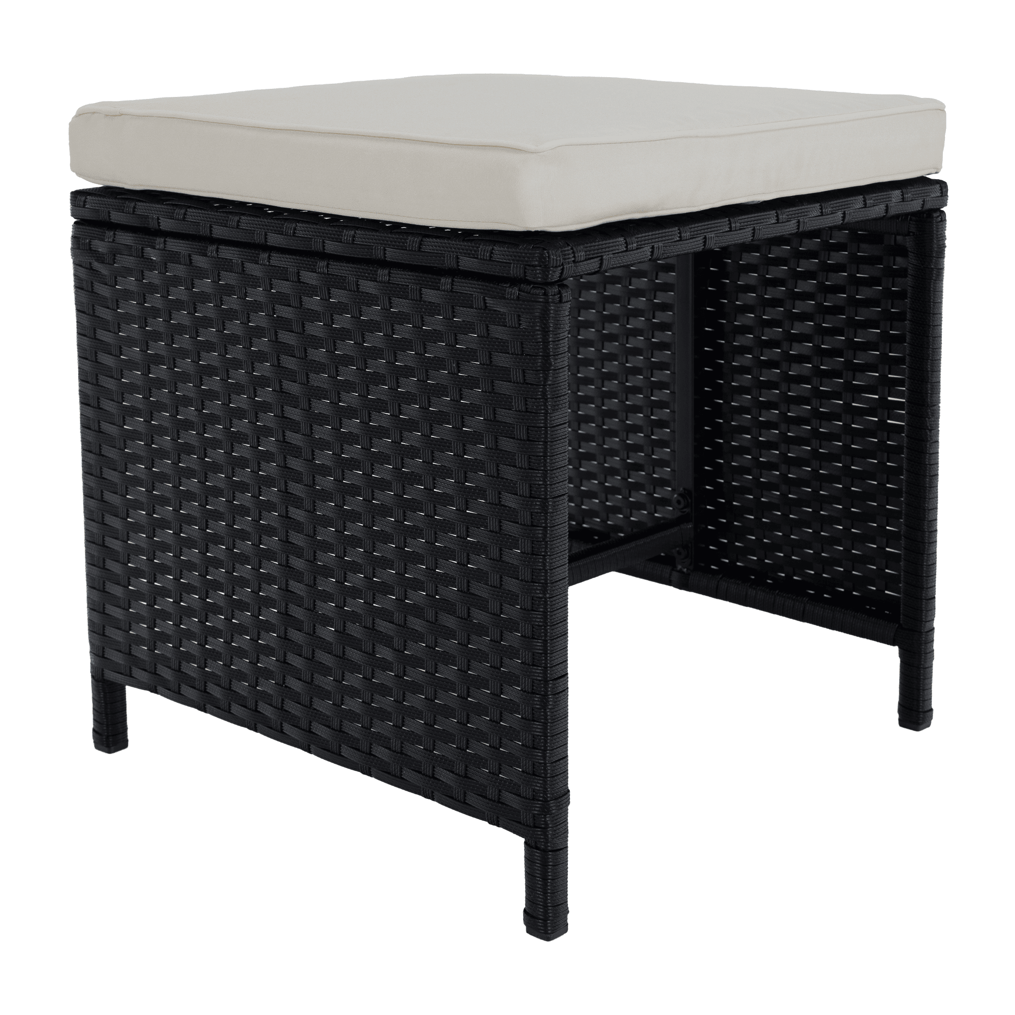 Material: ratan tehnic/oţel/ţesătură/lemn de salcâm masiv Culoare: negru/crem/natural Dimensiuni scaun (lxAxh): 53×58,7×86 cm Înălţimea părţii de şezut cu pernă: 50 cm Înălţimea părţii de şezut fără pernă: 45 cm Lăţimea părţii de şezut: 48 cm Dimensiuni taburet (lxAxh): 41x41x40 cm Înălţimea părţii de şezut cu pernă: 45 cm Înălţimea părţii de şezut fără pernă: 40 cm Dimensiuni masă (lxAxh): 109x109x75 cm Adâncimea părţii de şezut: 40 cm Portanţă pe persoană: 90 kg Set din 9 piese 4x scaun 4x taburet 1x masă Blatul mesei este fabricat din lemn masiv de salcâm Livrat cu perne Grosimea pernei: 5 cm Husă rezistentă la apă detaşabilă Husele pot fi spălate la 30°C Fotoliile şi tabureţii pot fi depozitate sub masă Livrat dezasamblat