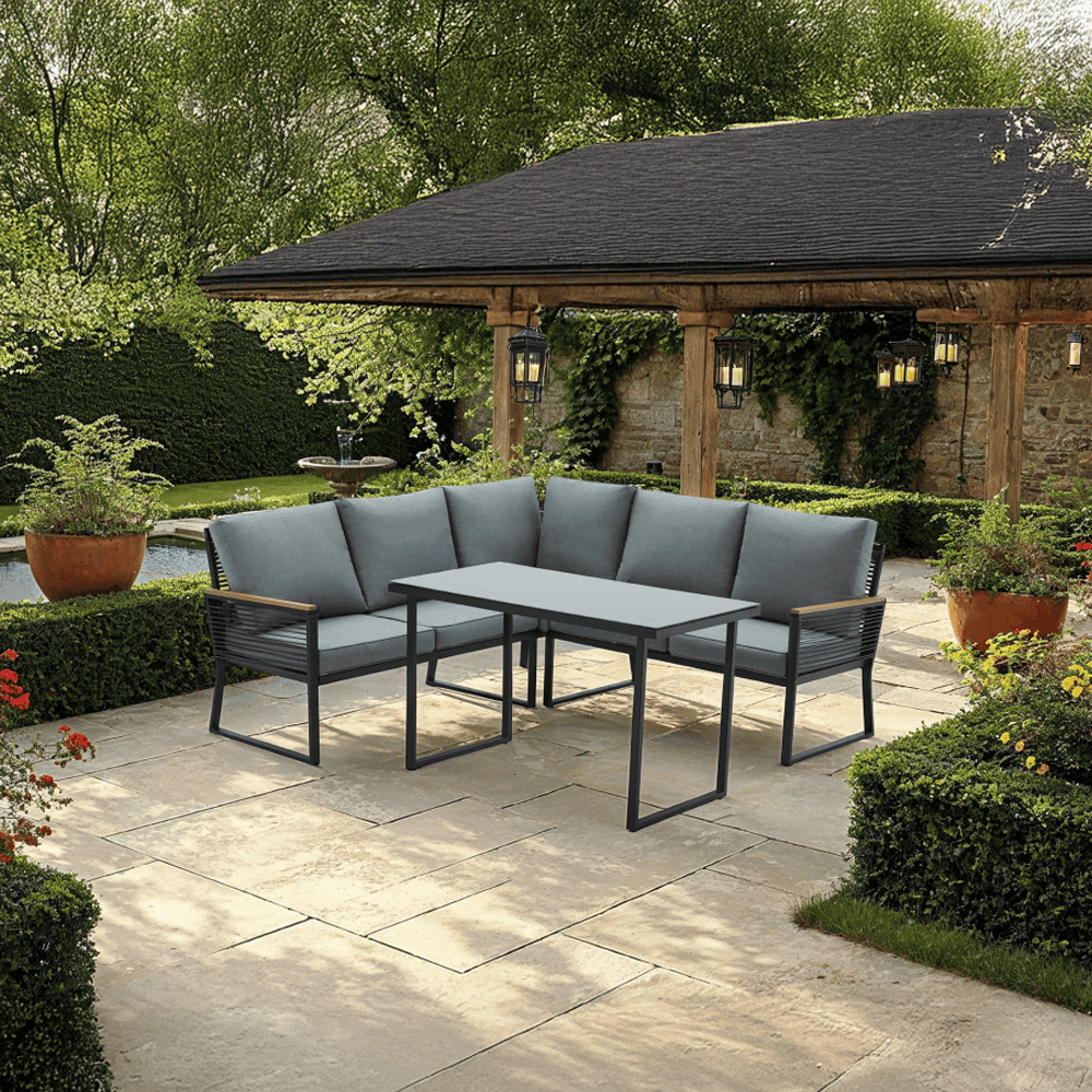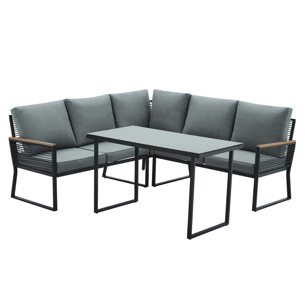 Material: metal/ţesătură/lemn de salcâm/sticlă Rezistenţa la frecare a ţesăturii conform testului Martindale: 95 000 de cicluri de frecare Culoare: negru/alb/natural Dimensiuni (lxAxh): 183/183×66,5×74/84 cm Dimensiuni bancă cu 2 locuri (lxAxh): 118,5×64,5×74/84 cm Dimensiuni colţ (lxAxh): 64,5×64,5×74/84 cm Dimensiunile mesei (lxAxh): 115x58x68 cm Înălţimea părţii de şezut cu pernă: 41 cm Înălţimea părţii de şezut fără pernă: 33 cm Adâncimea părţii de şezut cu pernă: 37 cm Adâncimea părţii de şezut fără perne: 52,5 cm Înălţime spătar cu pernă: 45 cm Portanţă masă: 30 kg Portanţă pe persoană: 90 kg Set de 4 piese Partea de colţ 2x 2 locuri Masă de sufragerie Livrat cu perne Grosimea pernei: 8 cm Husă impermeabilă detaşabilă Husele pot fi spălate la 30 °C Componentele vi le puteţi personaliza în funcţie de necesităţi şi spaţiu Livrat dezasamblat
