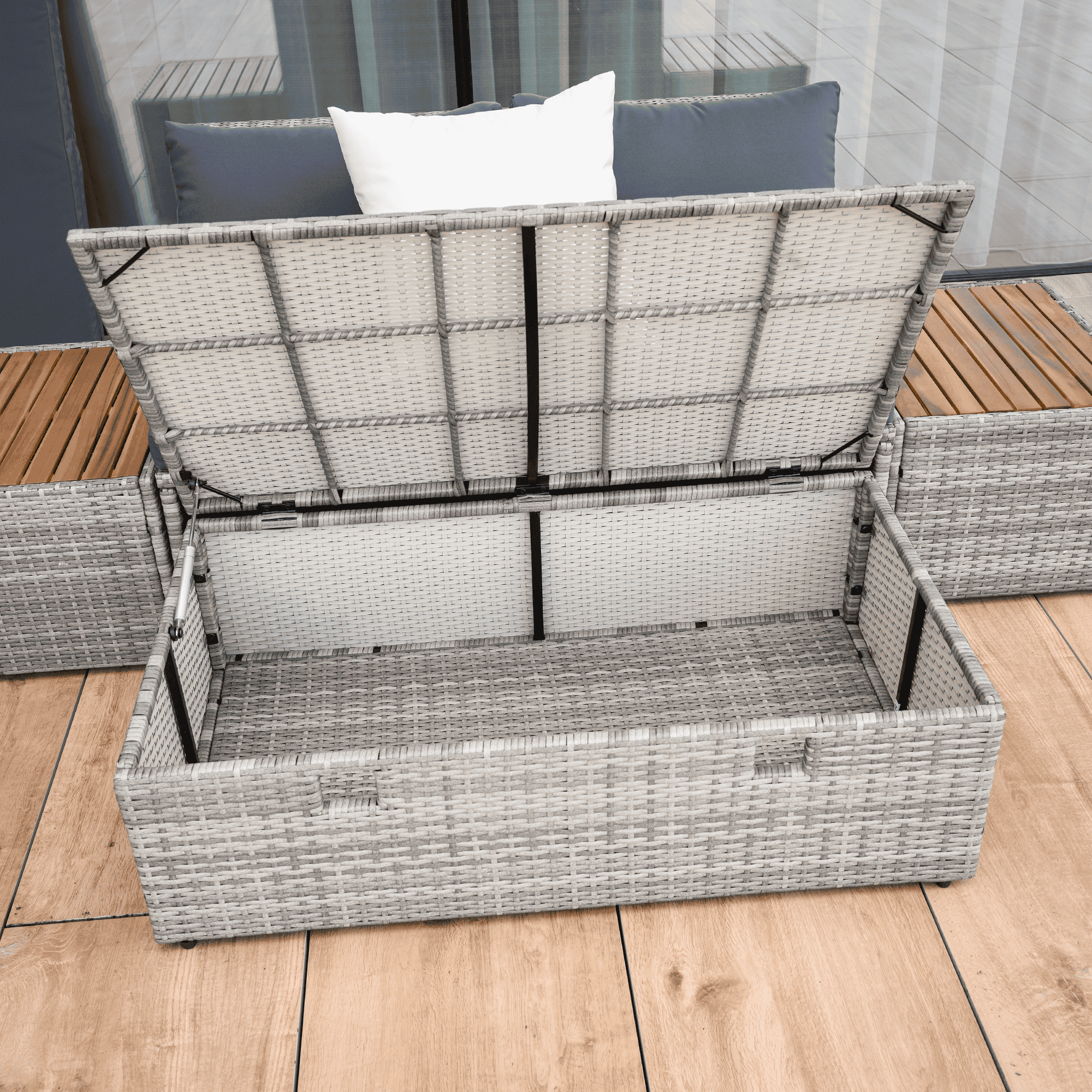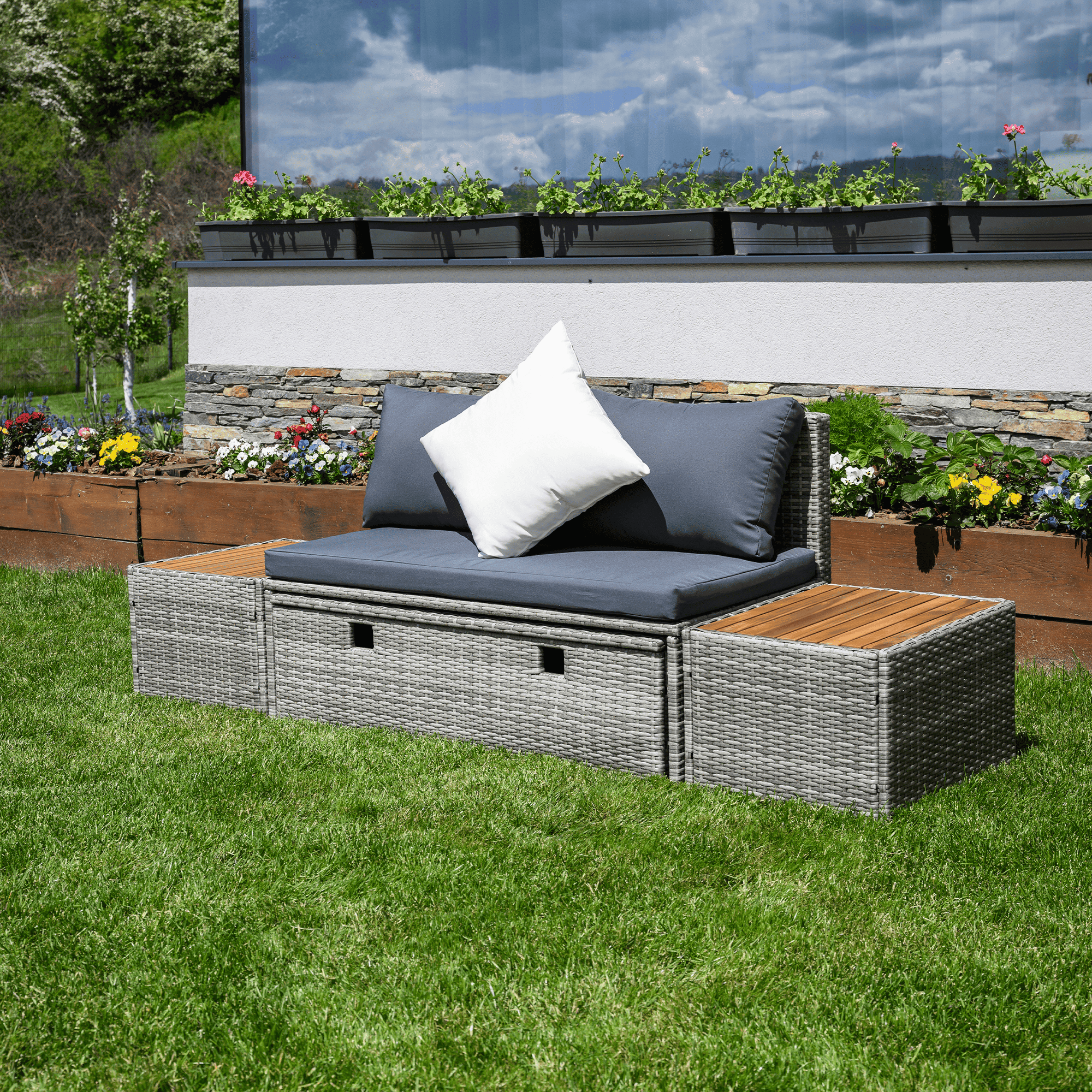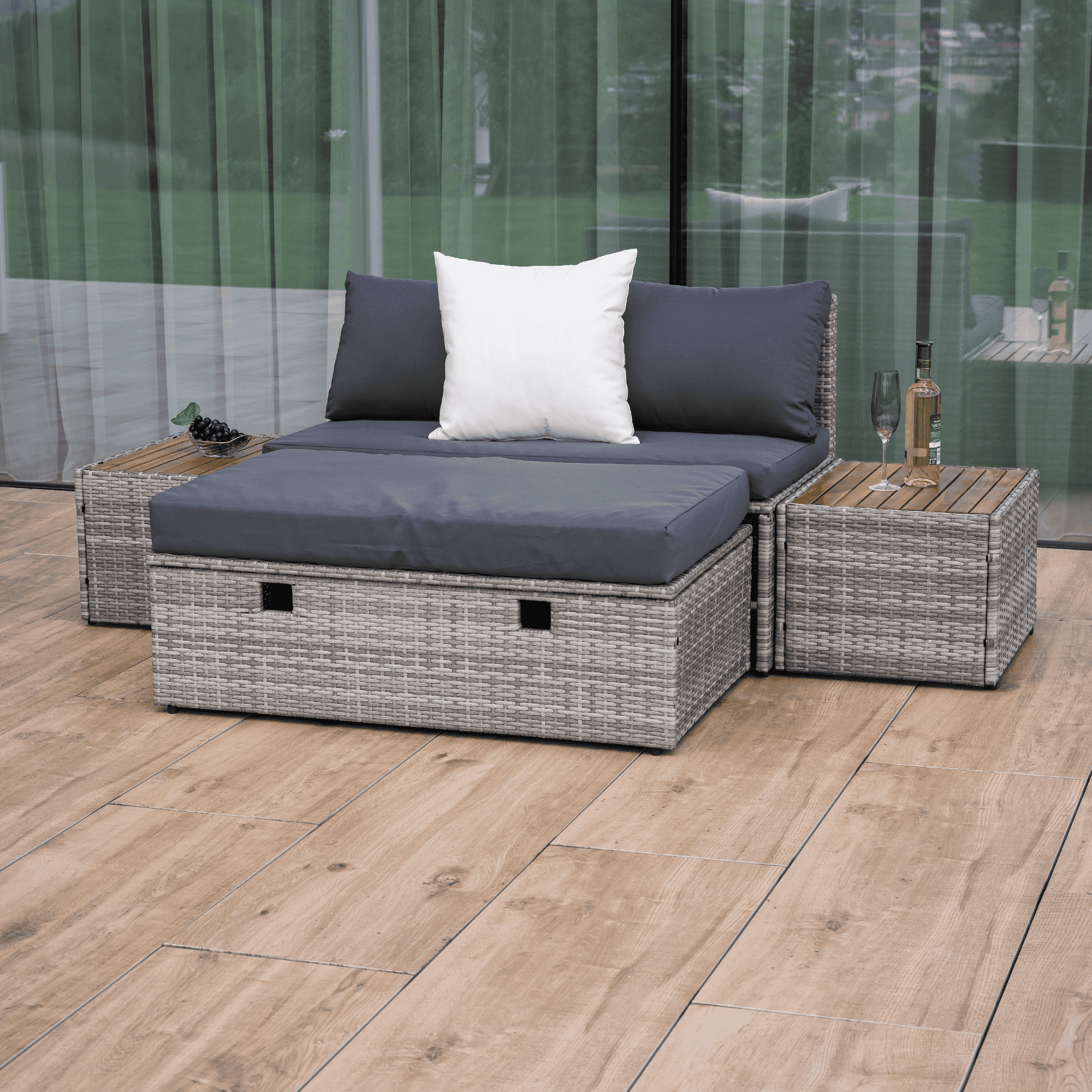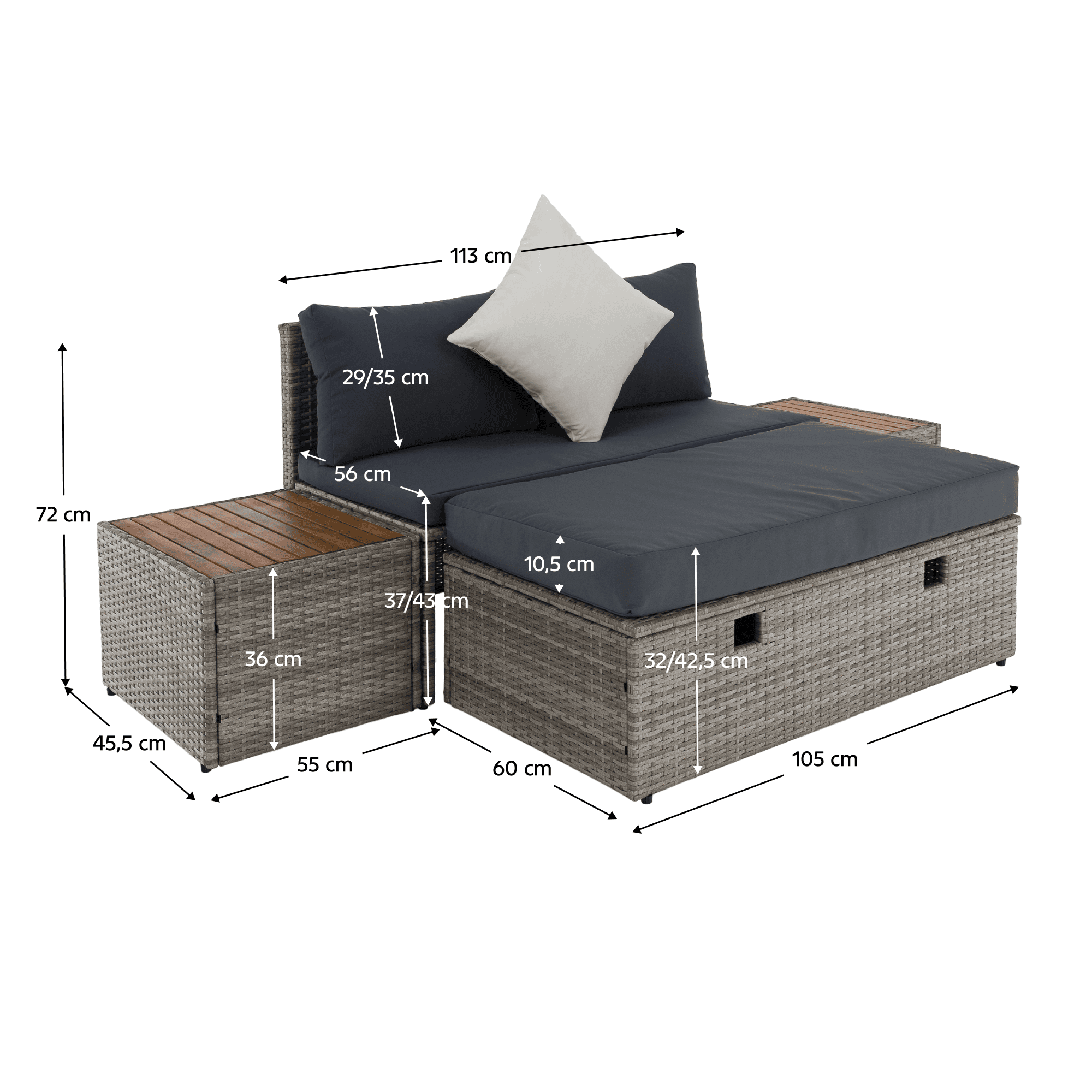 Material: ratan tehnic/oţel/ţesătură/lemn de salcâm Rezistenţa ţesăturii la frecare conform testului Martindale: 95 000 zgârieturi Culoare: gri/crem/natural Dimensiuni canapea (lxAxh): 113×62,5×72 cm Înălţimea părţii de şezut fără pernă: 37 cm Înălţime scaun cu pernă: 43 cm Adâncimea părţii de şezut: 56 cm Lăţime părţii de şezut: 113 cm Dimensiuni bancă (lxAxh): 105x60x32 cm Înălţimea părţii de şezut fără pernă: 32 cm Înălţime scaun cu pernă: 42,5 cm, dimensiunile măsuţei (lxAxh): 44×45,5×36 cm Înălţimea spatelui fără pernă: 39 cm Înălţimea spatelui cu pernă: 29 cm Lăţime spate: 113 cm Portanţă: 90 kg de persoană Portanţă măsuţă: 30 kg Greutate: 31,5 kg Set din 4 piese Canapea Bancă 2x măsuţă auxiliară Livrat cu perne Husă detaşabilă şi rezistentă la apă Husa poate fi spălată la temperatura de 30°C Husele nu se usucă în uscător, nu se foloseşte înălbitor, nu se curăţă chimic şi nu se calcă Capacul băncii poate fi deschis cu piston hidraulic Potrivit pentru unelte de grădină, jucării, perne, pături, şezut Banca poate fi împinsă sub canapea Utilizare versatilă Design modern Design natural Potrivită pentru exterior Rezistent la intemperii Vă recomandăm să protejaţi produsul de intemperii pentru a prelungi durata de viaţă a produsului Livrat dezasamblat
