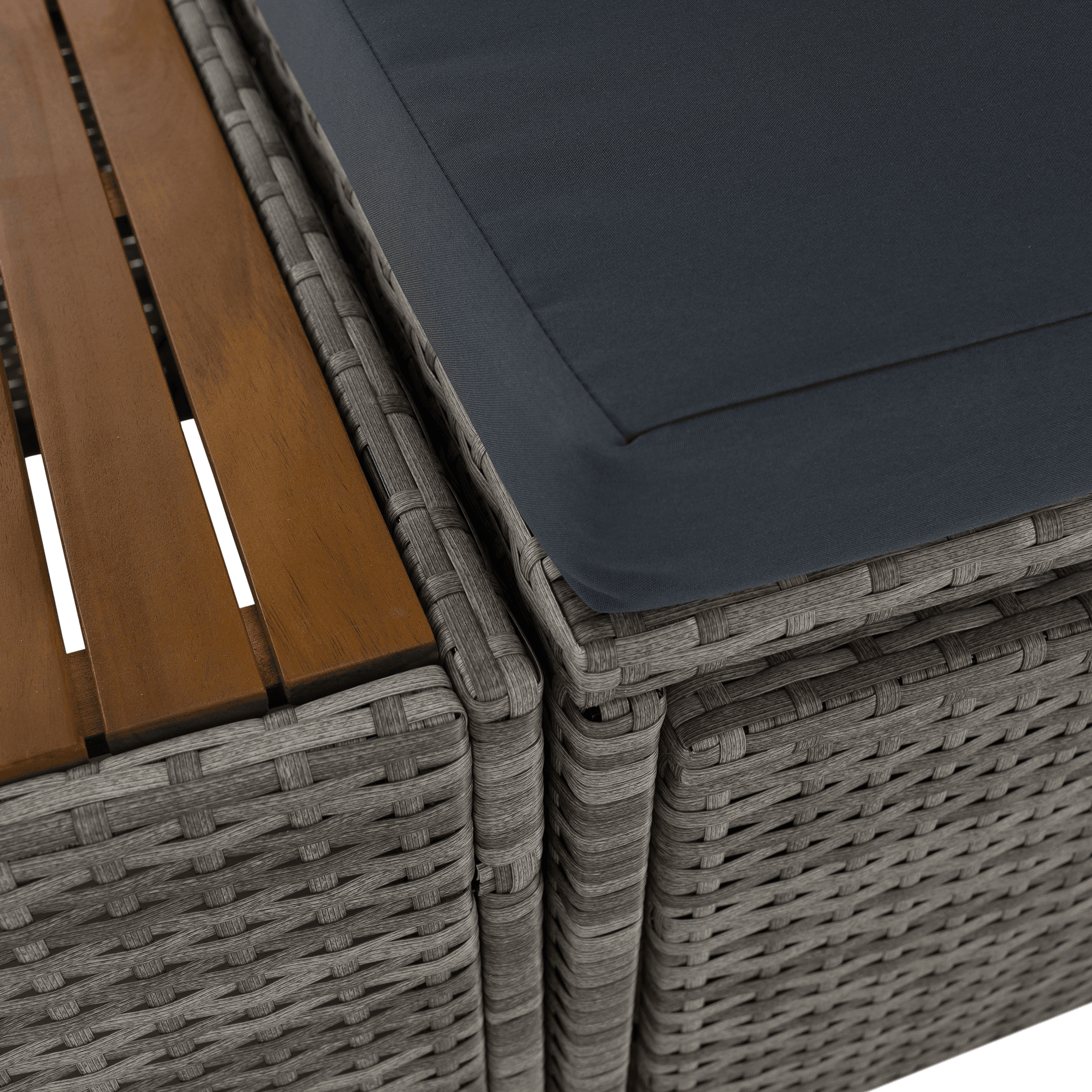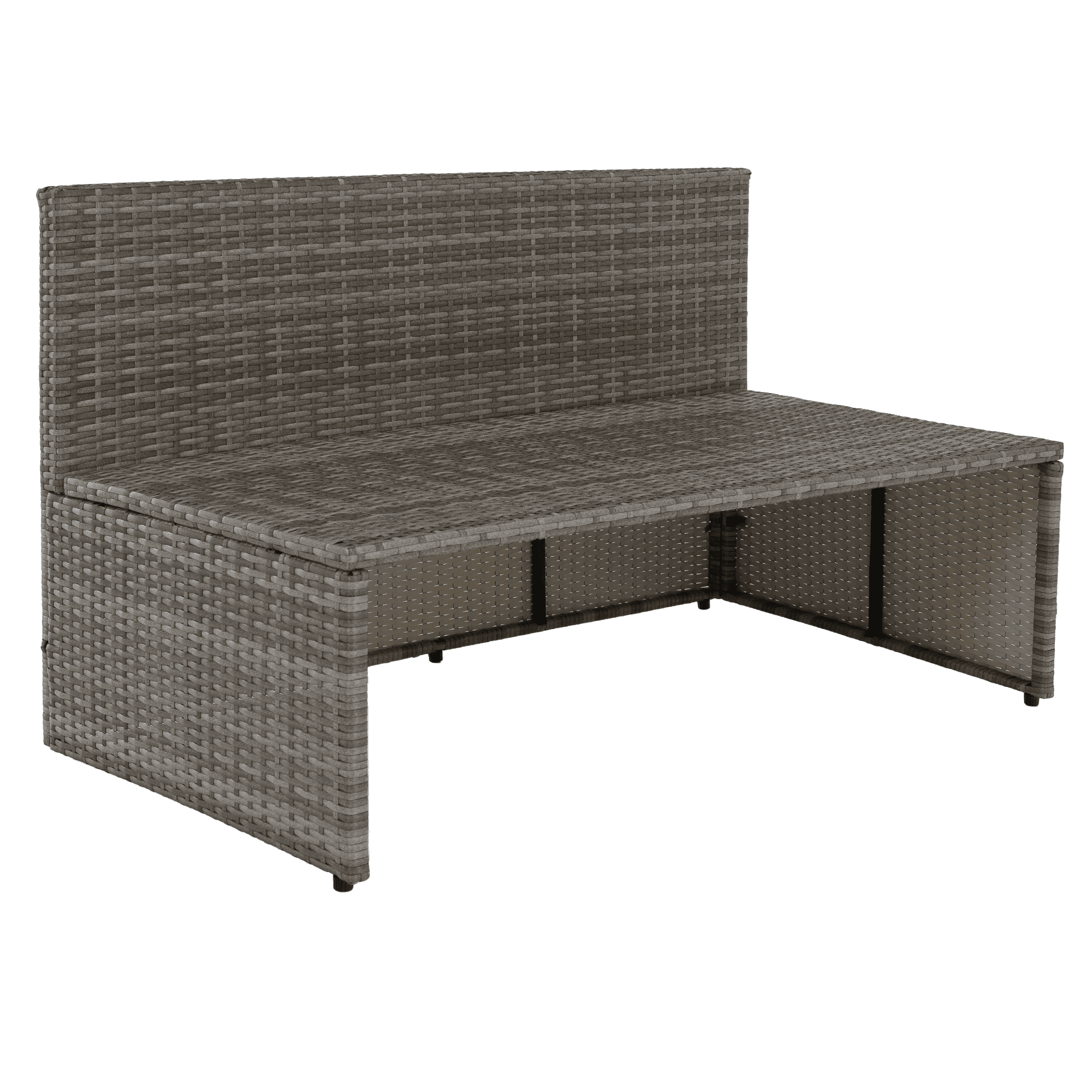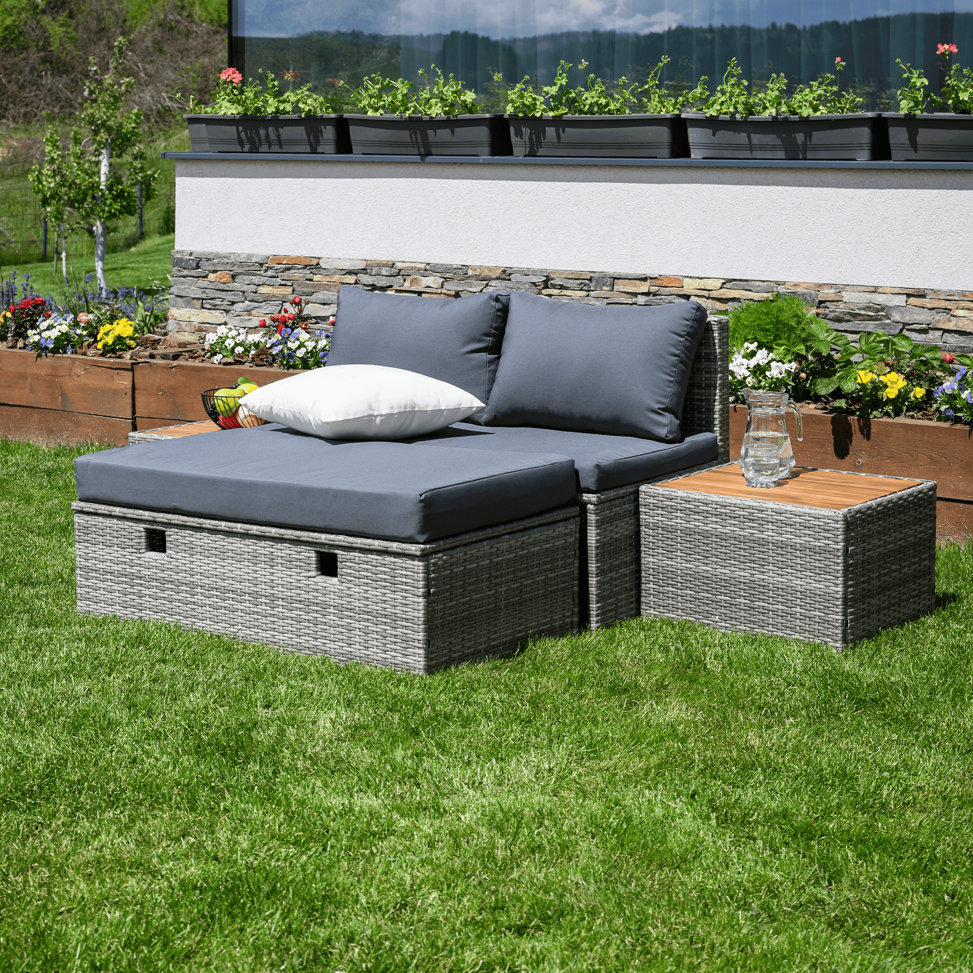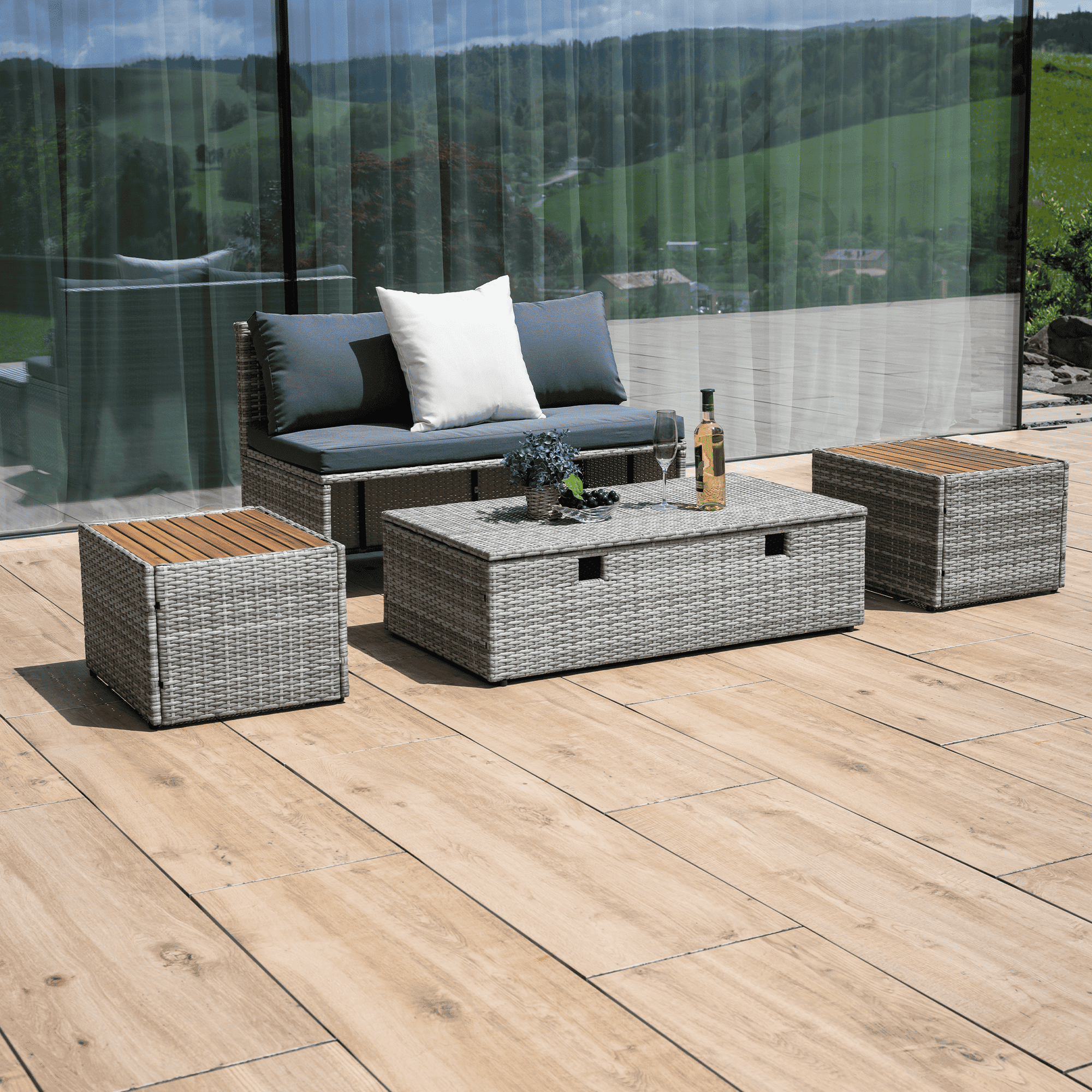 Material: ratan tehnic/oţel/ţesătură/lemn de salcâm Rezistenţa ţesăturii la frecare conform testului Martindale: 95 000 zgârieturi Culoare: gri/crem/natural Dimensiuni canapea (lxAxh): 113×62,5×72 cm Înălţimea părţii de şezut fără pernă: 37 cm Înălţime scaun cu pernă: 43 cm Adâncimea părţii de şezut: 56 cm Lăţime părţii de şezut: 113 cm Dimensiuni bancă (lxAxh): 105x60x32 cm Înălţimea părţii de şezut fără pernă: 32 cm Înălţime scaun cu pernă: 42,5 cm, dimensiunile măsuţei (lxAxh): 44×45,5×36 cm Înălţimea spatelui fără pernă: 39 cm Înălţimea spatelui cu pernă: 29 cm Lăţime spate: 113 cm Portanţă: 90 kg de persoană Portanţă măsuţă: 30 kg Greutate: 31,5 kg Set din 4 piese Canapea Bancă 2x măsuţă auxiliară Livrat cu perne Husă detaşabilă şi rezistentă la apă Husa poate fi spălată la temperatura de 30°C Husele nu se usucă în uscător, nu se foloseşte înălbitor, nu se curăţă chimic şi nu se calcă Capacul băncii poate fi deschis cu piston hidraulic Potrivit pentru unelte de grădină, jucării, perne, pături, şezut Banca poate fi împinsă sub canapea Utilizare versatilă Design modern Design natural Potrivită pentru exterior Rezistent la intemperii Vă recomandăm să protejaţi produsul de intemperii pentru a prelungi durata de viaţă a produsului Livrat dezasamblat