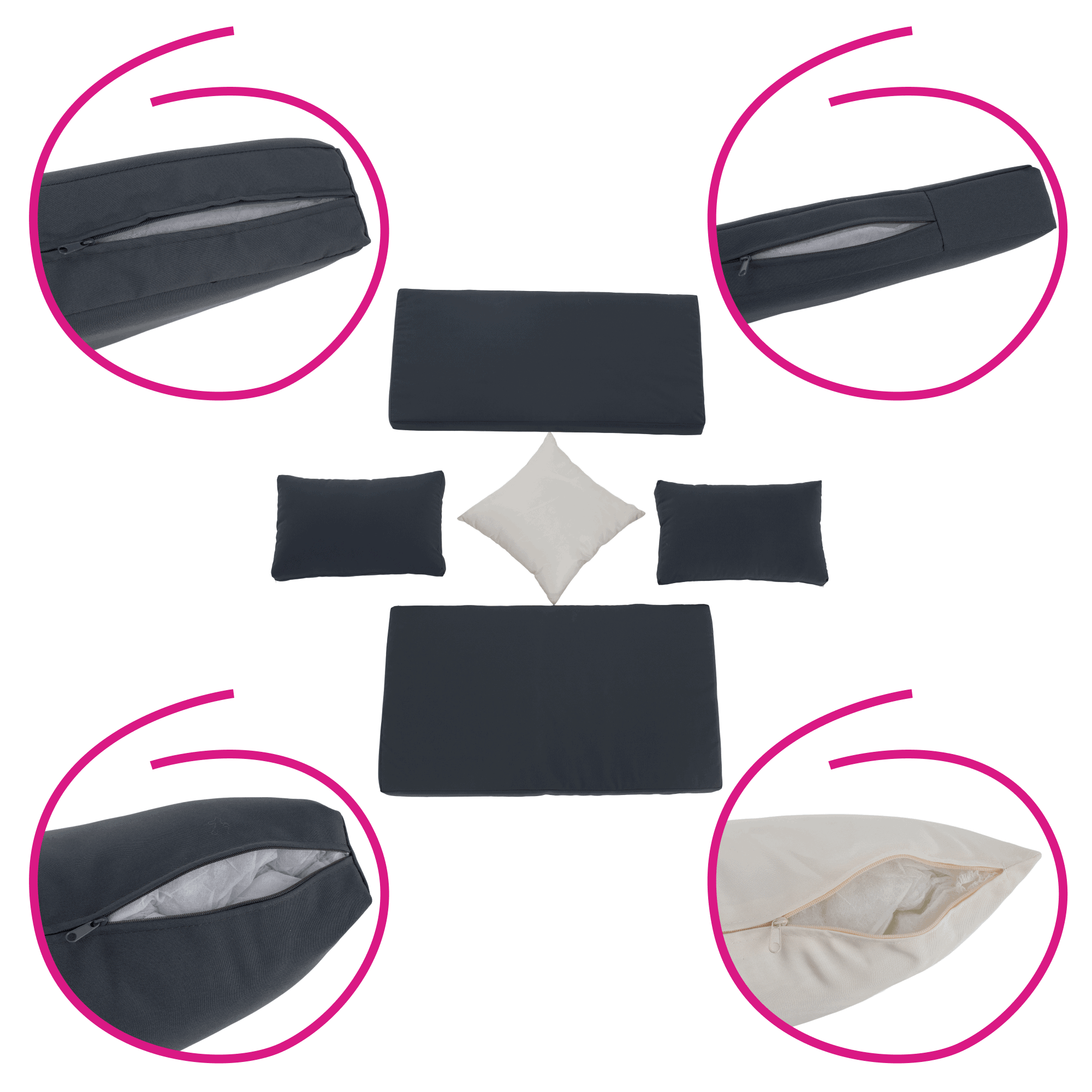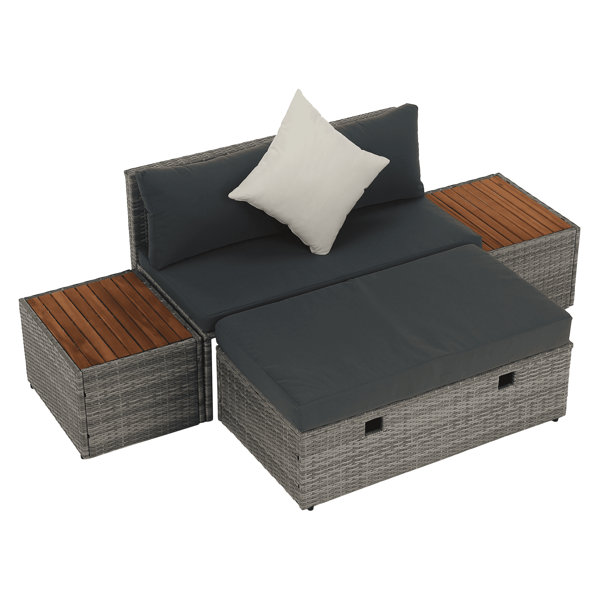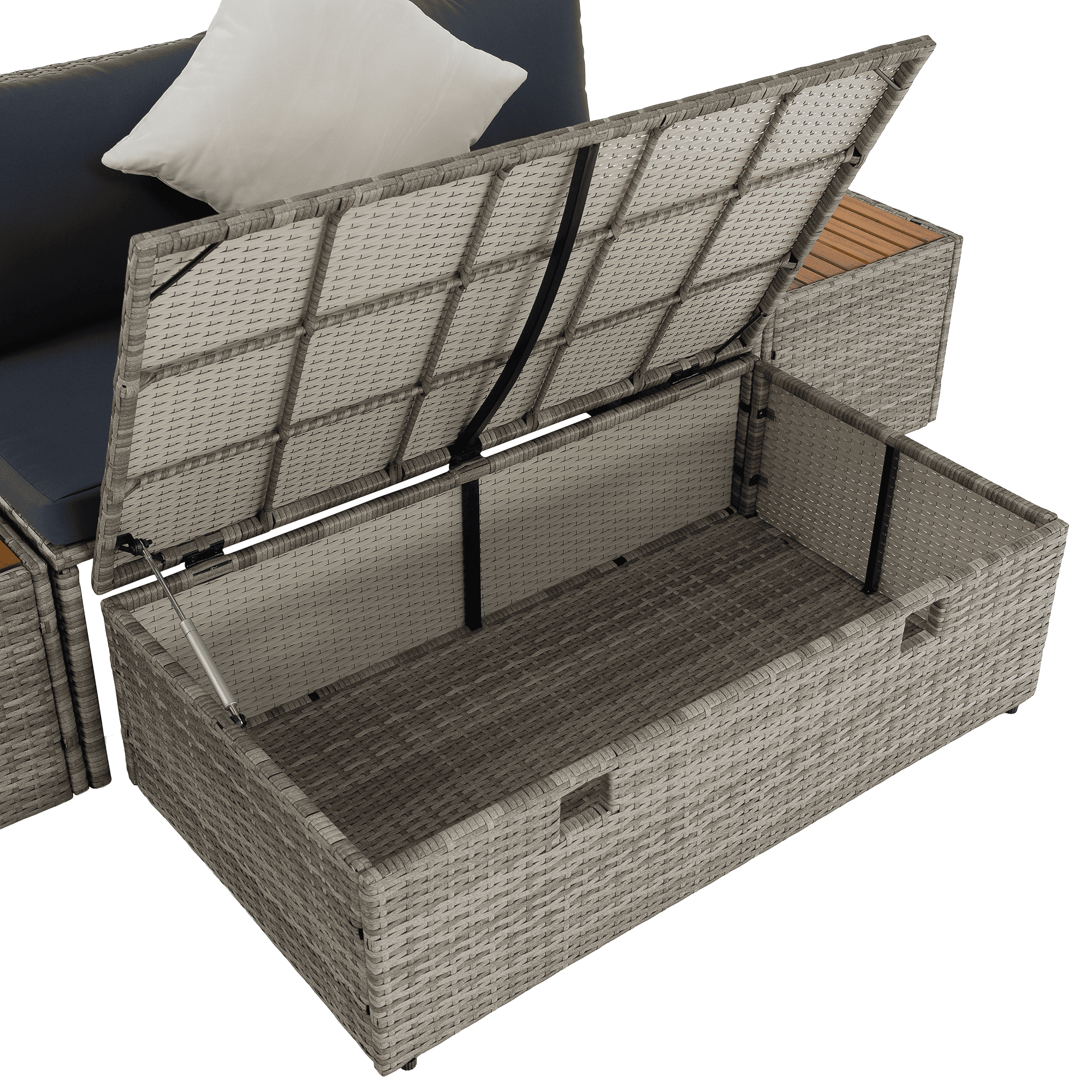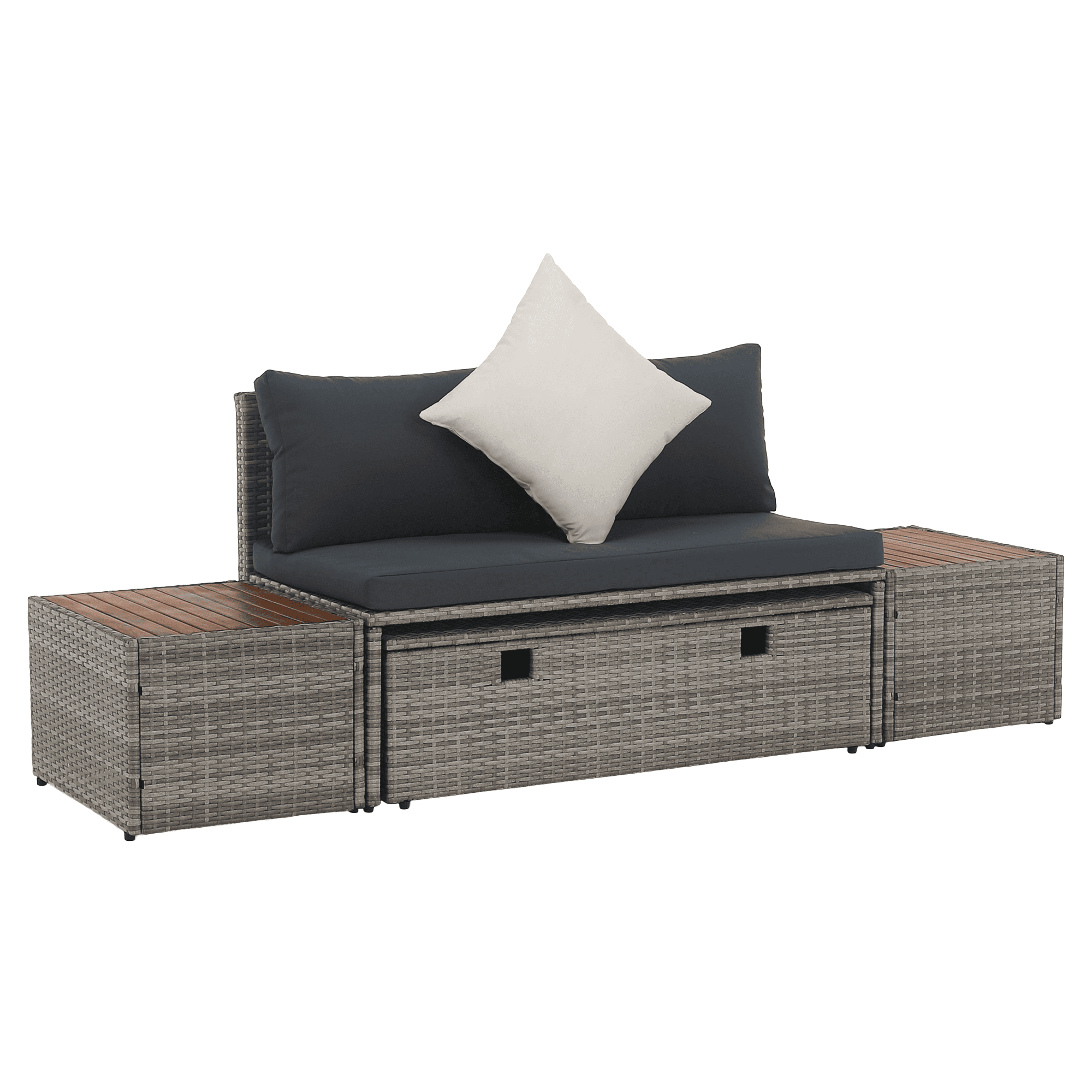 Material: ratan tehnic/oţel/ţesătură/lemn de salcâm Rezistenţa ţesăturii la frecare conform testului Martindale: 95 000 zgârieturi Culoare: gri/crem/natural Dimensiuni canapea (lxAxh): 113×62,5×72 cm Înălţimea părţii de şezut fără pernă: 37 cm Înălţime scaun cu pernă: 43 cm Adâncimea părţii de şezut: 56 cm Lăţime părţii de şezut: 113 cm Dimensiuni bancă (lxAxh): 105x60x32 cm Înălţimea părţii de şezut fără pernă: 32 cm Înălţime scaun cu pernă: 42,5 cm, dimensiunile măsuţei (lxAxh): 44×45,5×36 cm Înălţimea spatelui fără pernă: 39 cm Înălţimea spatelui cu pernă: 29 cm Lăţime spate: 113 cm Portanţă: 90 kg de persoană Portanţă măsuţă: 30 kg Greutate: 31,5 kg Set din 4 piese Canapea Bancă 2x măsuţă auxiliară Livrat cu perne Husă detaşabilă şi rezistentă la apă Husa poate fi spălată la temperatura de 30°C Husele nu se usucă în uscător, nu se foloseşte înălbitor, nu se curăţă chimic şi nu se calcă Capacul băncii poate fi deschis cu piston hidraulic Potrivit pentru unelte de grădină, jucării, perne, pături, şezut Banca poate fi împinsă sub canapea Utilizare versatilă Design modern Design natural Potrivită pentru exterior Rezistent la intemperii Vă recomandăm să protejaţi produsul de intemperii pentru a prelungi durata de viaţă a produsului Livrat dezasamblat