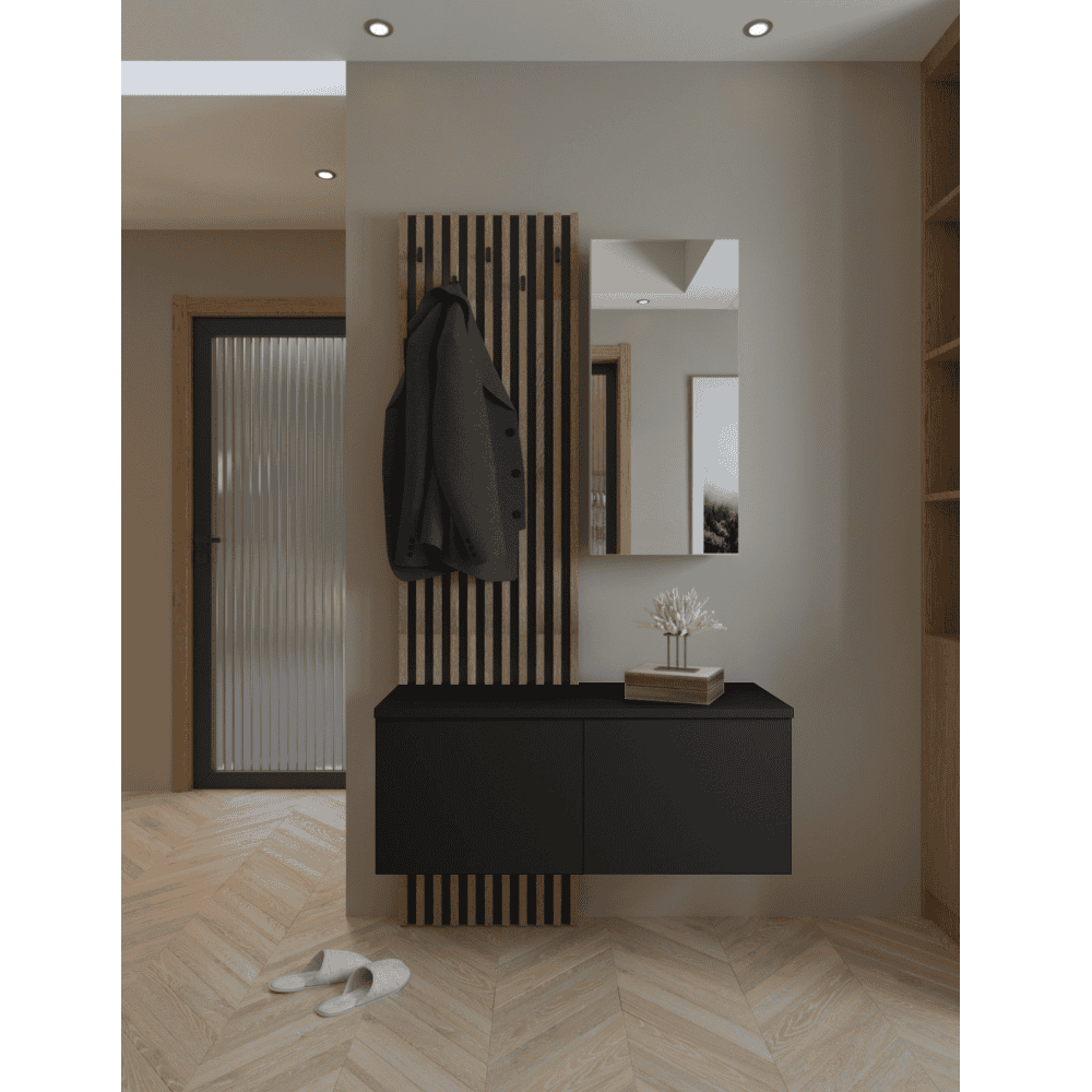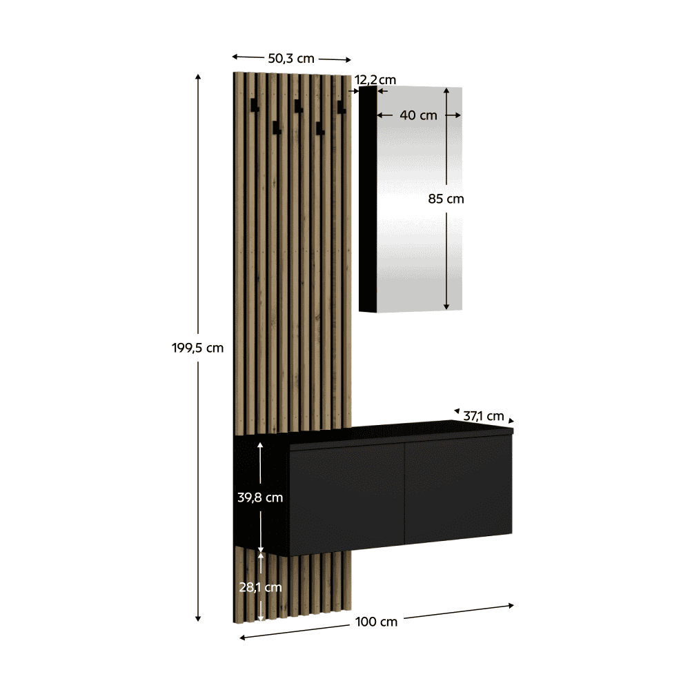 Material: DTD laminat/sticlă culoare: negru/stejar artisan Dimensiuni (lxAxh): 100×37,1×195,5 cm Grosime material: 1,6 cm Grosimea lamelelor: 2,2 cm Panou Pantofar Dulap Oglindă Universal Cu poliţe Oglindă 5 cârlige Material cârlige: Cârlig din plastic Culoare: Negru Raft Portanţă Dulap oglindă: 5 kg Portanţă poliţă de pantofar: 7 kg Uşa se deschide cu un mecanism push up Vă recomandăm să o ataşaţi la perete Livrat dezasamblat