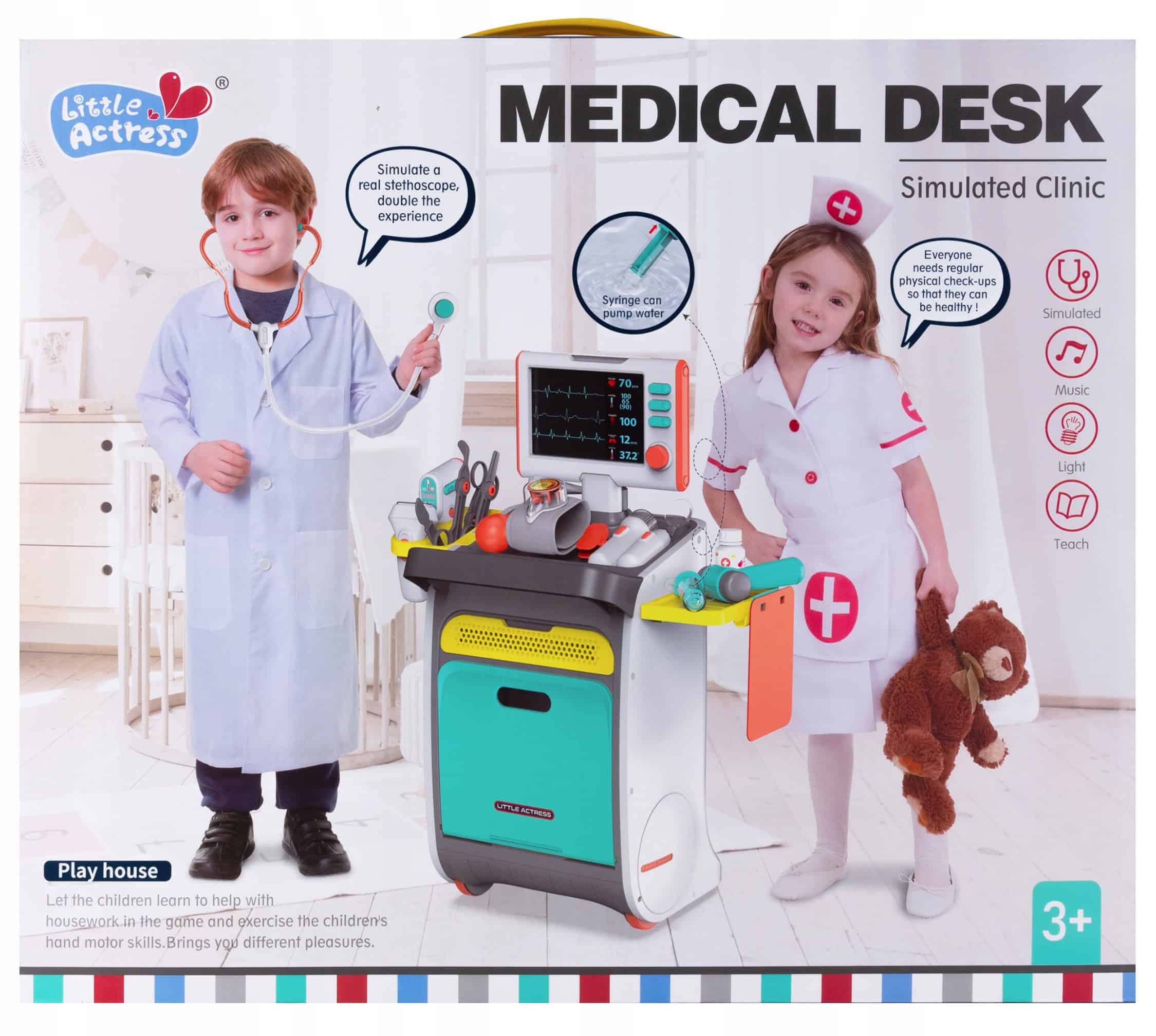 O trusa medicala pentru a te juca de-a doctorul sau de-a asistenta. Jucaria are echipamente realiste care imita dispozitive reale: stetoscopul reproduce sunetul batailor inimii si se aprinde, lanterna, capul cu ultrasunete si oglinda dentara au o lumina de fundal, termometrul emite un sunet de masurare a temperaturii, se aprinde si are posibilitatea de a seta temperatura corpului. Caruciorul reproduce sunete realiste ale aparatelor de monitorizare a vietii. Include: 3 x foarfece Bisturiu Stetoscop (alimentat cu 2xLR44 – furnizat) Bloc de date medicale 5 x imagini cu raze X 1x tabla de monitorizare a semnelor vitale Ciocan de medic Seringa Cap de ultrasunete Monitor de tensiune arteriala Oglinda dentara (alimentata de 2xLR44 – furnizata) Termometru (alimentat de 3xLR44 – furnizat) Lanterna de diagnosticare (alimentata de 2xLR44 – furnizata) Recipient pentru medicamente Clips Dimensiuni carucior (L/D/H): 42x30x65cm