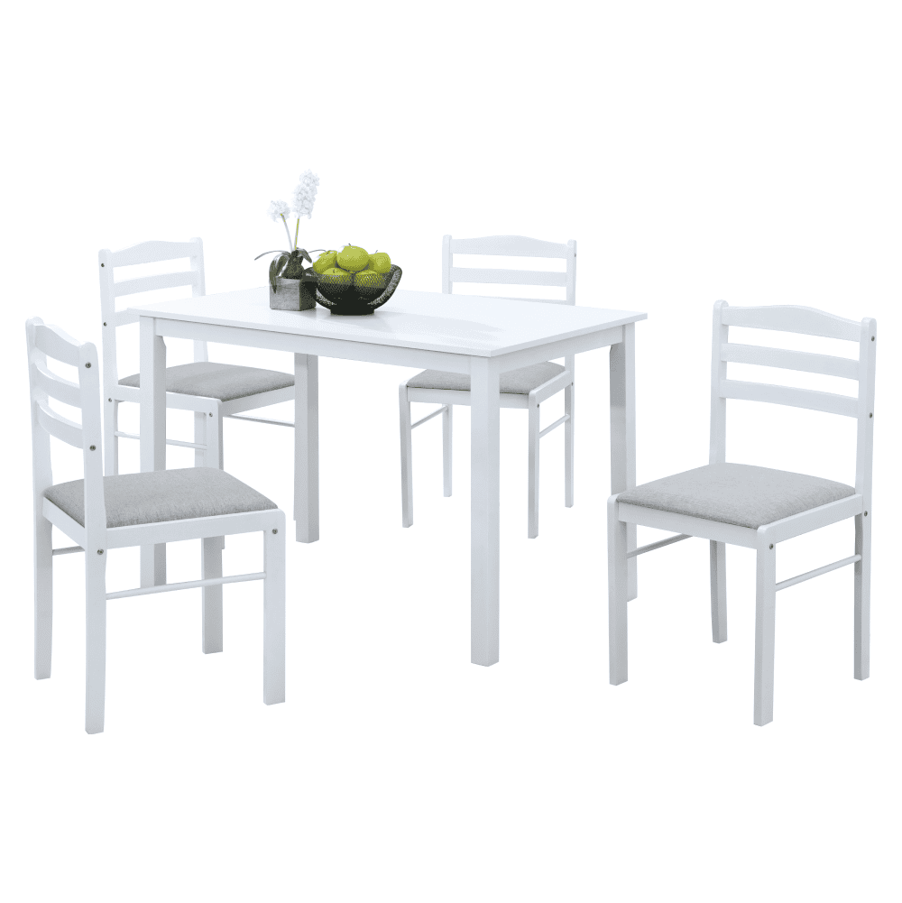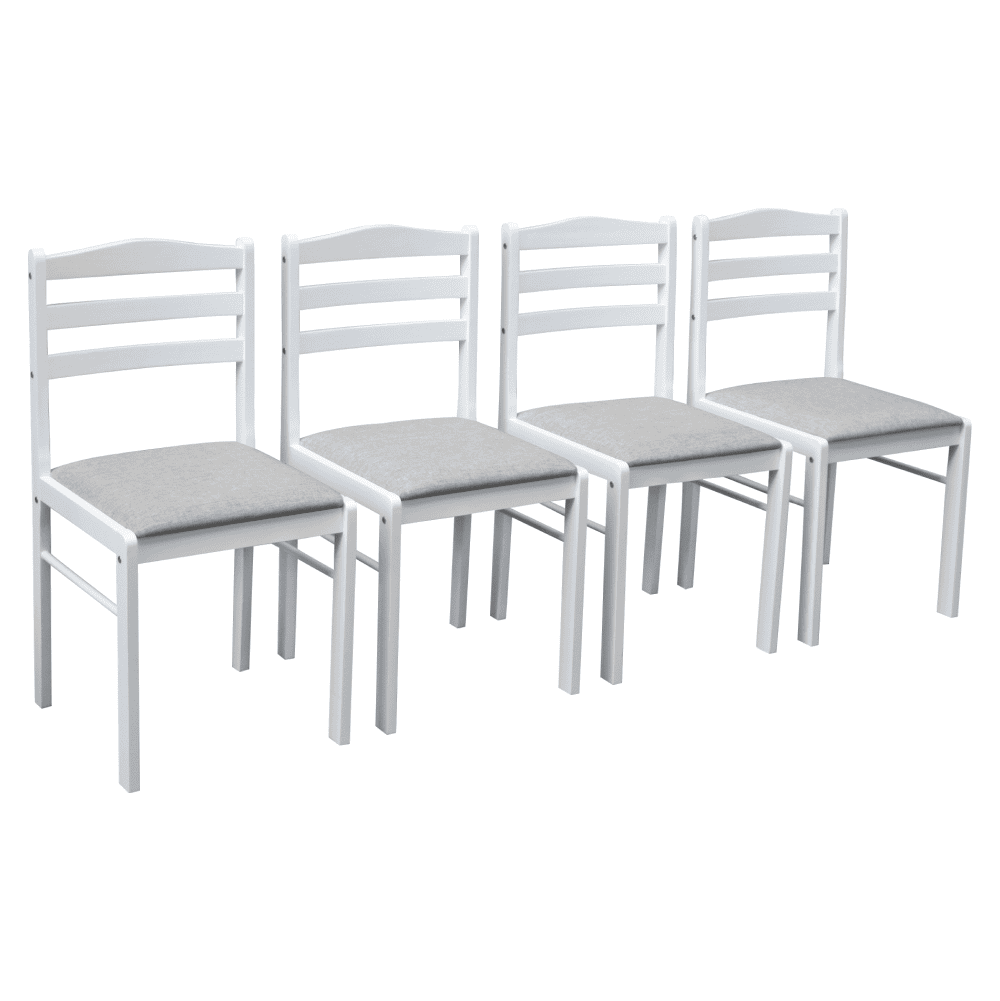 Material: MDF/furnir/ţesătură Rezistenţa ţesăturii la frecare conform testului Martindale: 15 000-20 000 de cicluri de frecare Culoare: alb/gri bej Dimensiuni masă (Lxlxh): 110,5×70,5×76 cm Grosime blat masă: 1,6 cm Dimensiuni scaun (Lxlxh): 40,6x45x84,6 cm Înălţimea scaunului: 46,5 cm Adâncimea părţii de şezut: 41,5 cm Portanţă masă: 100 kg Portanţă scaun: 100 kg Set de sufragerie 1 masă 4 scaune Pentru 4 persoane Livrat dezasamblat