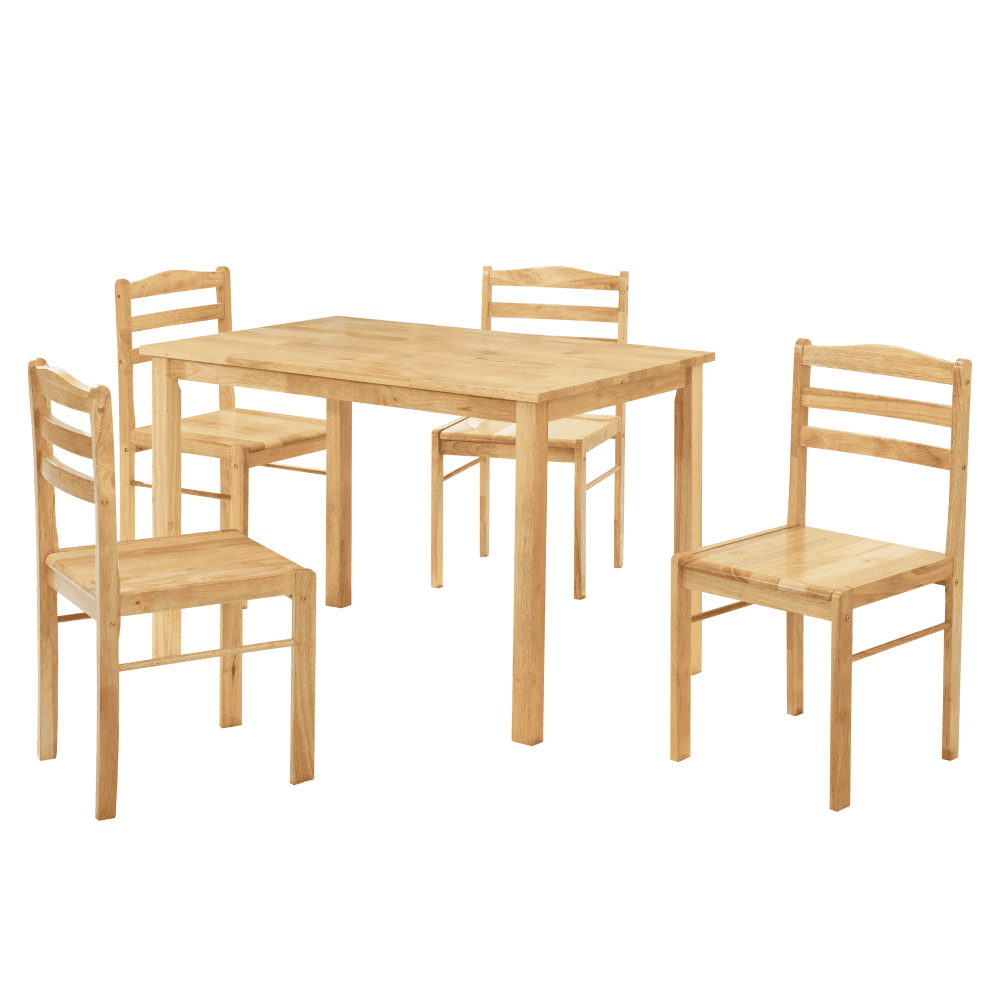 Material: lemn masiv Culoare: natural Dimensiuni masă (Lxlxh): 110×70,3×76 cm Grosime blat masă: 2 cm Dimensiuni scaun (Lxlxh): 40,5×45,5×84,6 cm Înălţimea scaunului: 43,4 cm Adâncimea părţii de şezut: 42 cm Portanţă masă: 100 kg Portanţă scaun: 100 kg Set de sufragerie 1 masă 4 scaune Pentru 4 persoane Livrat dezasamblat