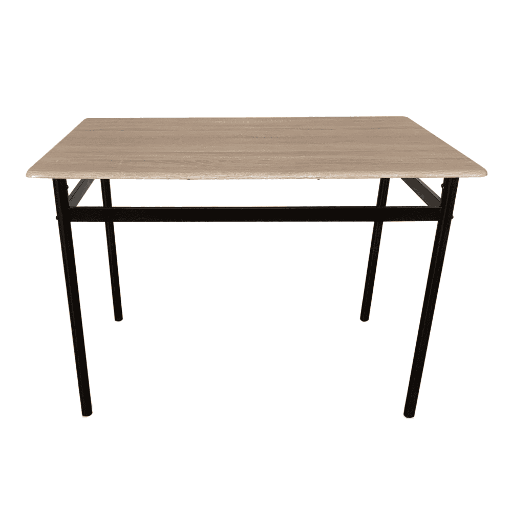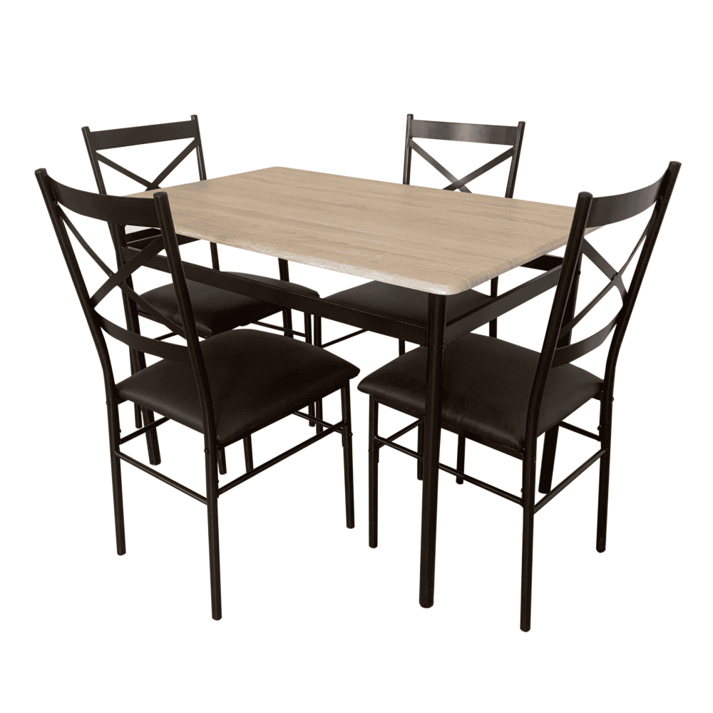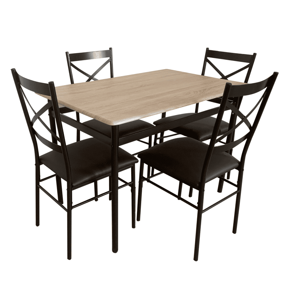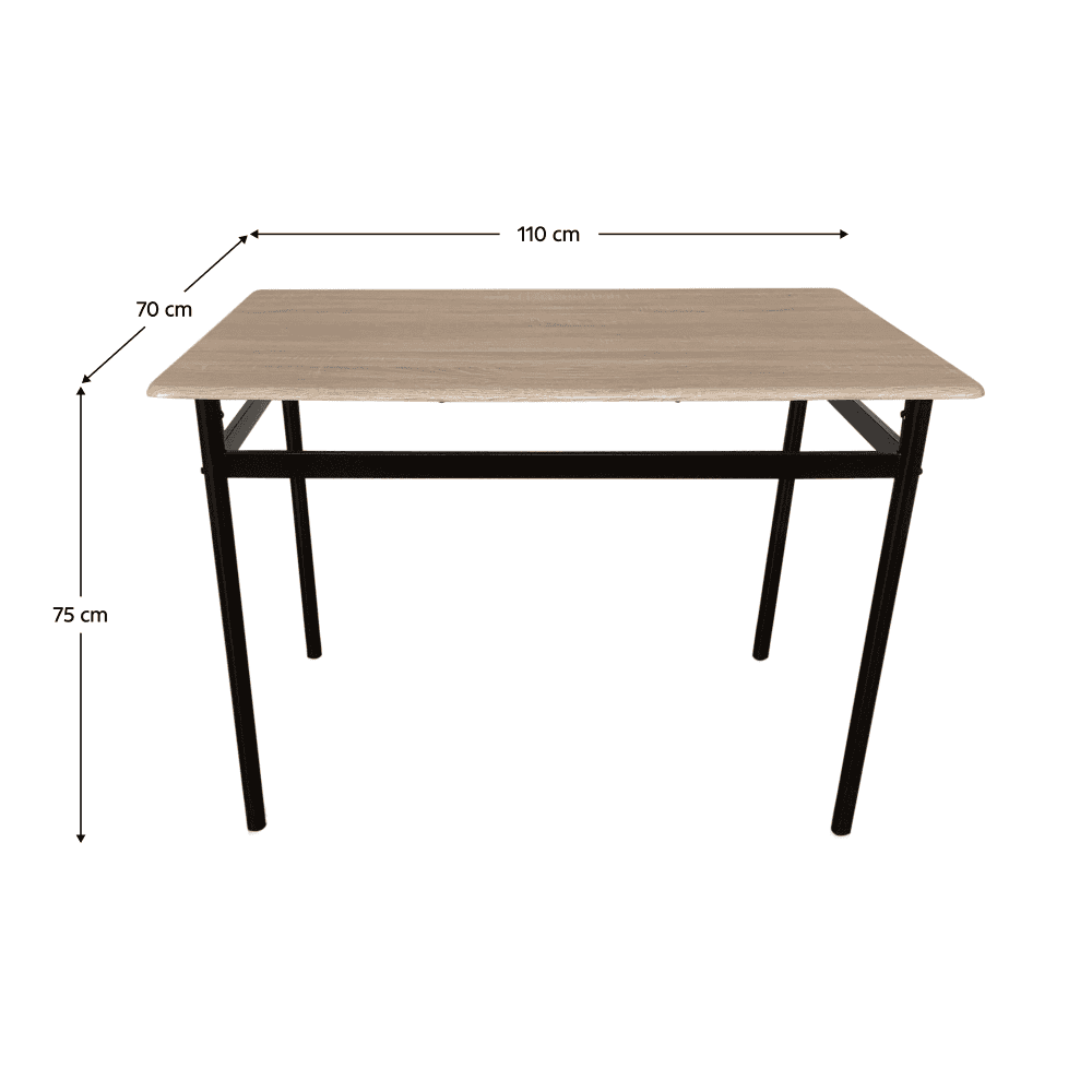 Materialul mesei: MDF cu folie de PVC / metal Culoare: stejar Sonoma / neagră Material scaun: metal / piele ecologică Culoare: neagră / maro Dimensiuni masă (LxAxÎ): 110x70x75 cm Grosimea blatului de masă: 1,5 cm Dimensiuni scaun (LxAxÎ): 40x46x86 cm Înălţime scaun: 41,5 cm Adâncimea zonei pentru şezut: 39,5 cm Lăţime spătar: 38,5 cm Înălţime spătar: 42,8 cm Capacitate de încărcare a mesei: 50 kg Capacitate de susţinere a scaunului: 90 kg Set 1+4 Pentru 4 persoane Livrat dezasamblat