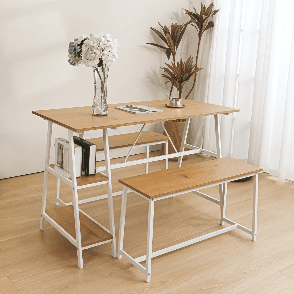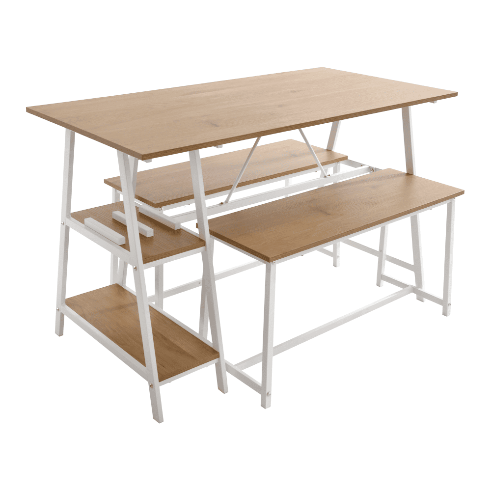 Material: MDF laminat / metal Culoare: stejar / alb Dimensiuni masă (LxAxÎ): 120x60x75 cm Dimensiunile băncii (LxAxÎ): 85x30x45 cm Înălţime scaun: 45 cm Grosimea materialului plăcii superioare: 1,5 cm Capacitate de încărcare a mesei: 50 kg Capacitate de susţinere a băncii: 100 kg Greutate: 28,2 kg Set de 3 piese Masă 2 bănci Cu rafturi Cu suport pentru sticle Cu suport pentru pahare Livrat dezasamblat