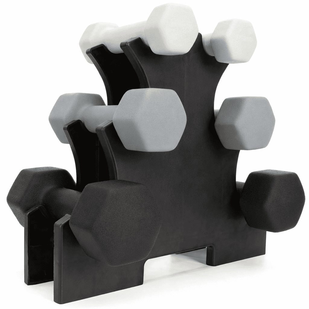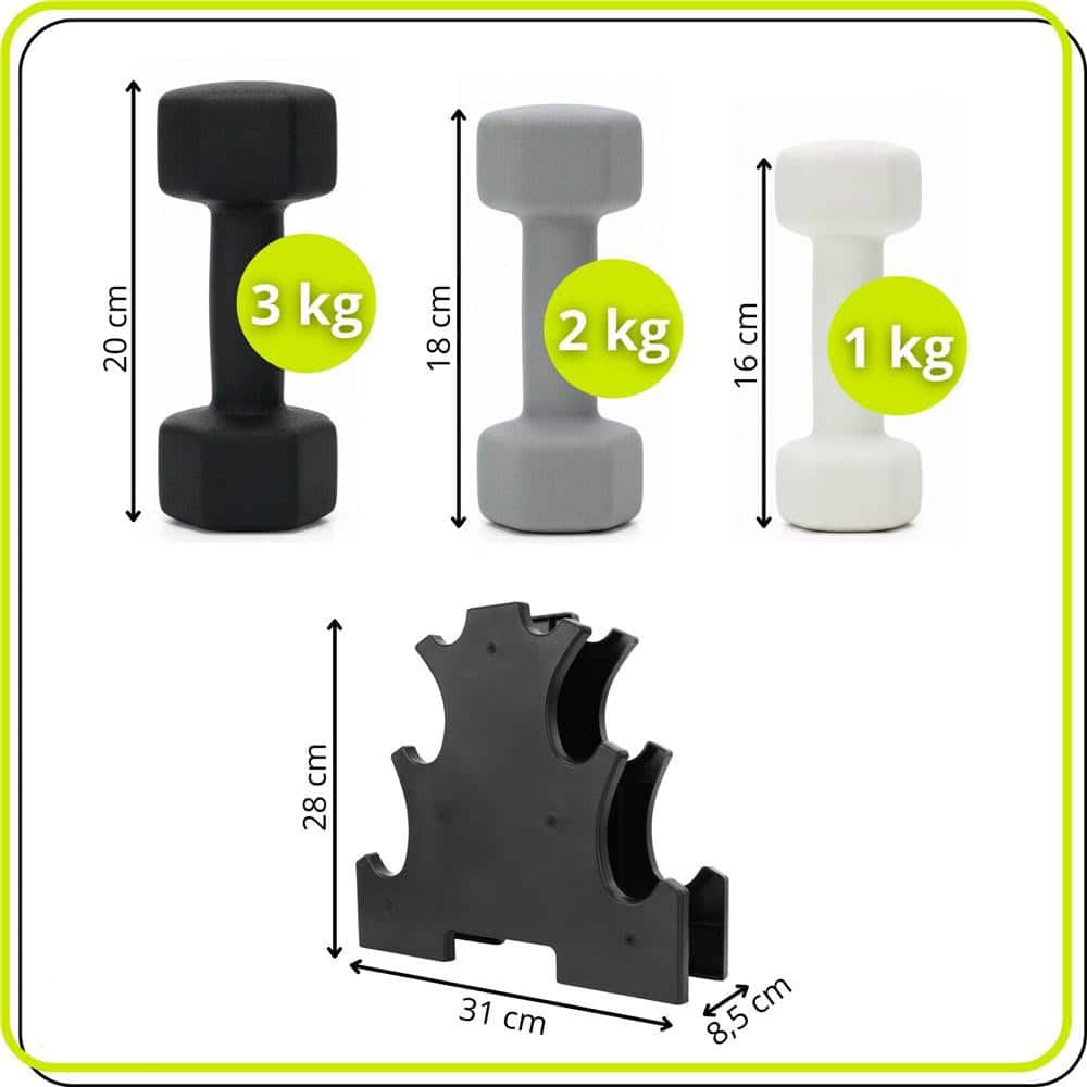 Set gantere din fonta cu invelis neopren, 12 kg cu suport, capete hexagonale, 2×1 kg 2×2 kg 2×3 kg, multicolor Mob360