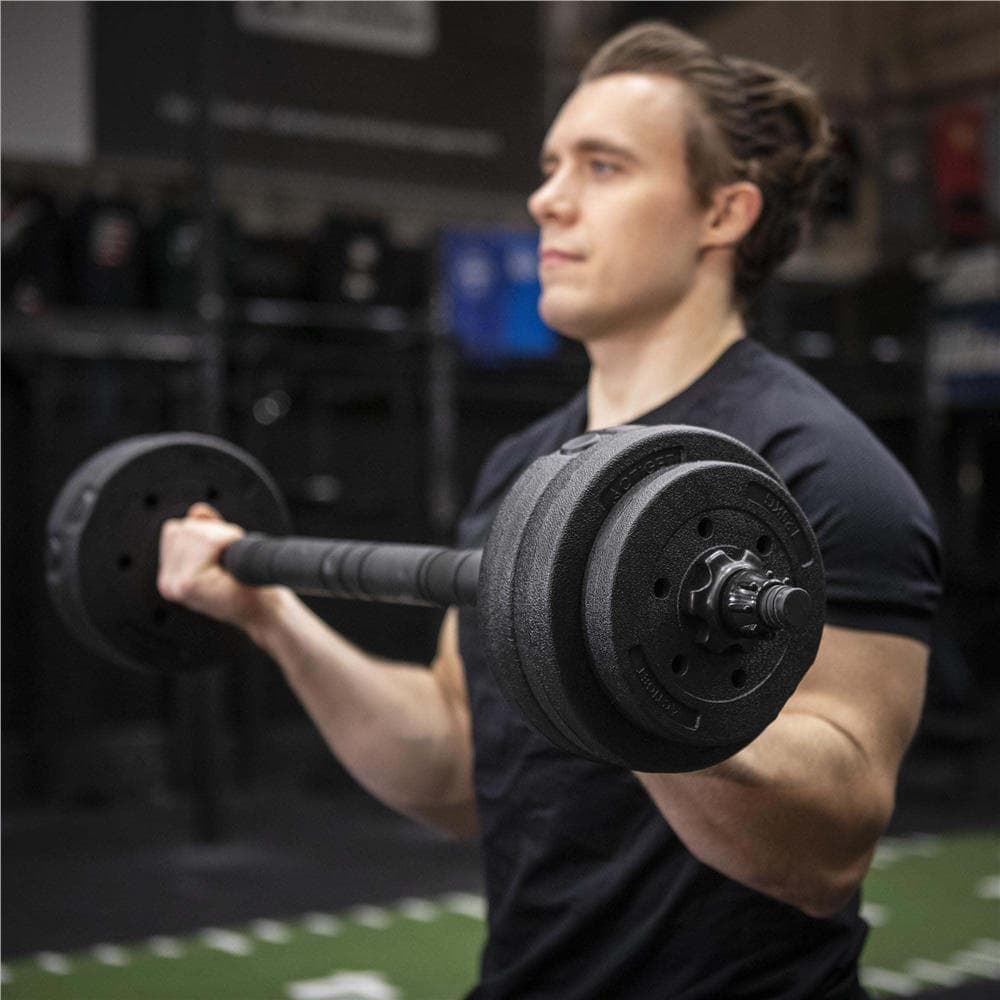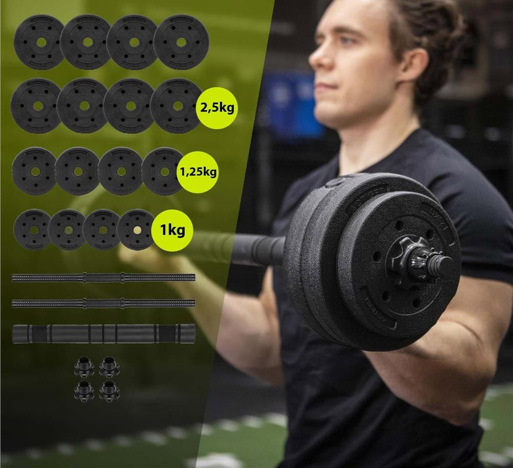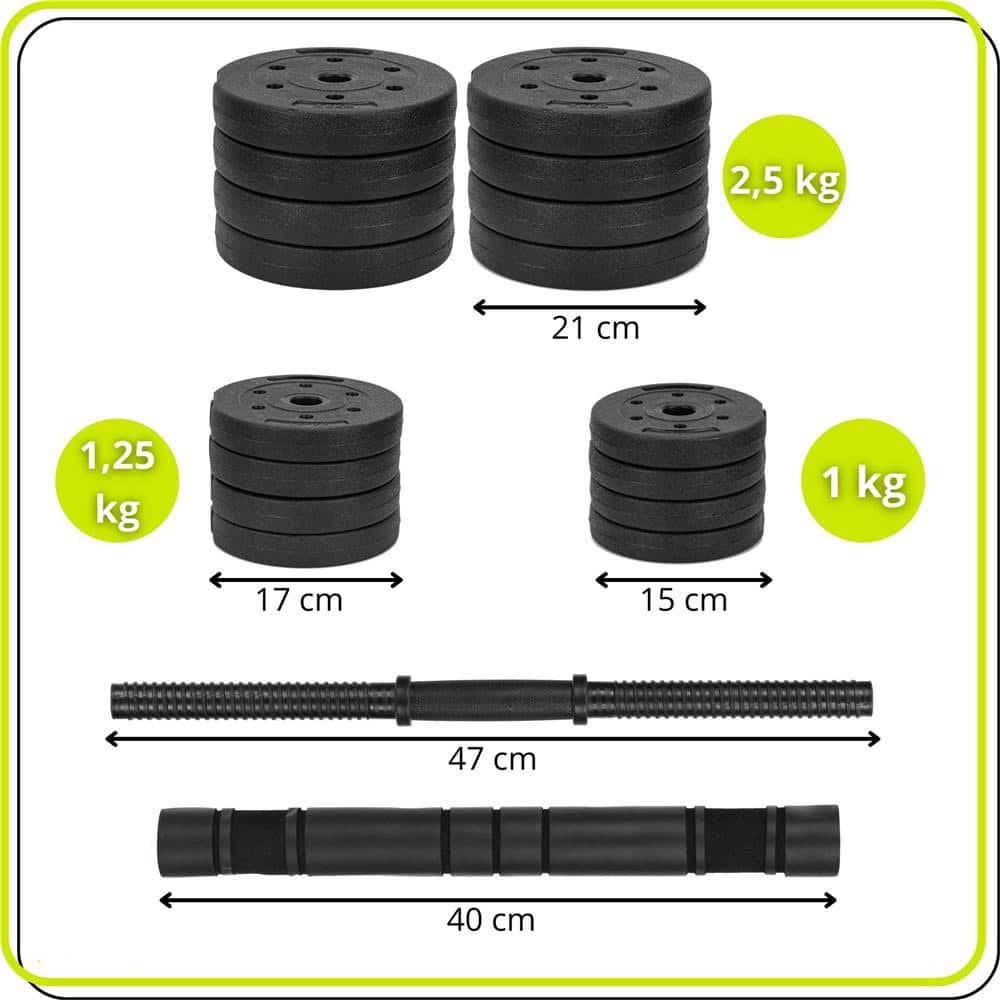 Specificatii tehnice: Material discuri: exterior PP, umplutura ciment Material bare: metal, PP Material conector: metal, spuma Culoare: negru Greutate totala set: 30 kg Lungime gantera: 47 cm Lungime bara montata: aprox. 100 cm Continut pachet: 8 x discuri 2,5 kg 4 x discuri 1,25 kg 4 x discuri 1 kg 2 x gantere 4 x coliere filetate 1 x conector pentru transformare in bara Scurta descriere: Setul de 30 kg este potrivit pentru antrenamente progresive acasa. Discurile au exterior din PP pentru protectie si reducerea zgomotului, iar interiorul este realizat din ciment pentru stabilitate. Manerele antialunecare asigura priza sigura in timpul exercitiilor. Sistemul filetat mentine greutatile fixate ferm. Conectorul inclus permite unirea celor doua gantere intr-o bara pentru exercitii precum genuflexiuni, impins sau indreptari. Caracteristici principale: Greutate totala 30 kg pentru antrenament variat Discuri multiple pentru reglarea intensitatii Manere antialunecare pentru control optim Coliere filetate pentru fixare sigura Conector pentru transformare rapida in bara Structura rezistenta cu interior din ciment Intretinere usoara cu laveta umeda