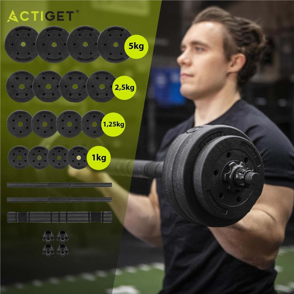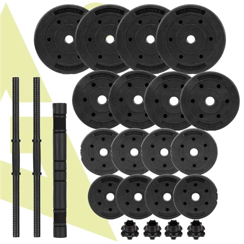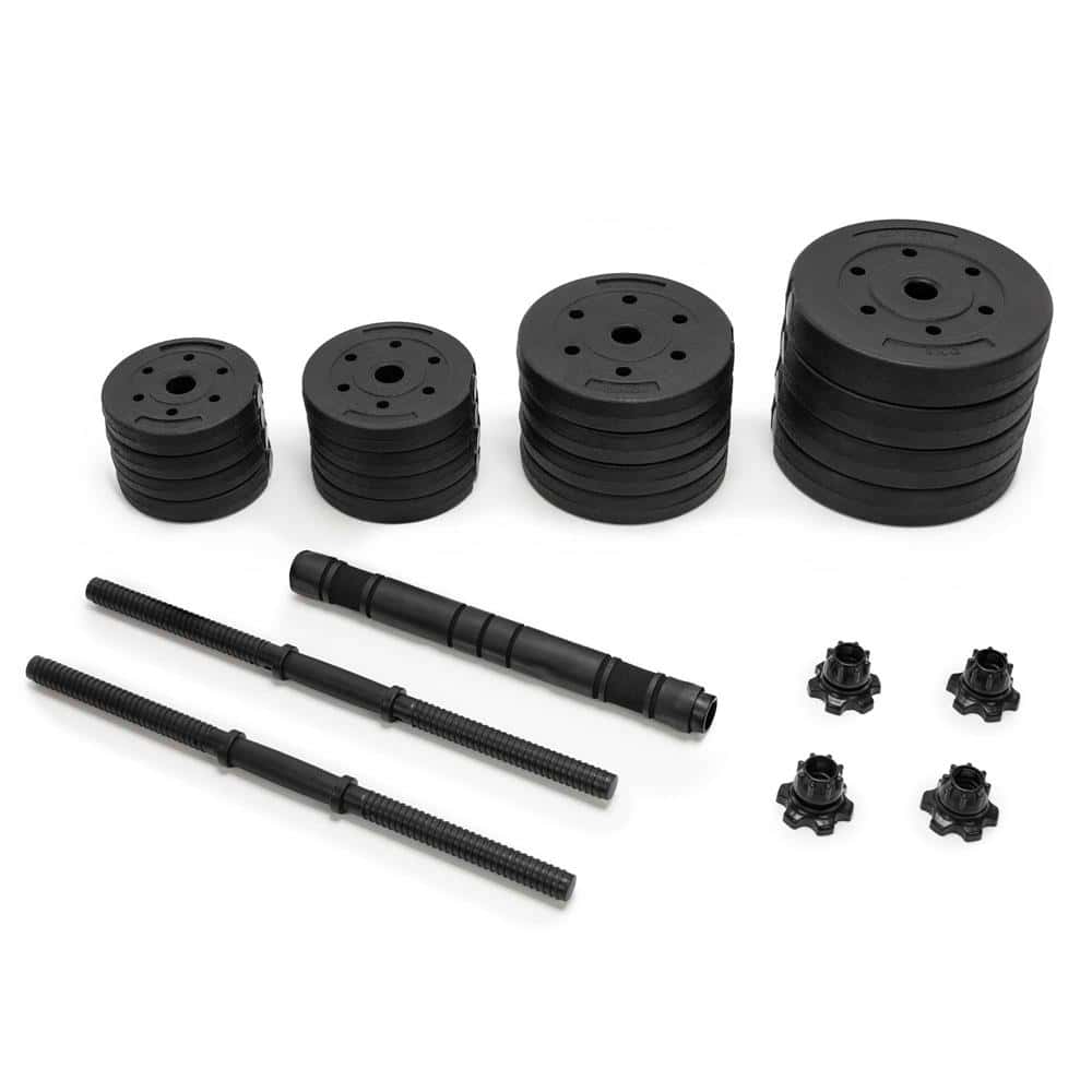 - Continut pachet: 4 x discuri 5 kg 4 x discuri 2,5 kg 4 x discuri 1,25 kg 4 x 1 kg 2 x gantere 4 x coliere filetate 1 x conector pentru transformare in bara