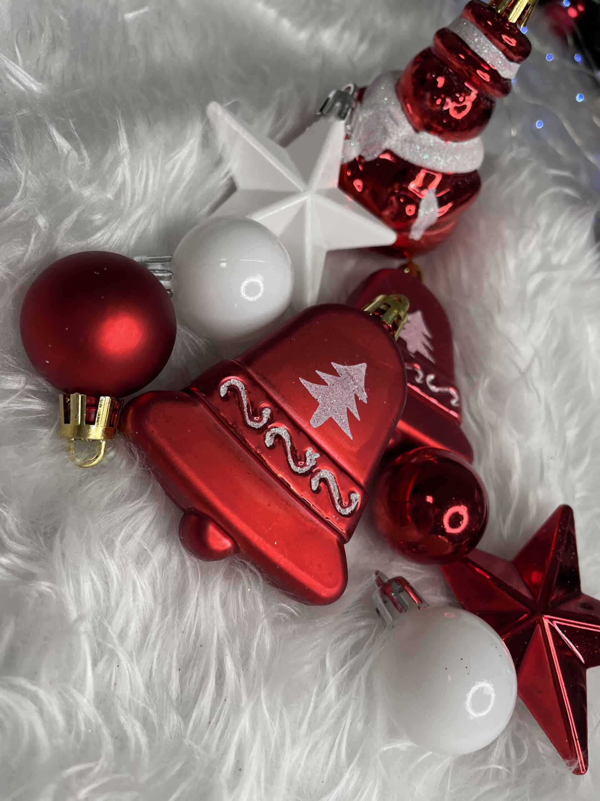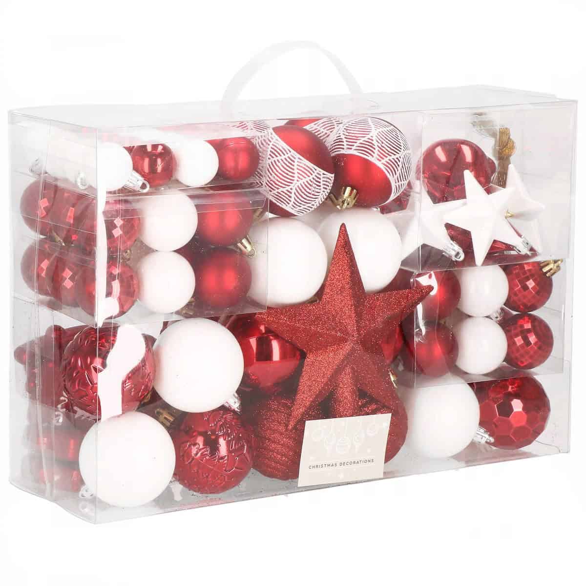 Set globuri si decoratiuni de Craciun, 105 piese, diverse dimensiuni, alb rosu Mob360